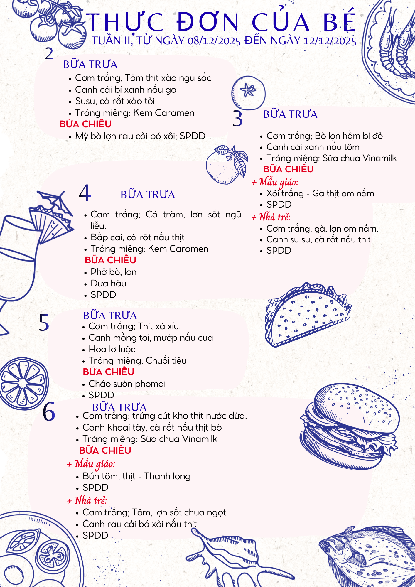 Nhà trường xin gửi tới Quý phụ huynh thực đơn tuần II, từ ngày 08/12/2025 đến 12/12/2025, với các bữa ăn được xây dựng khoa học, đa dạng và đảm bảo cân đối dinh dưỡng cho trẻ. Các món ăn trong tuần được lựa chọn kỹ lưỡng, phù hợp từng độ tuổi, giúp trẻ ăn ngon – khỏe mạnh – phát triển toàn diện. Bộ phận nuôi dưỡng luôn tuân thủ quy trình vệ sinh an toàn thực phẩm, đảm bảo chất lượng trong từng bữa ăn của bé. Kính mời Quý phụ huynh theo dõi thực đơn chi tiết trong ảnh đính kèm để đồng hành cùng nhà trường trong việc chăm sóc dinh dưỡng cho các con.