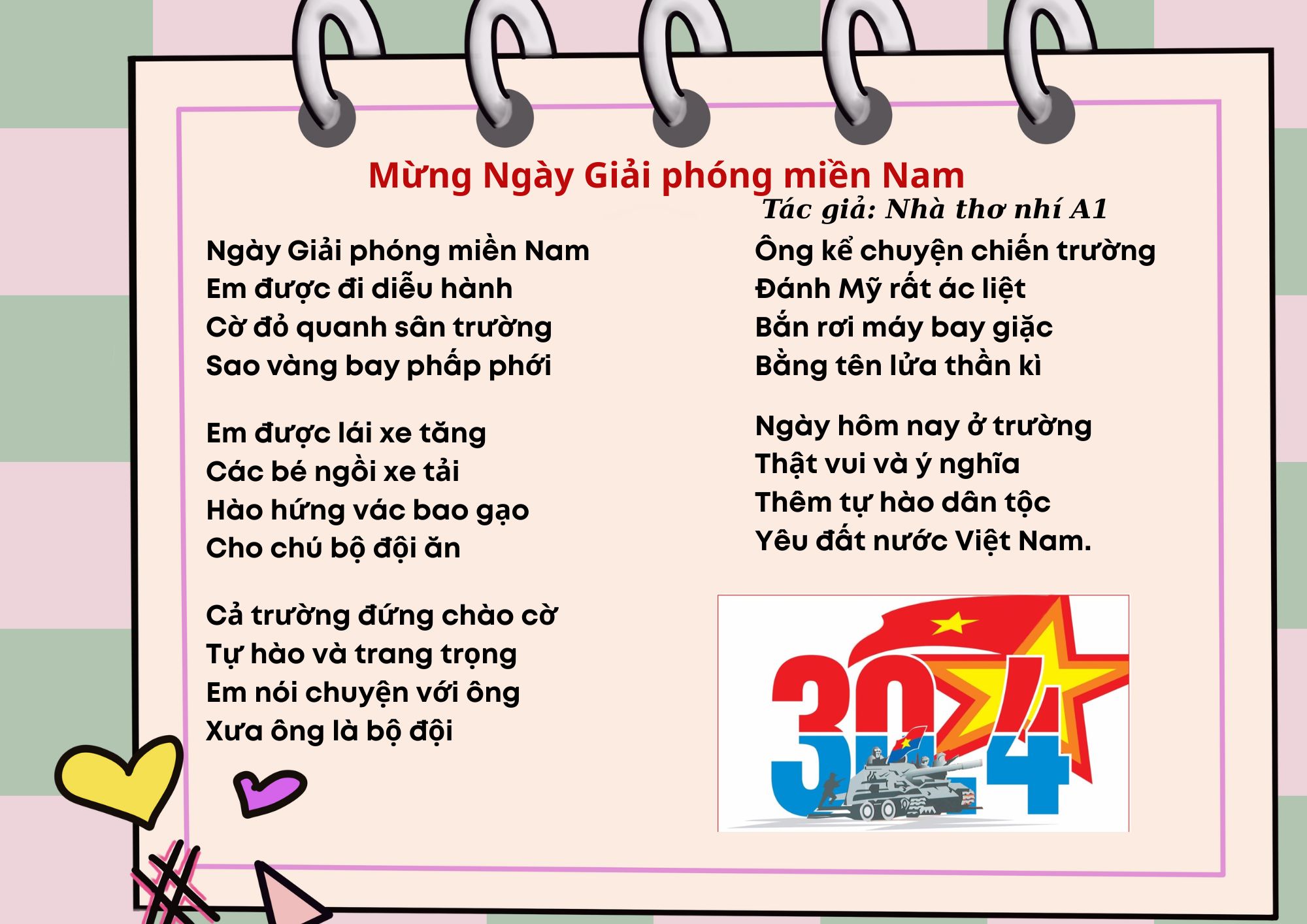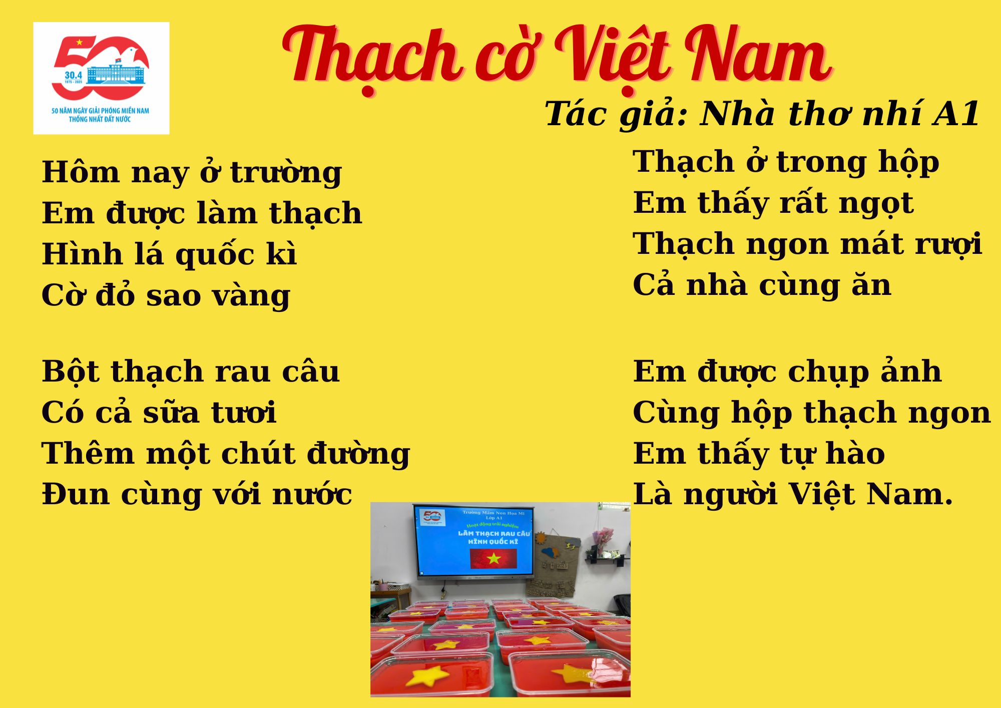 Với sự hướng dẫn, khơi gợi cảm xúc từ cô giáo, bằng những lời thơ trong sáng, giản dị nhưng đầy tự hào, các bé đã cùng nhau tạo nên chùm thơ gồm hai bài: "Mừng ngày giải phóng miền Nam" và "Thạch cờ Việt Nam".