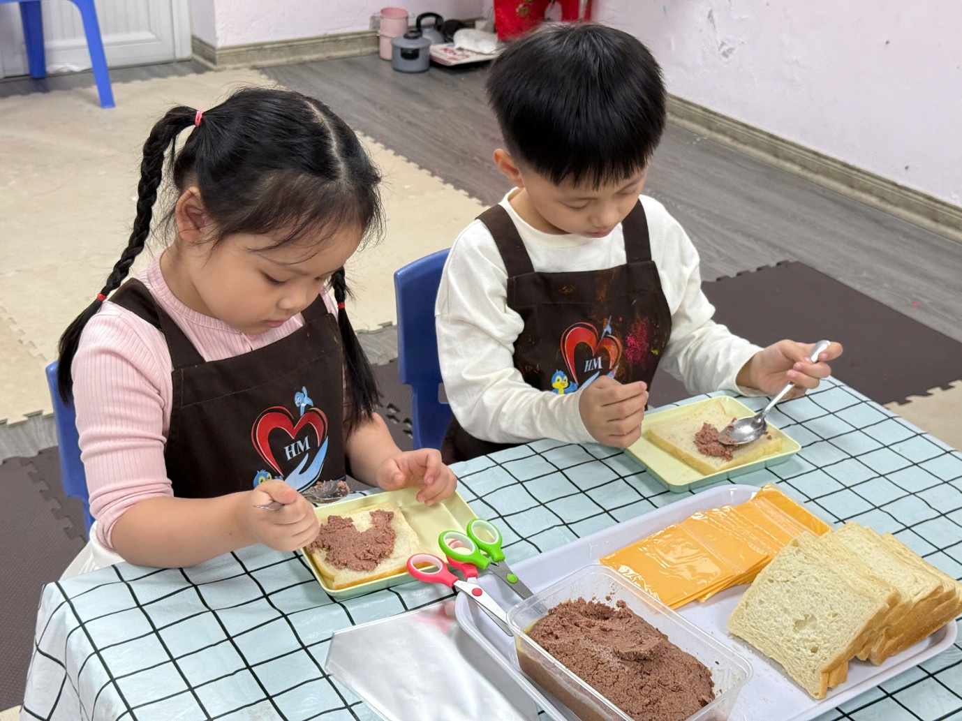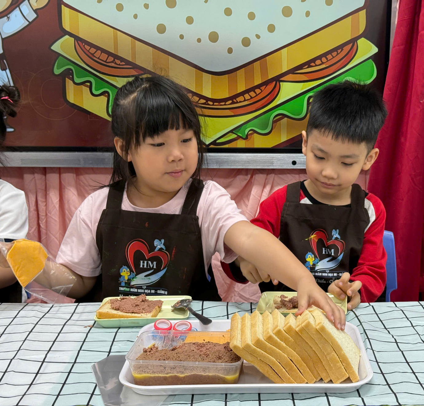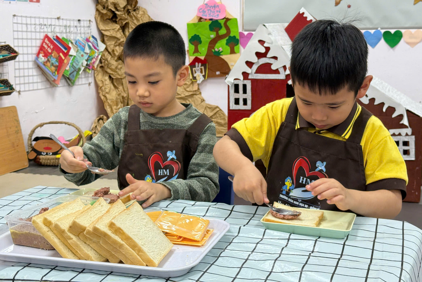 Ngay từ đầu hoạt động, các bé đã rất thích thú khi được hóa thân thành những “đầu bếp nhí”. Dưới sự hướng dẫn nhẹ nhàng, tận tình của cô giáo, các con được làm quen với các nguyên liệu gần gũi, an toàn như bánh mì, pate, phô mai. Đồng thời, trẻ cũng được nhắc nhở và thực hành rửa tay sạch sẽ trước khi chế biến, hình thành thói quen giữ gìn vệ sinh cá nhân.