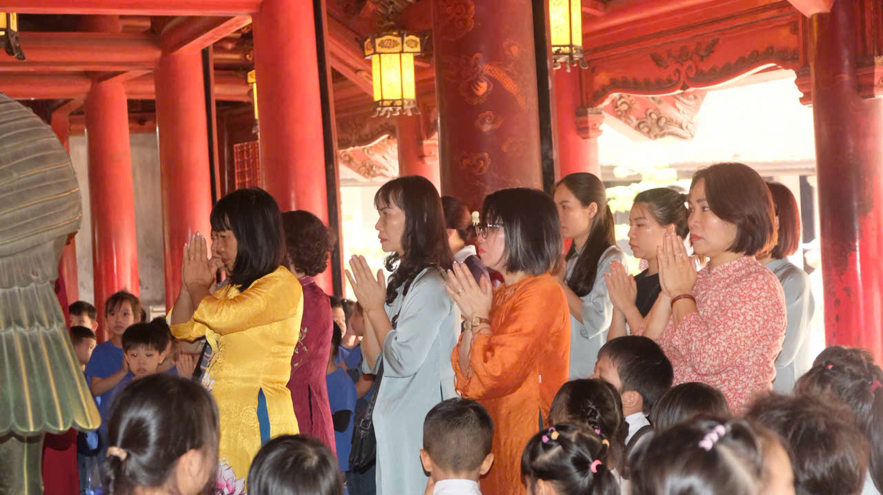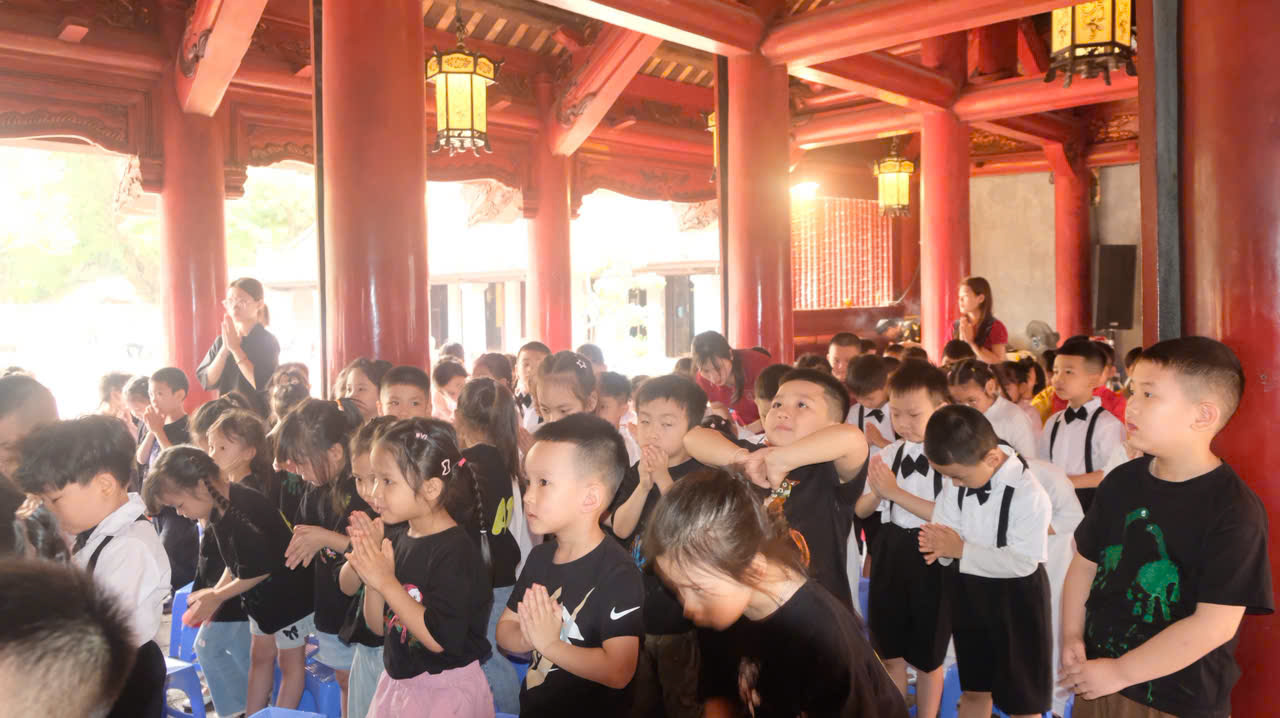Tại khu di tích, các cô cùng các con đã tham dự lễ dâng hương trang trọng. Trong không gian cổ kính, linh thiêng, các con đứng ngay ngắn, lắng nghe và thể hiện sự thành kính theo cách rất riêng của mình – có thể còn vụng về, nhưng lại vô cùng đáng yêu và chân thành. Đây chính là những khoảnh khắc đầu tiên giúp các con cảm nhận được giá trị của truyền thống, của đạo lý “uống nước nhớ nguồn”.