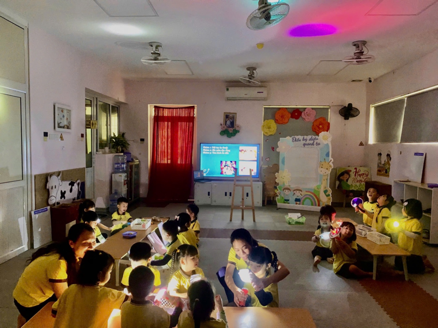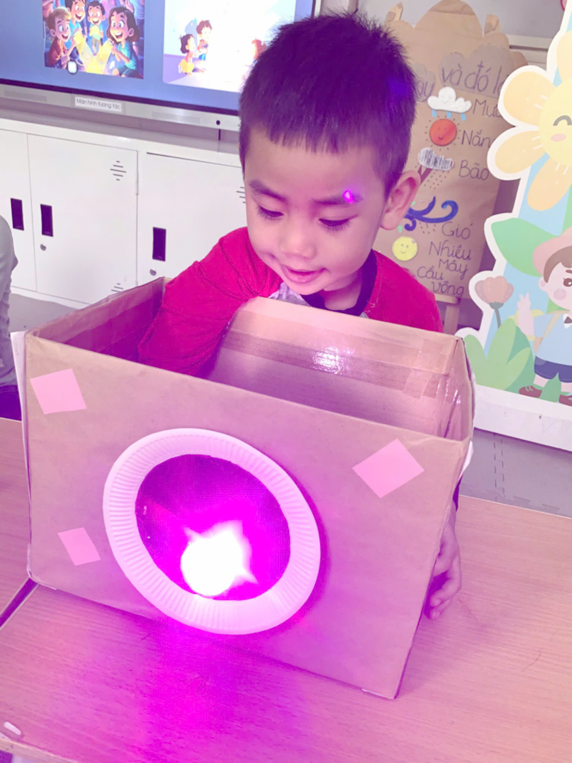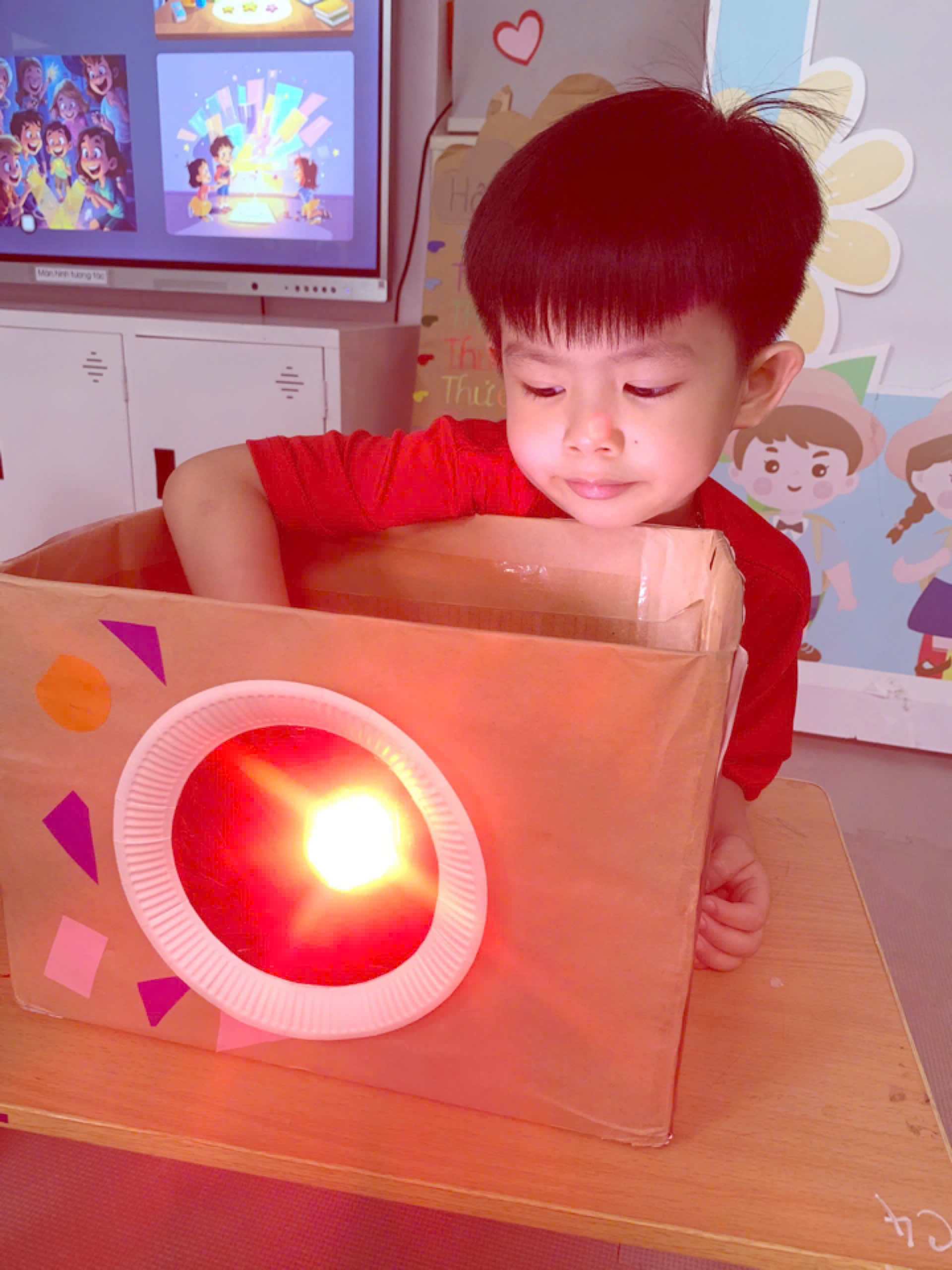 Không dừng lại ở việc khám phá, các con còn được tự tay thiết kế và chế tạo những chiếc hộp đèn màu từ các vật liệu tái chế. Sau khi hoàn thành, cả lớp đã có một "bữa tiệc ánh sáng" bùng nổ. Trong ánh đèn màu lung linh do chính mình tạo ra, các con đã cùng nhau nhảy múa, vui đùa, tạo nên một không gian nghệ thuật đầy cảm xúc.