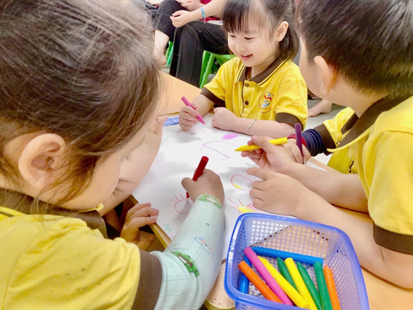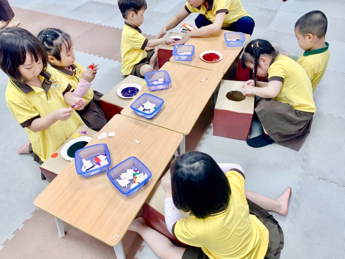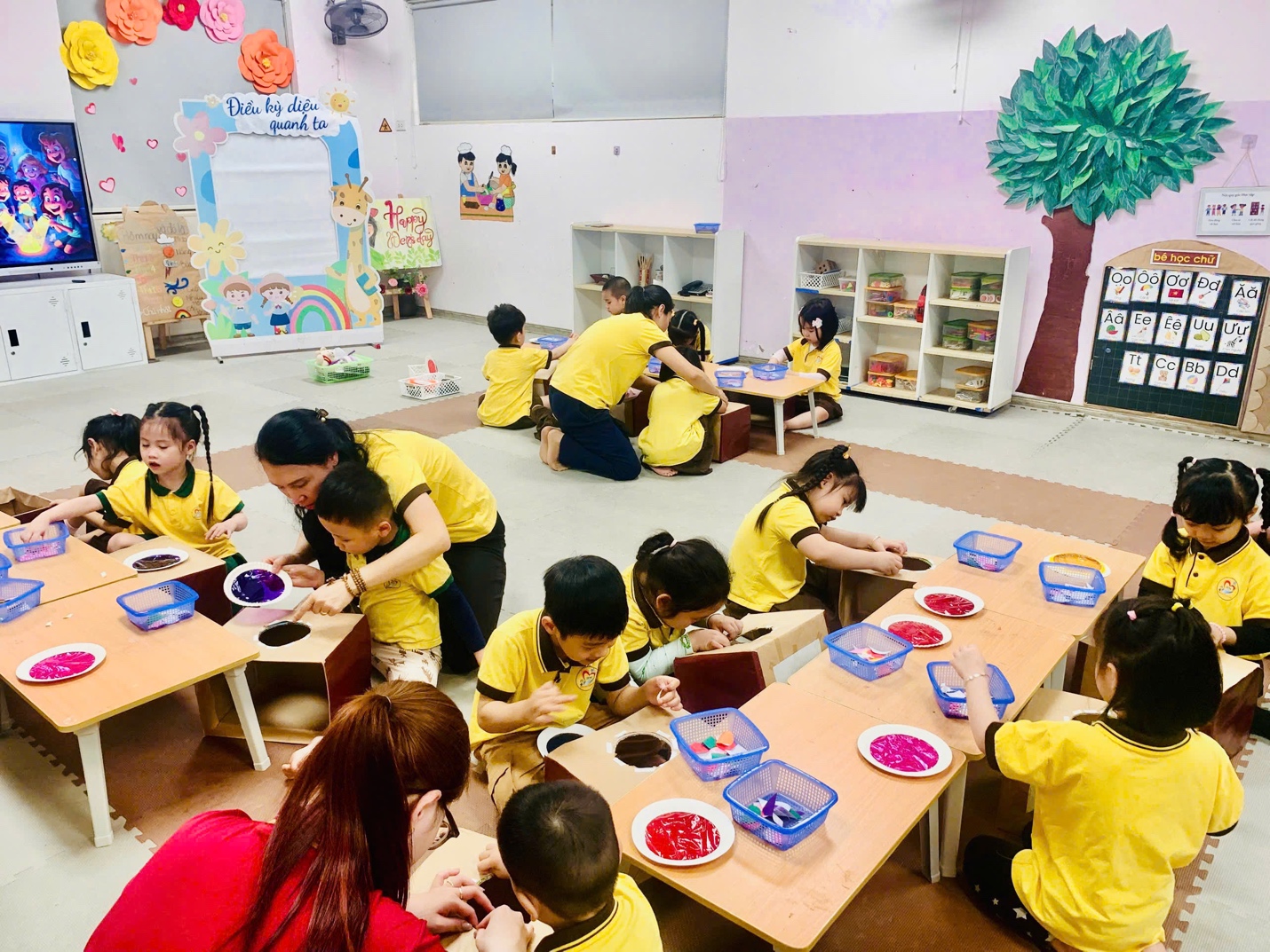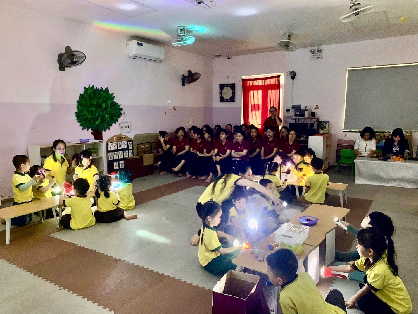 Không dừng lại ở việc khám phá, các con còn được tự tay thiết kế và chế tạo những chiếc hộp đèn màu từ các vật liệu tái chế. Sau khi hoàn thành, cả lớp đã có một "bữa tiệc ánh sáng" bùng nổ. Trong ánh đèn màu lung linh do chính mình tạo ra, các con đã cùng nhau nhảy múa, vui đùa, tạo nên một không gian nghệ thuật đầy cảm xúc.