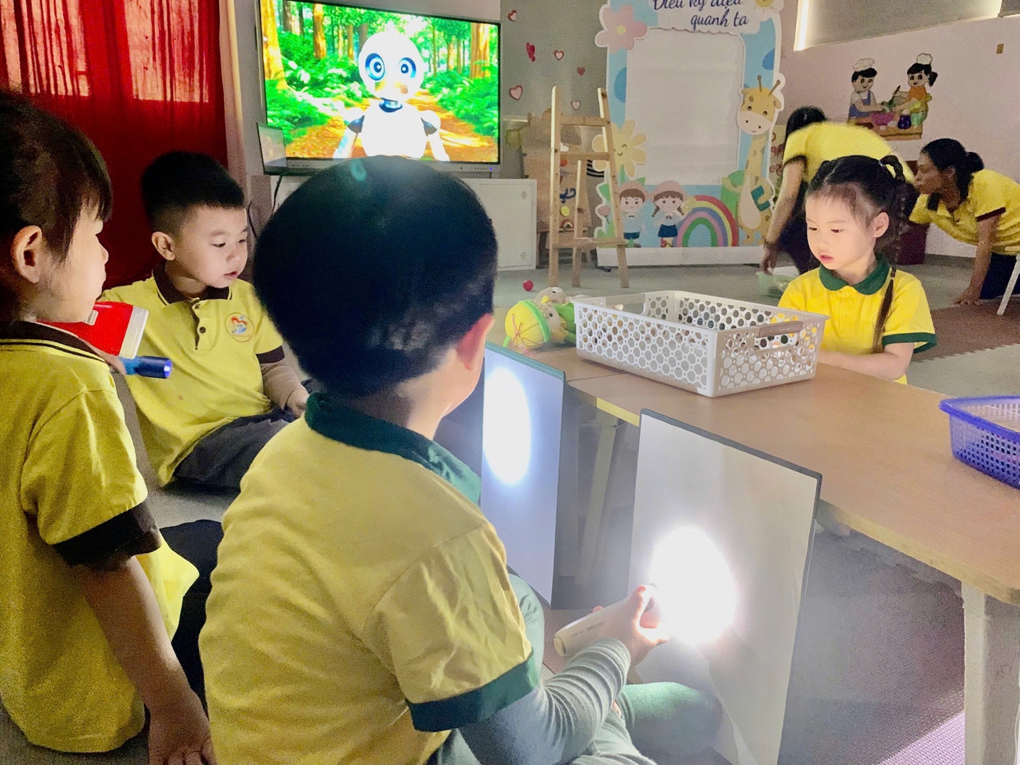 Hôm nay, không gian lớp B2 bỗng trở nên huyền ảo hơn bao giờ hết. Các con đã có một giờ khám phá đầy phấn khích với chủ đề: "Sự kỳ diệu của ánh sáng đèn pin". Không chỉ là quan sát, các bạn nhỏ đã thực sự được "chạm" và "điều khiển" ánh sáng qua những hoạt động cực kỳ thú vị: