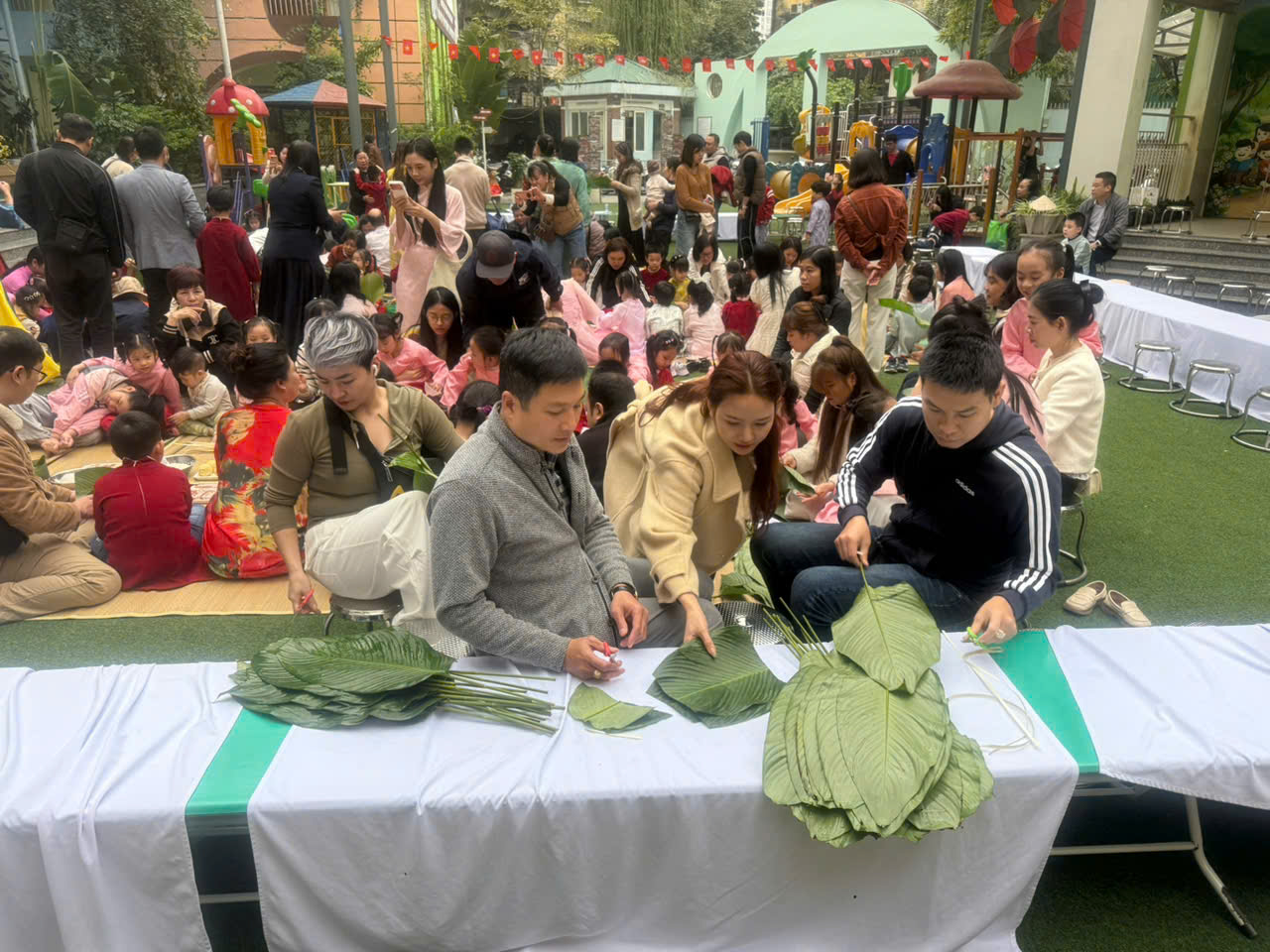 Ngay từ sáng sớm, sân trường đã ngập tràn sắc xuân với lá dong xanh mướt, nếp trắng tinh, đỗ vàng ươm và những dải lạt mềm được chuẩn bị sẵn sàng. Trong tiếng cười nói rộn ràng, các bé lớp A1 háo hức khoác lên mình những chiếc tạp dề nhỏ xinh, chăm chú lắng nghe cô giáo hướng dẫn từng bước gói bánh.