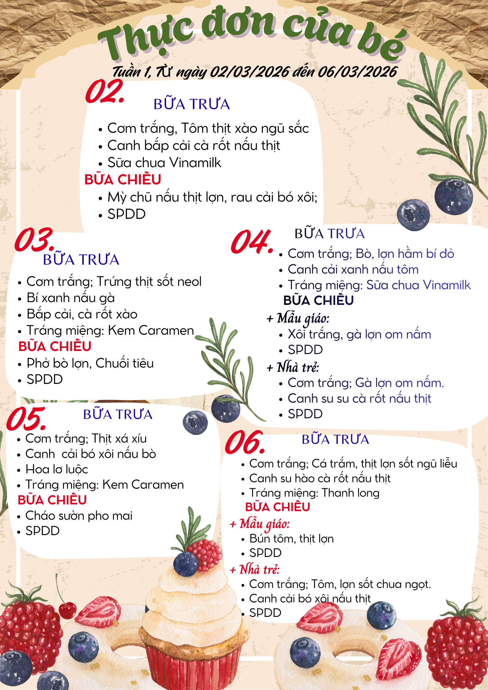 Thực đơn tuần 1 (từ ngày 02/03 đến 06/03/2026) của các bé trường Mầm non Họa Mi