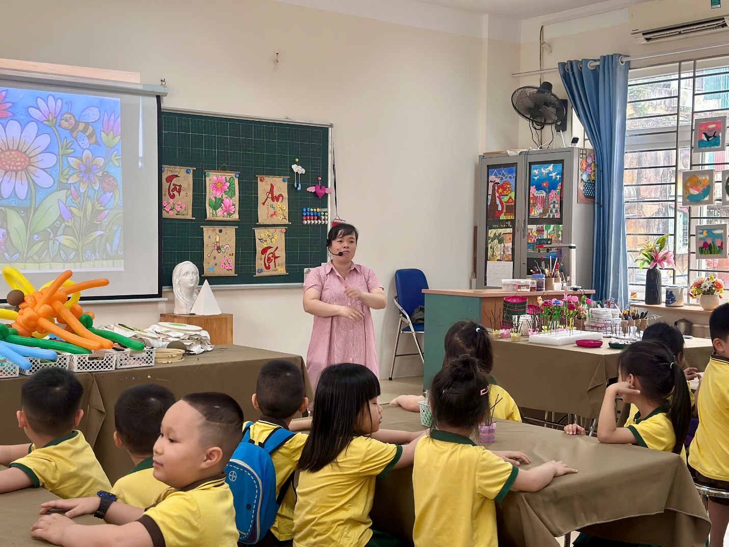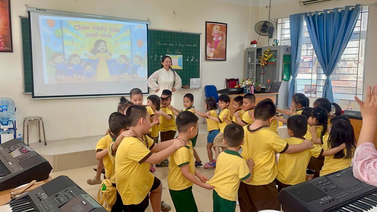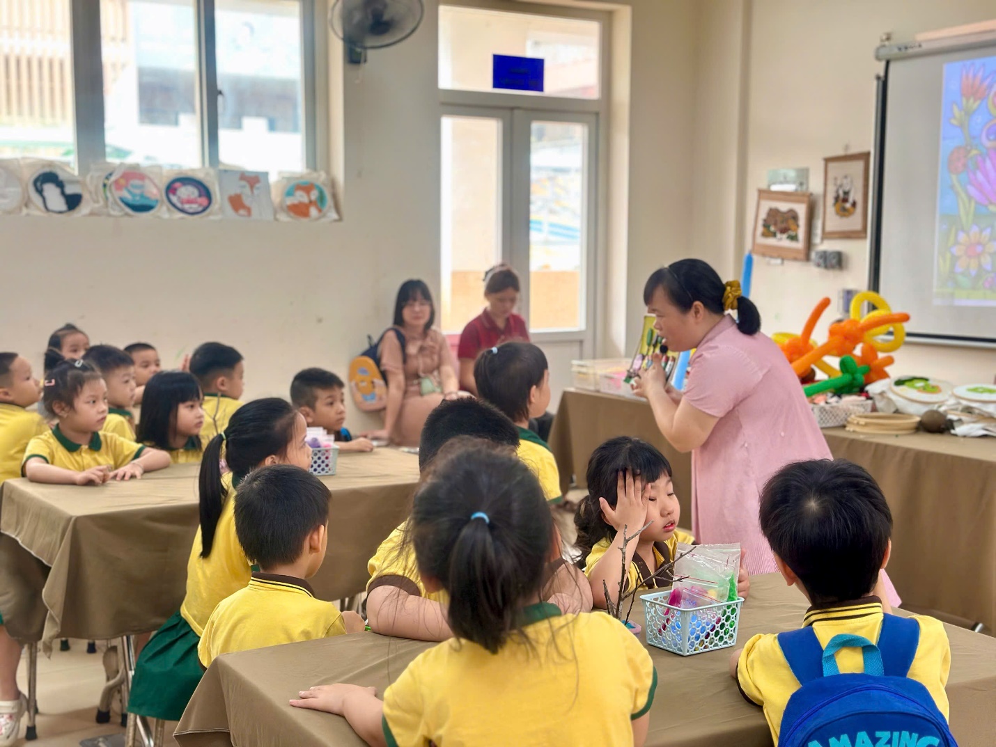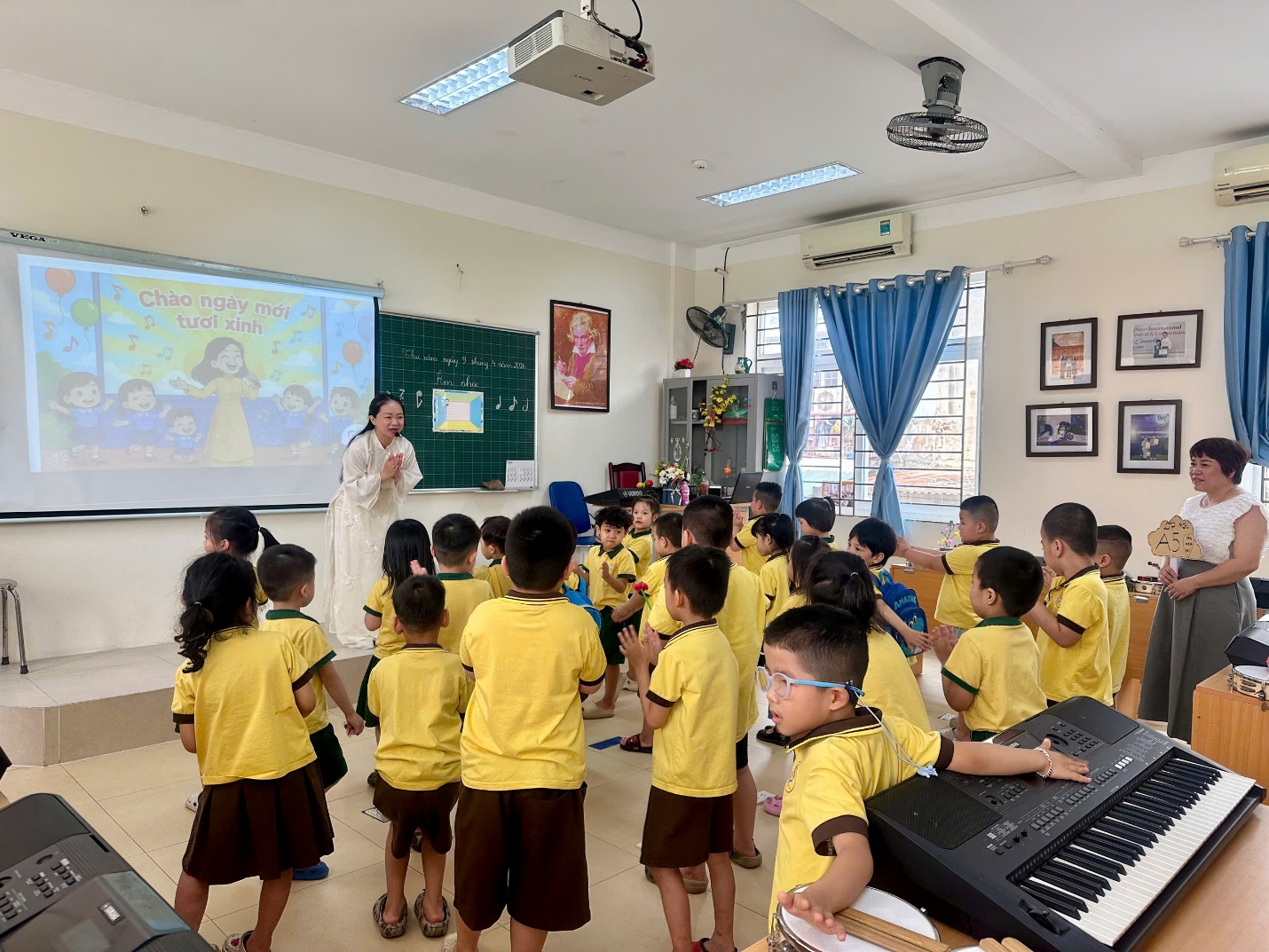 Không khí càng thêm sôi động khi các con bước vào phòng Âm nhạc, được tự tay trải nghiệm các nhạc cụ và cùng nhau nhảy múa tập thể. Tiếng cười giòn tan vang lên khắp căn phòng, tạo nên những khoảnh khắc thật đáng nhớ.