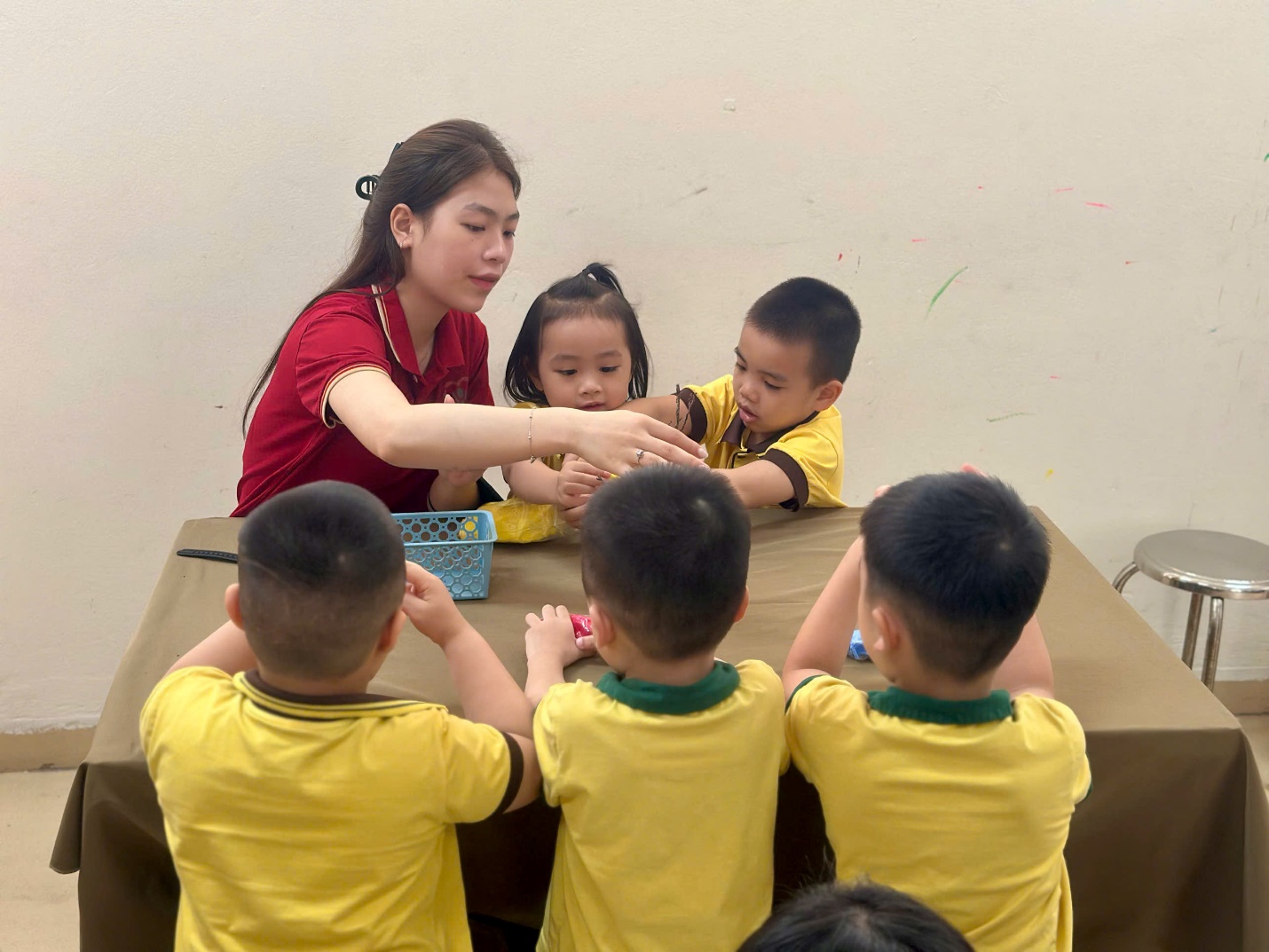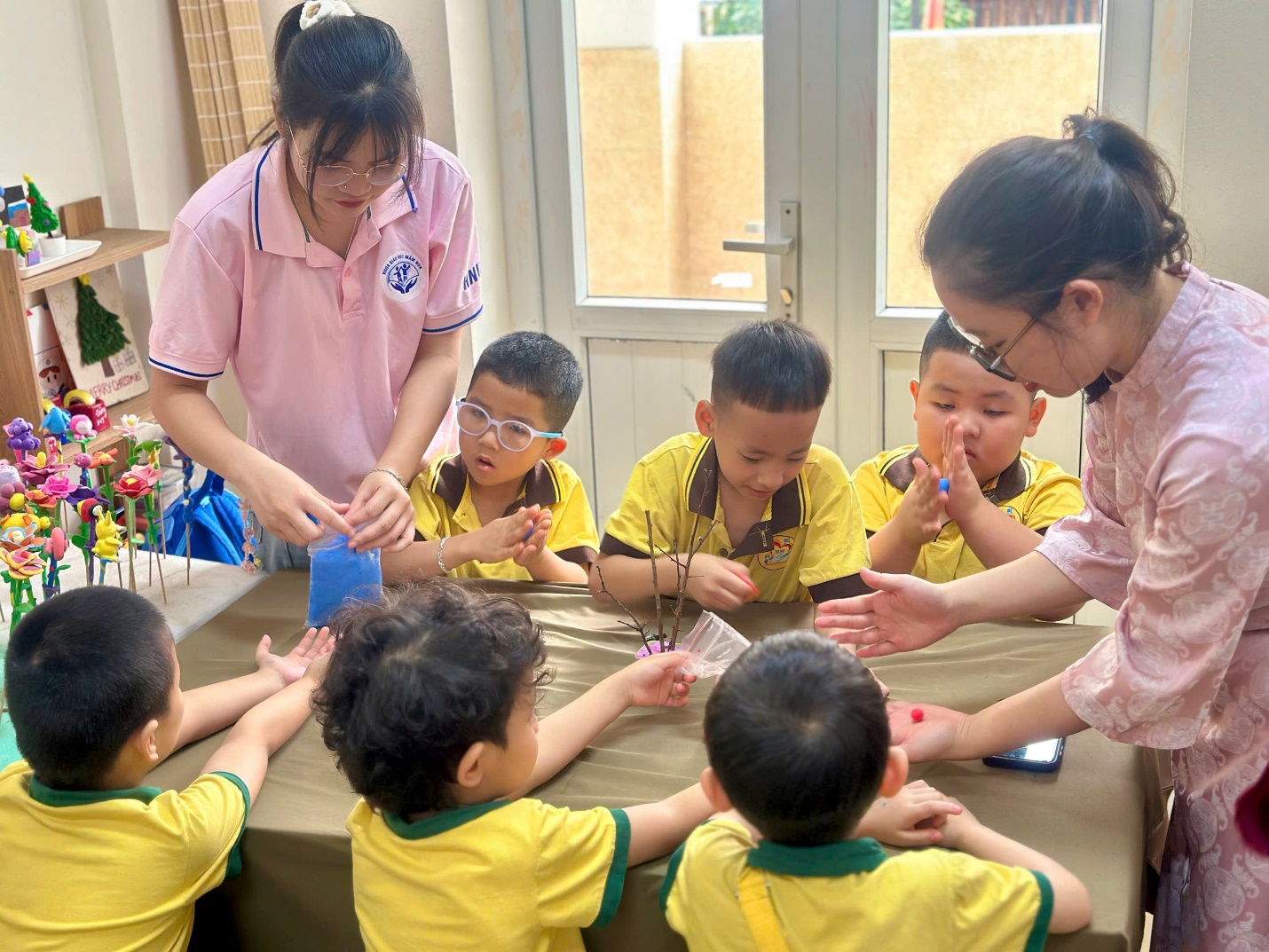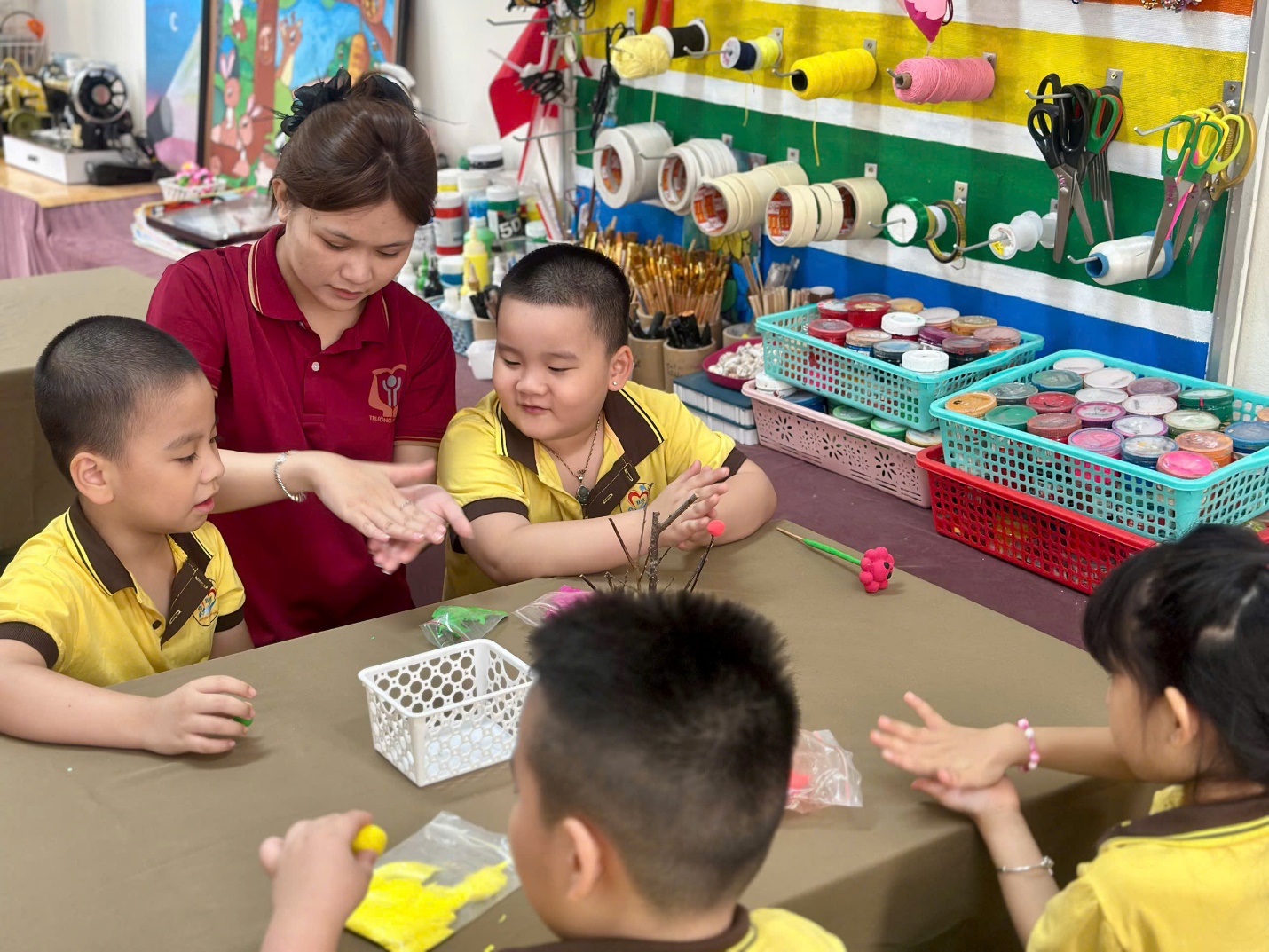 Tiếp đó, tại phòng Nghệ thuật, các con được tham gia hoạt động nặn quả cho cây. Nhóm các bạn hoàn thành sản phẩm nhanh và đẹp nhất, nhận được phần thưởng hấp dẫn như con quay gỗ, tò he, vòng đeo tay…– những món quà nhỏ nhưng mang lại niềm vui lớn.
