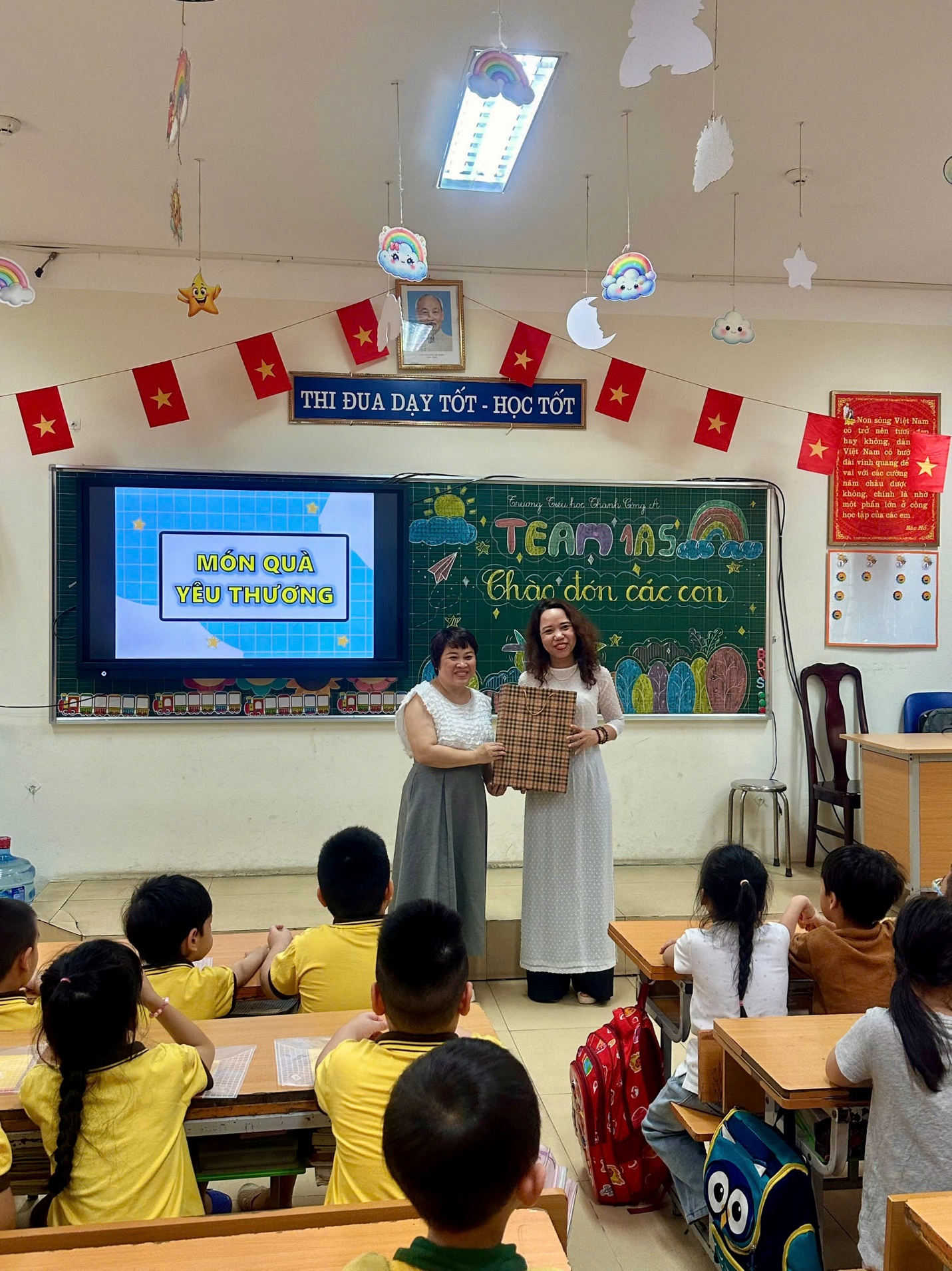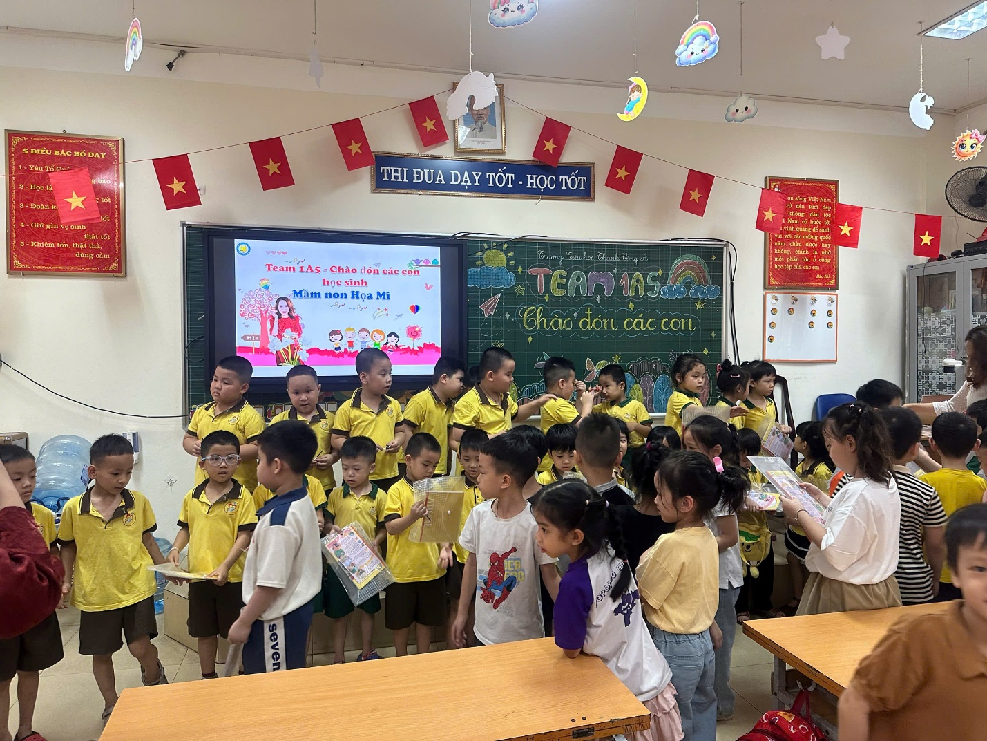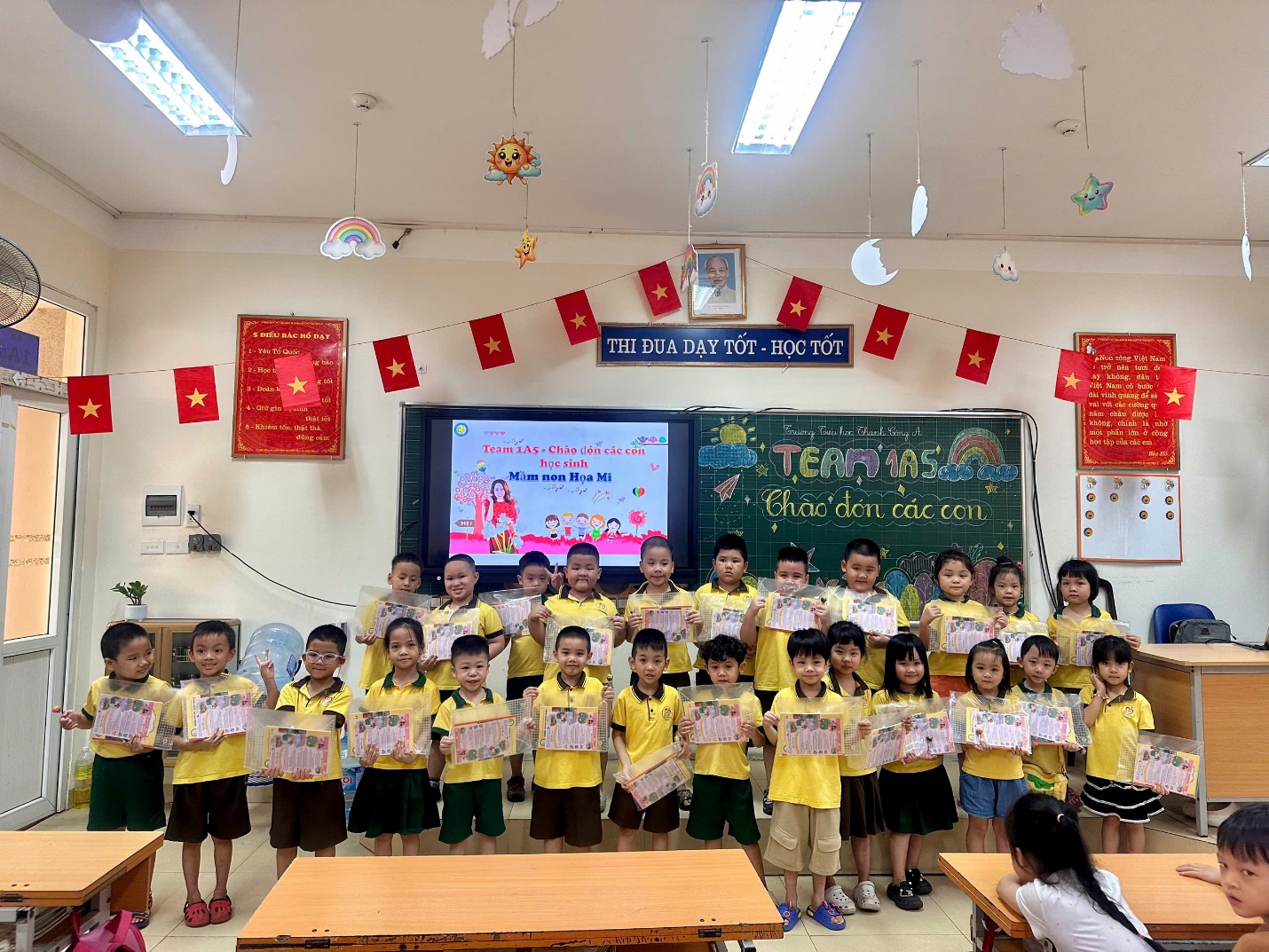 Một trong những hoạt động ý nghĩa nhất là giao lưu với các anh chị lớp 1A5. Các con được các anh chị tặng kẹo, cùng liên hoan vui vẻ và còn nhận thêm những quyển vở xinh xắn từ nhà trường. Những ánh mắt háo hức, những nụ cười rạng rỡ đã giúp khoảng cách giữa “mầm non” và “tiểu học” trở nên gần gũi hơn bao giờ hết.