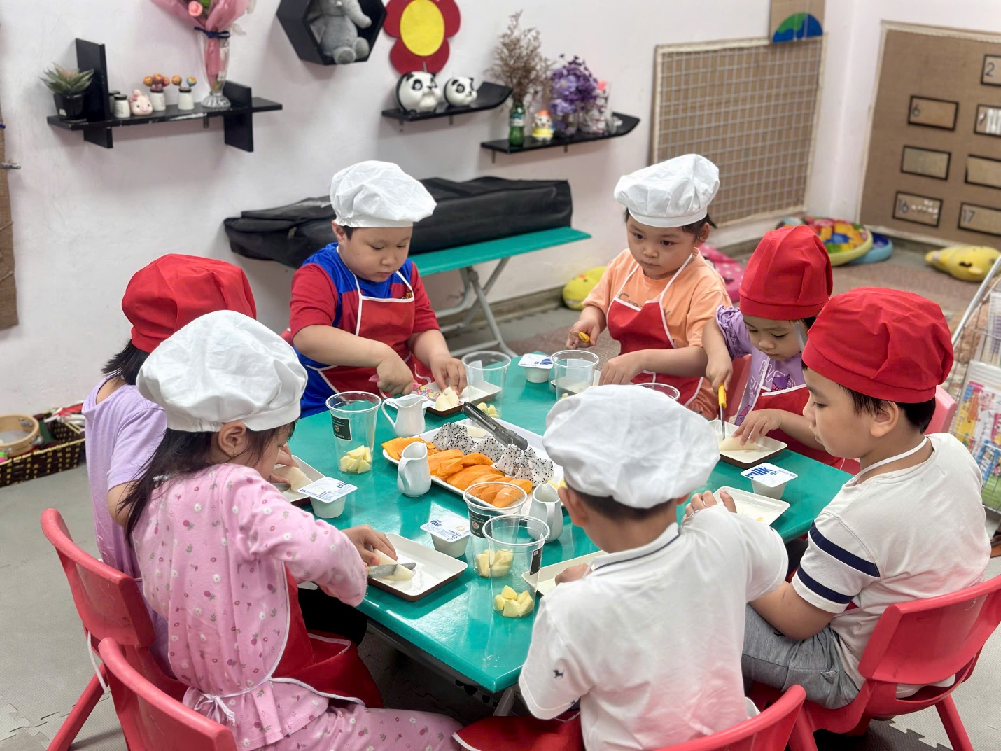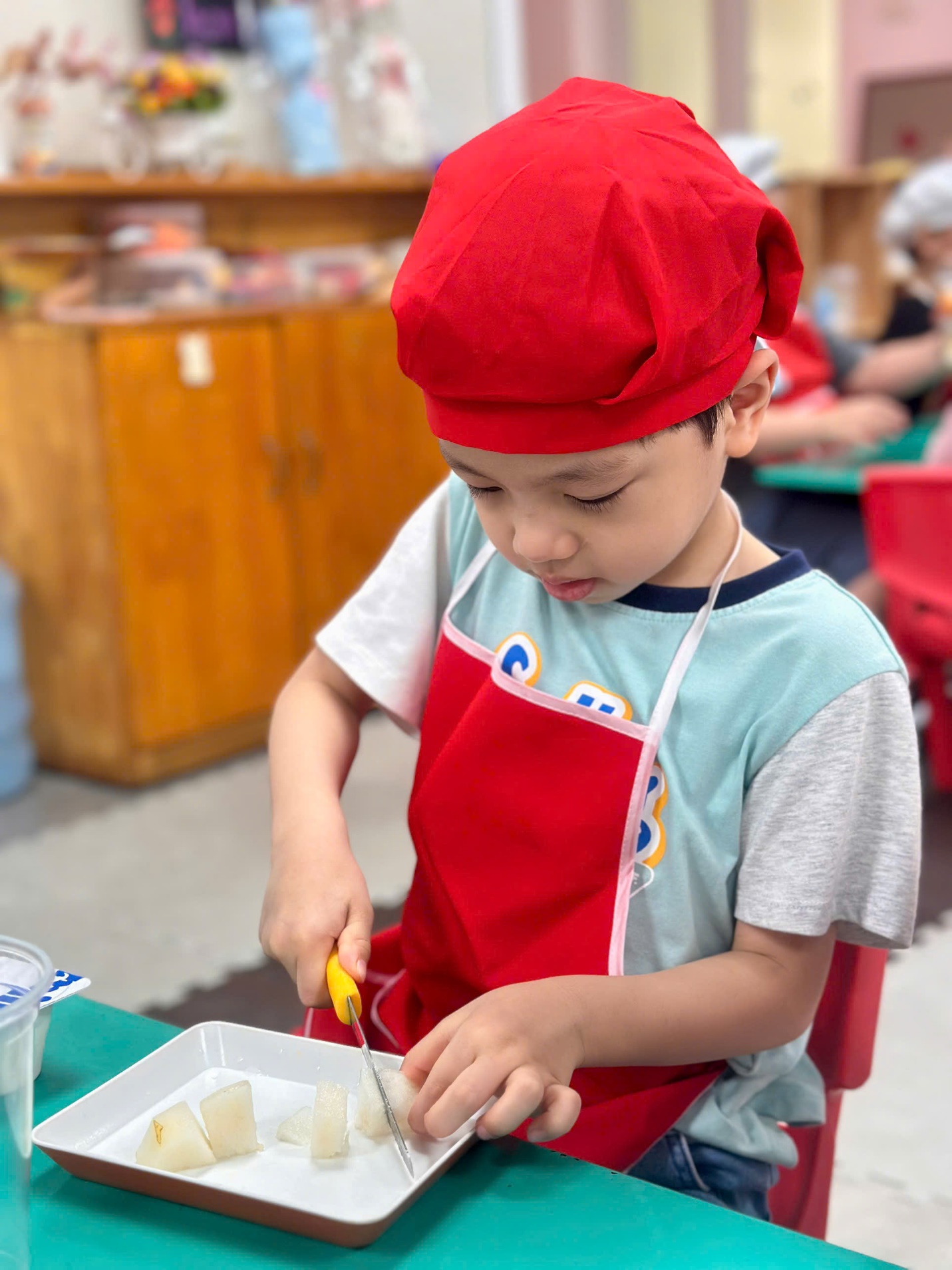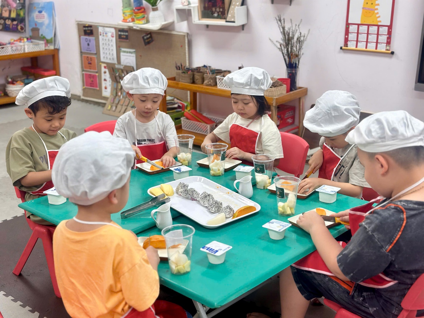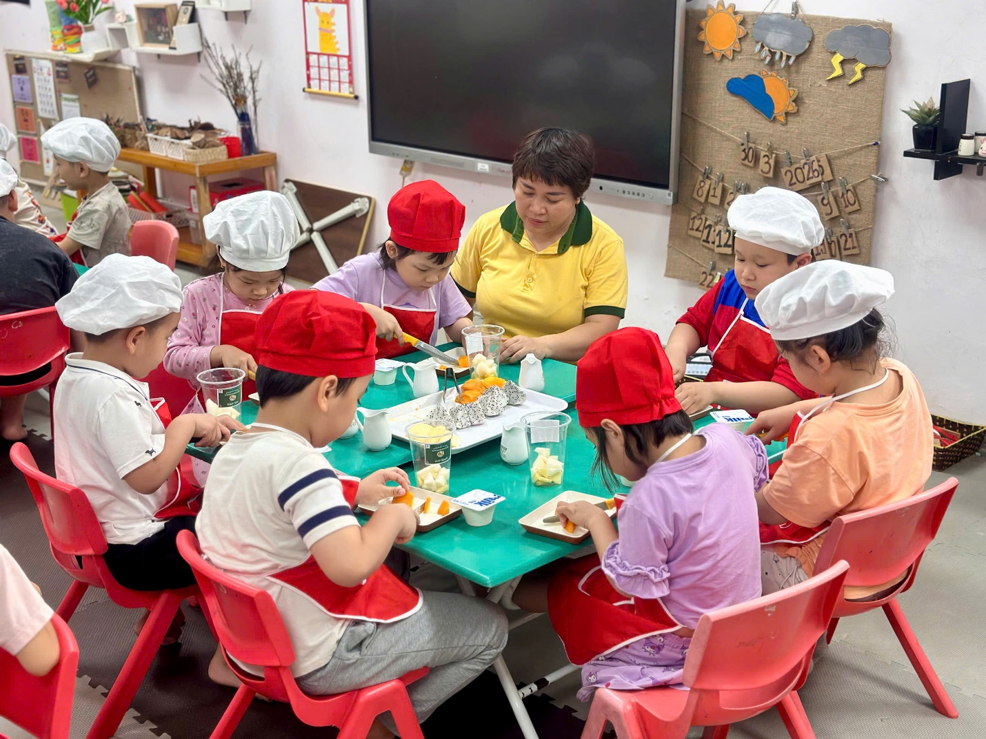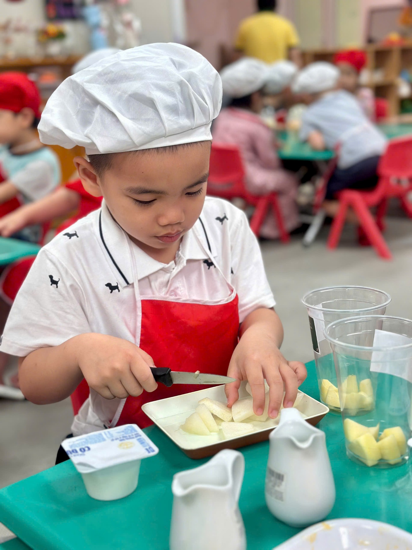 Dưới sự hướng dẫn của các cô giáo, các “đầu bếp nhí” bắt đầu với việc nhận biết và gọi tên các loại hoa quả như thanh long, xoài, lê, táo. Bạn nào cũng hào hứng khi được tự tay cắt nhỏ từng miếng hoa quả (dưới sự hỗ trợ của cô), rồi nhẹ nhàng cho vào bát.