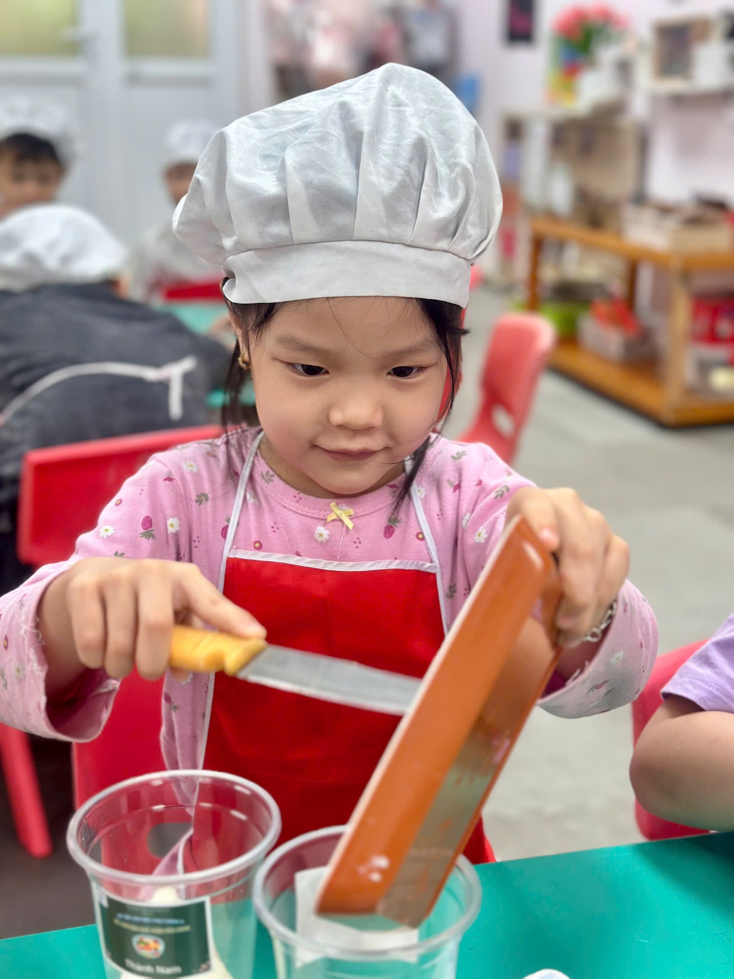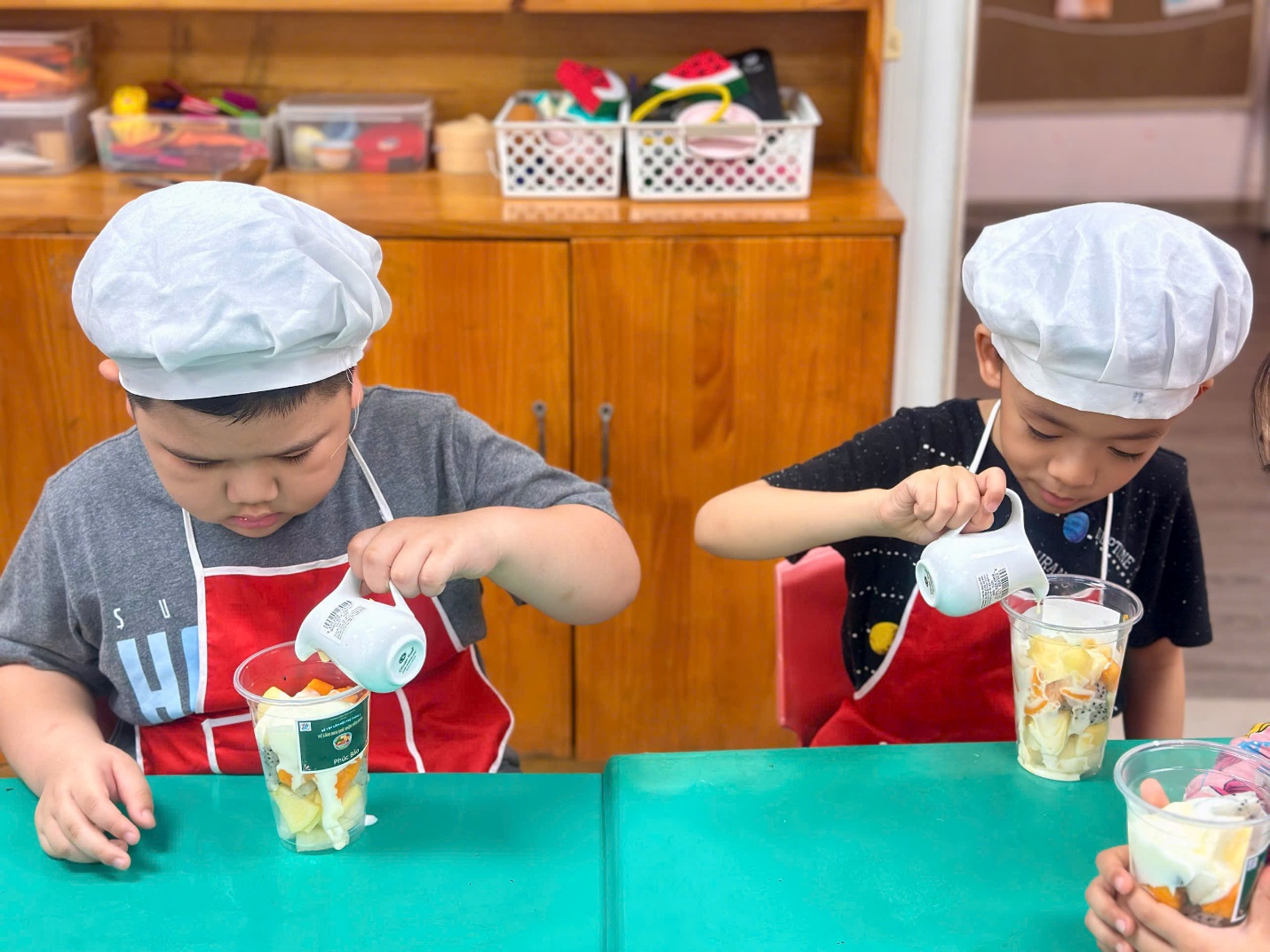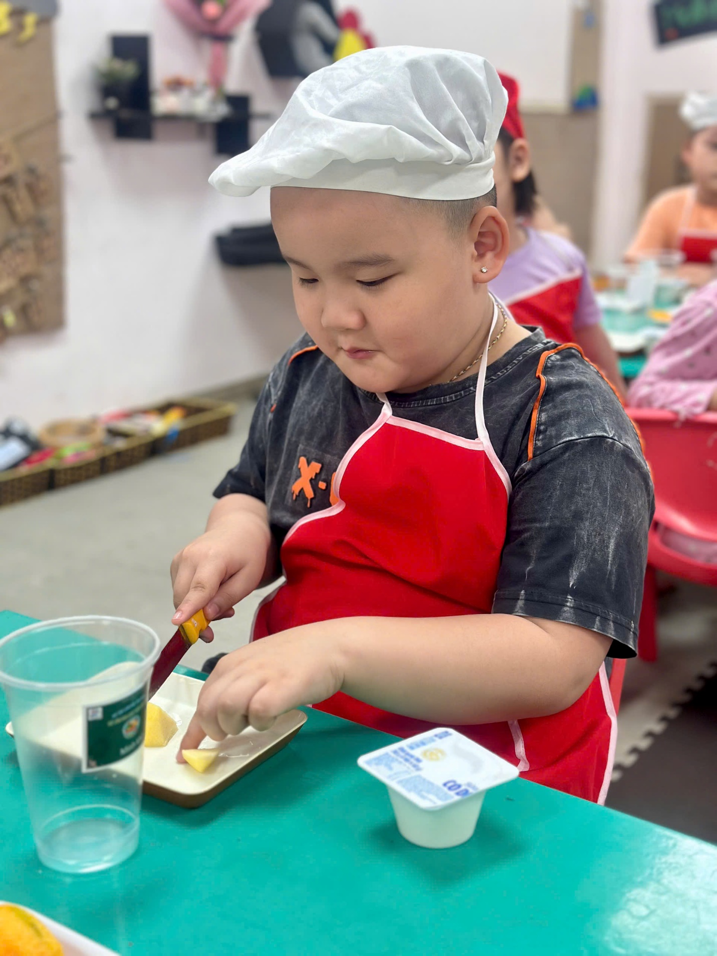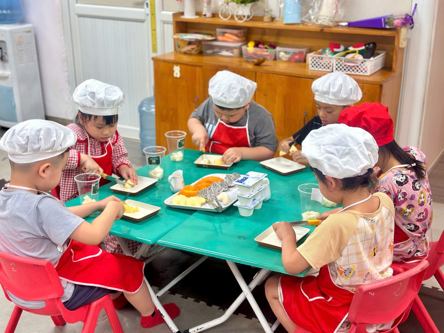 Dưới sự hướng dẫn của các cô giáo, các “đầu bếp nhí” bắt đầu với việc nhận biết và gọi tên các loại hoa quả như thanh long, xoài, lê, táo. Bạn nào cũng hào hứng khi được tự tay cắt nhỏ từng miếng hoa quả (dưới sự hỗ trợ của cô), rồi nhẹ nhàng cho vào bát.