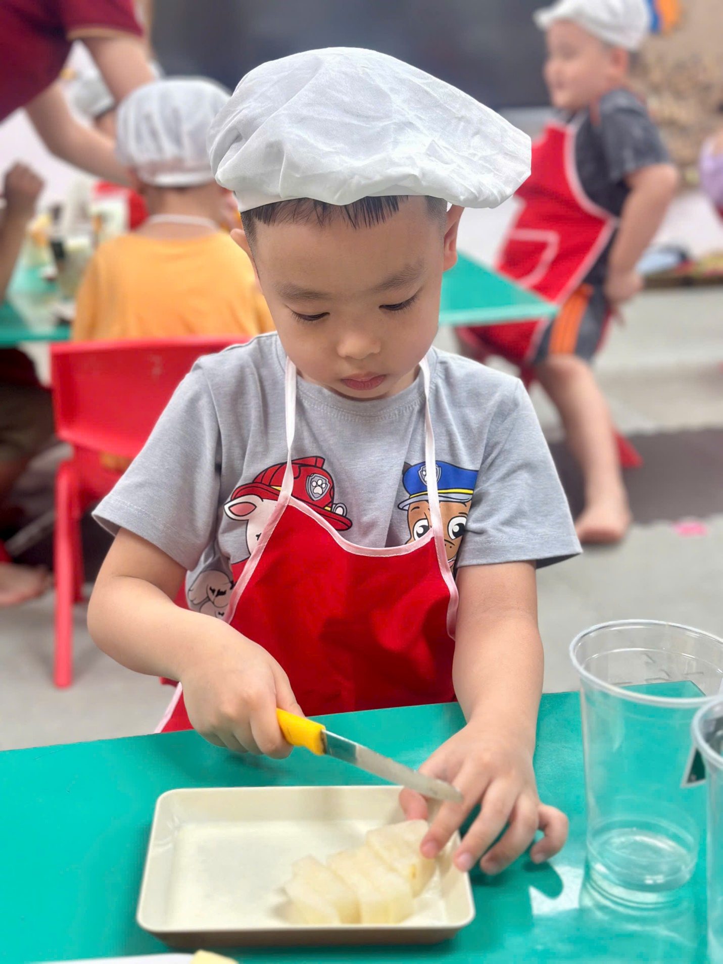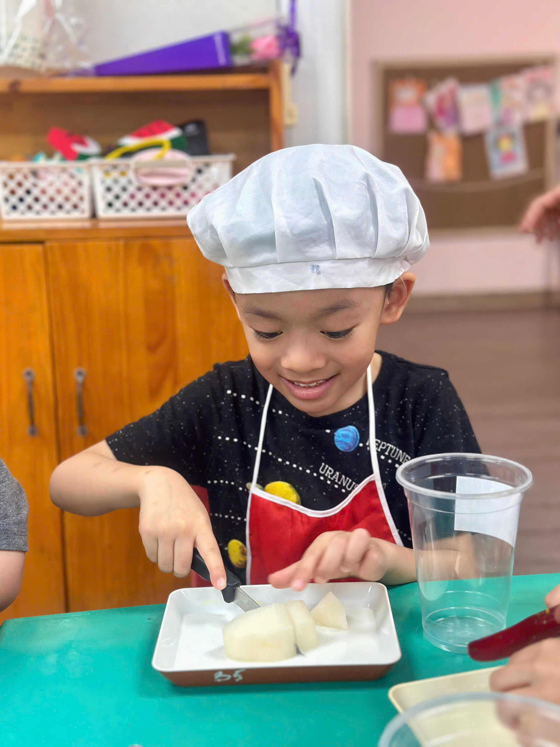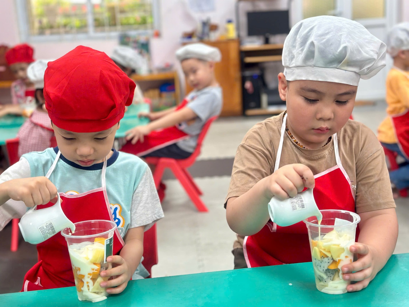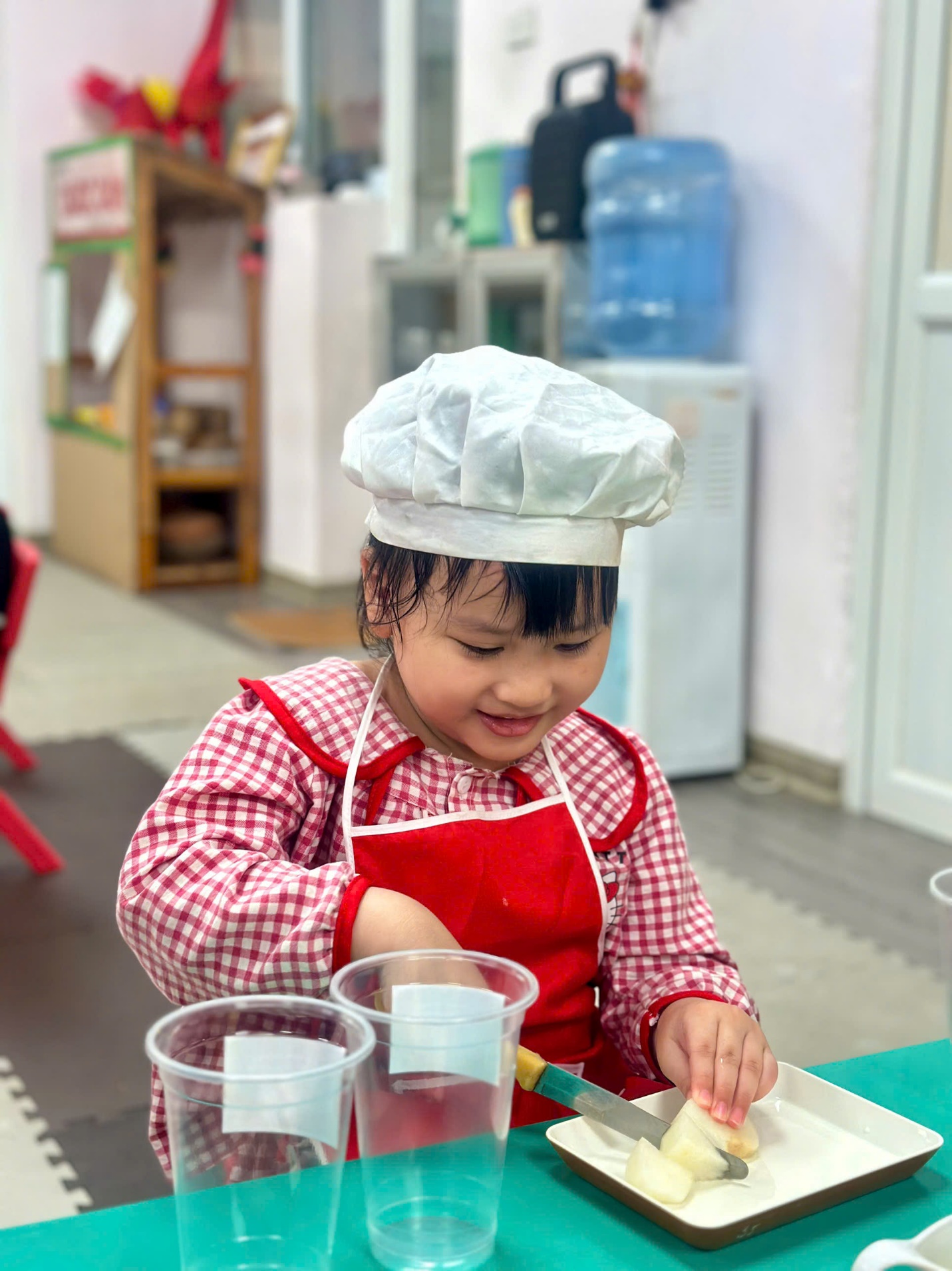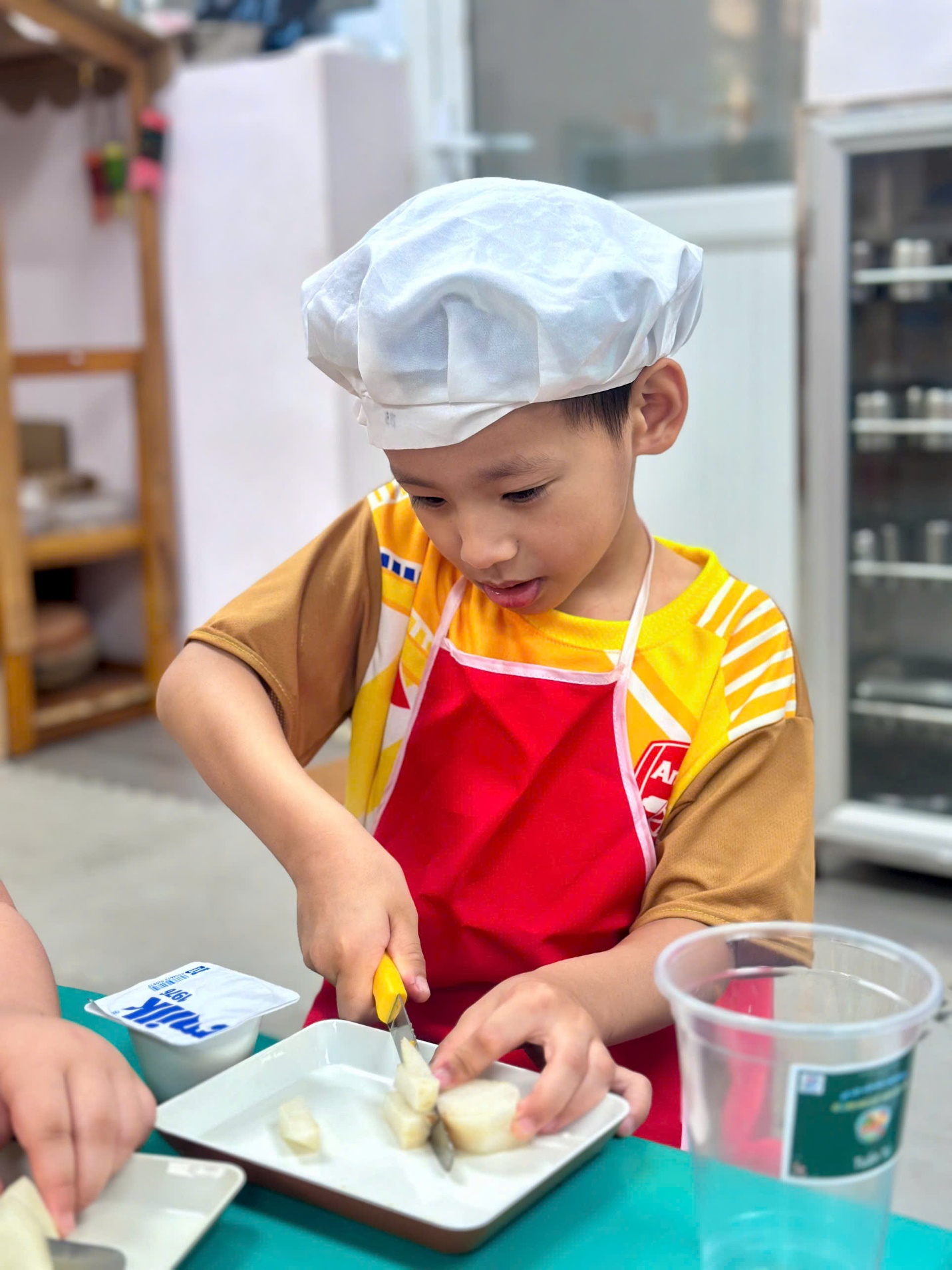 Dưới sự hướng dẫn của các cô giáo, các “đầu bếp nhí” bắt đầu với việc nhận biết và gọi tên các loại hoa quả như thanh long, xoài, lê, táo. Bạn nào cũng hào hứng khi được tự tay cắt nhỏ từng miếng hoa quả (dưới sự hỗ trợ của cô), rồi nhẹ nhàng cho vào bát.