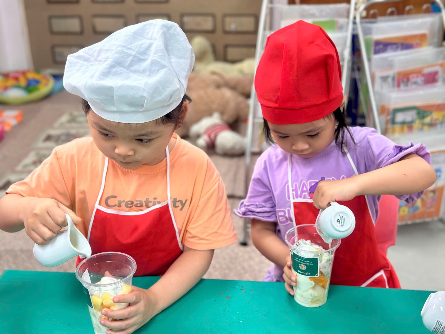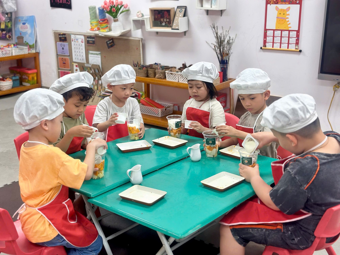 Tại lớp A5 – Trường Mầm non Họa Mi, các bạn nhỏ đã có một buổi trải nghiệm vô cùng thú vị khi cùng nhau thực hiện món ăn quen thuộc mà hấp dẫn: hoa quả trộn sữa chua.
