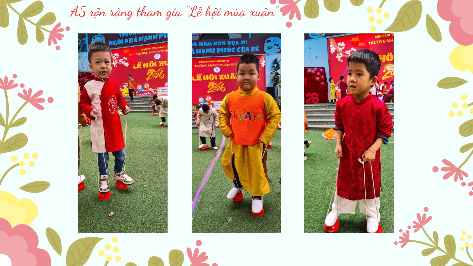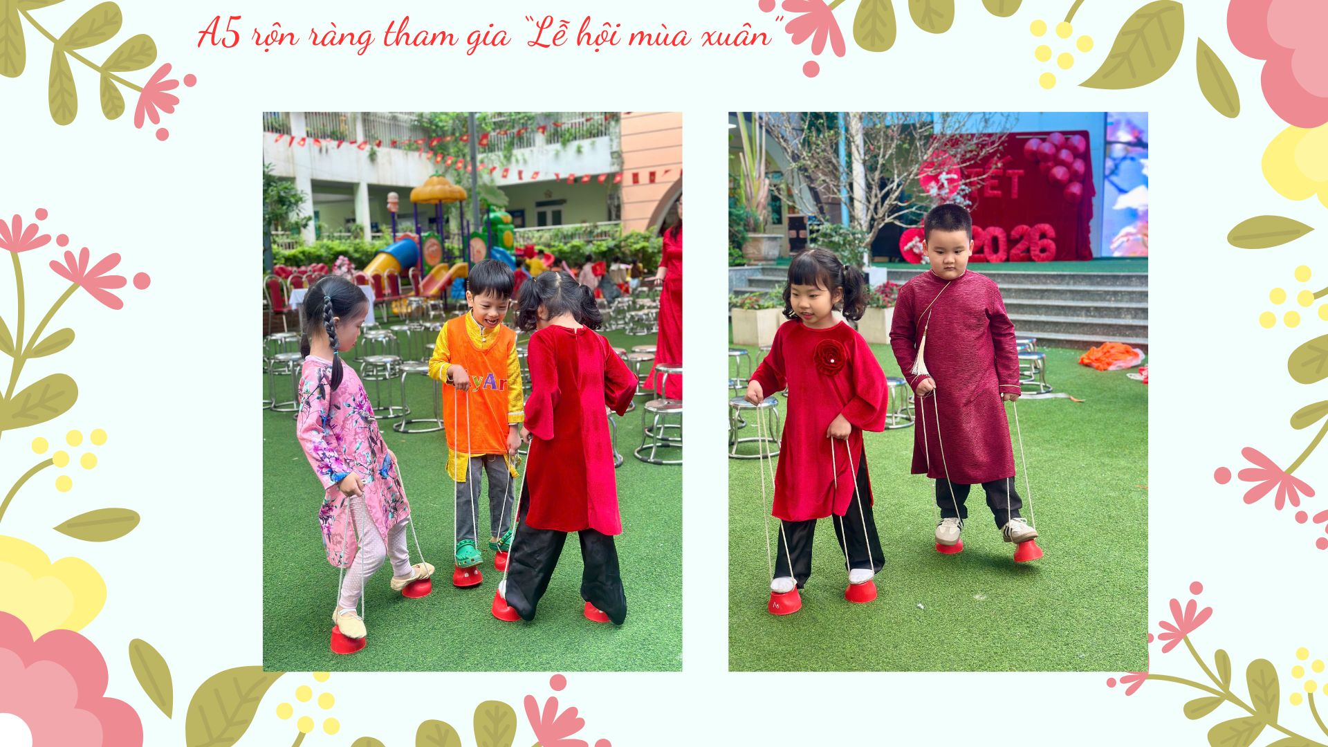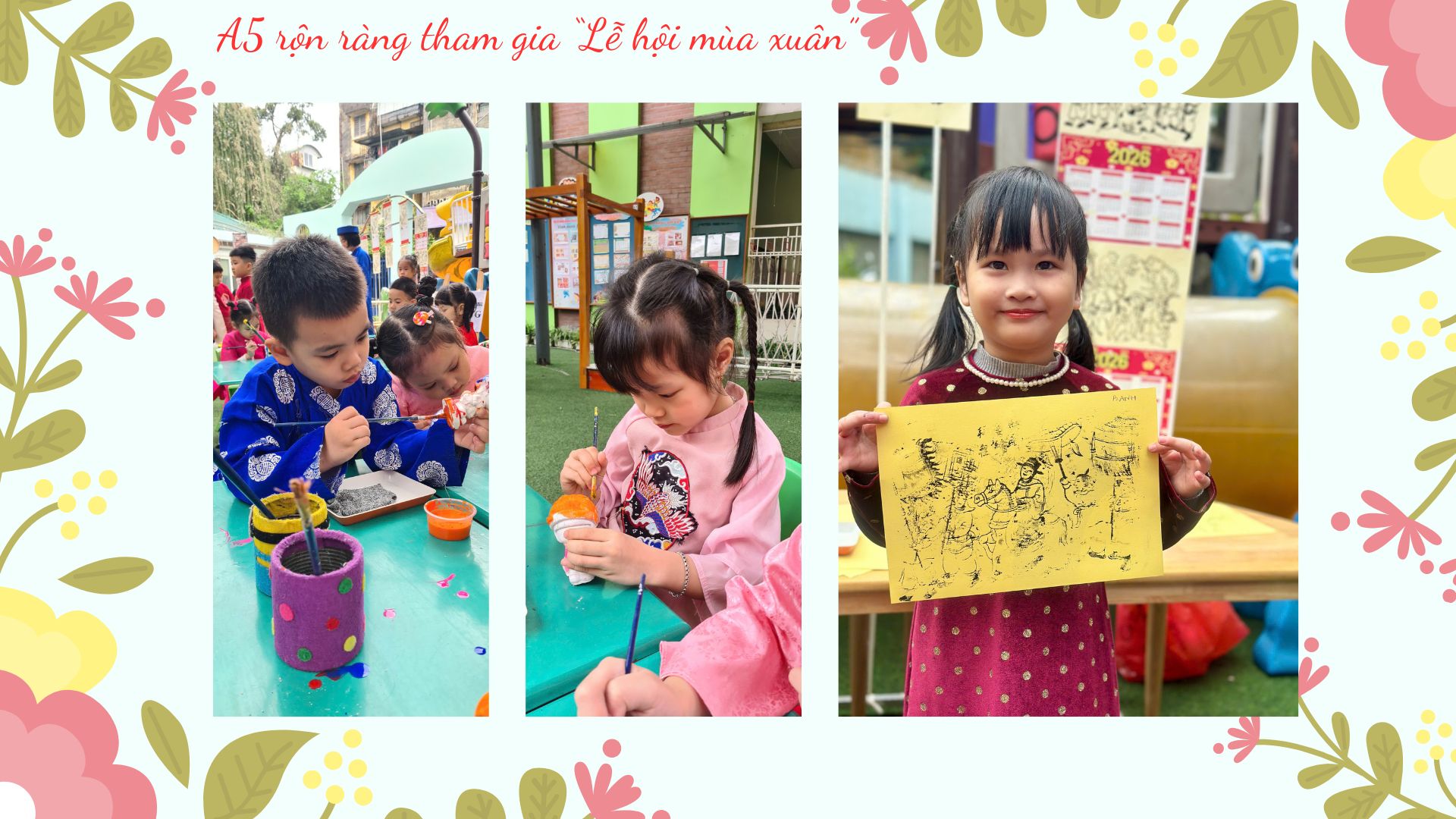 Lễ hội mùa xuân không chỉ mang đến cho các bé lớp A5 những phút giây vui chơi đầy hứng khởi mà còn giúp các con hiểu thêm về nét đẹp văn hóa truyền thống, rèn luyện sự tự tin, khéo léo và tinh thần gắn kết với bạn bè.