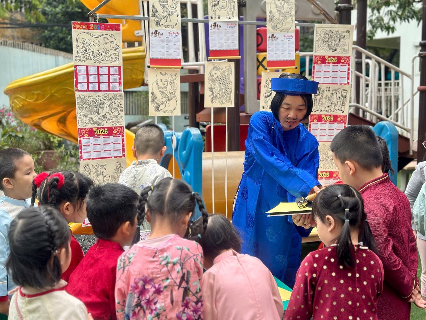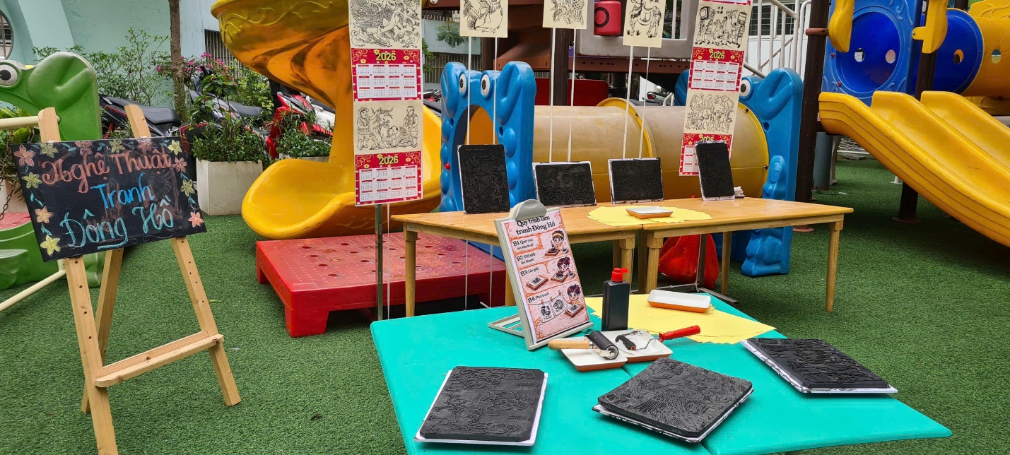 Đặc biệt, các bé còn được trải nghiệm làm tranh Đông Hồ, một nét đẹp văn hóa truyền thống của dân tộc. Dưới sự hướng dẫn của thầy đồ, các con chăm chú in từng nét tranh, cảm nhận sự thú vị của nghệ thuật dân gian Việt Nam.