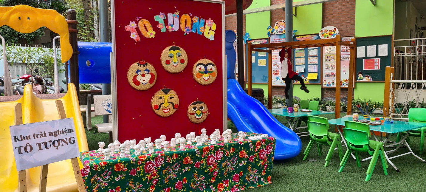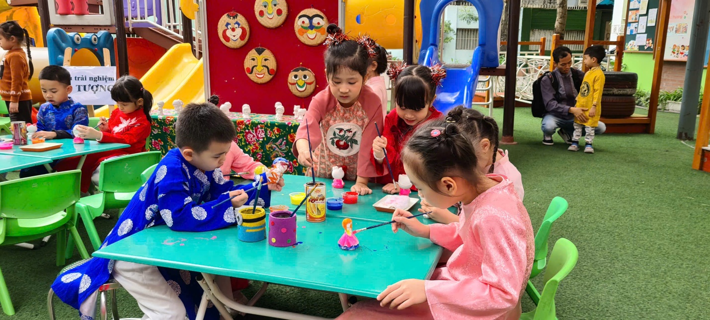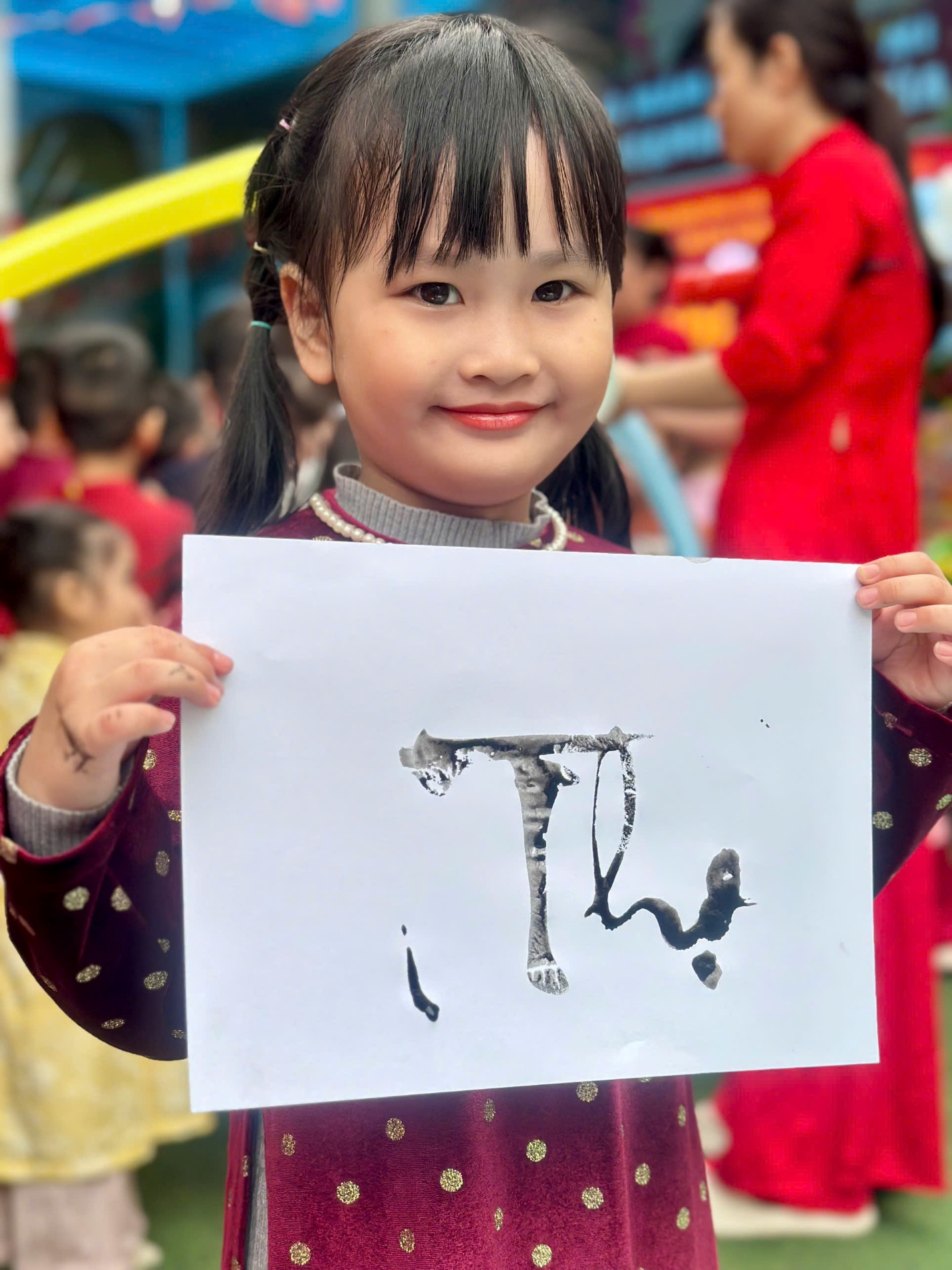 Một góc trải nghiệm cũng thu hút rất nhiều sự chú ý của các bé là viết thư pháp. Dù còn vụng về nhưng ai cũng chăm chú thử đồ những chữ đơn giản mang ý nghĩa tốt đẹp như “Phúc”, “Lộc”, “Thọ”. Những tờ giấy với nét mực đen đã giúp các con cảm nhận thêm vẻ đẹp của truyền thống ngày Tết.