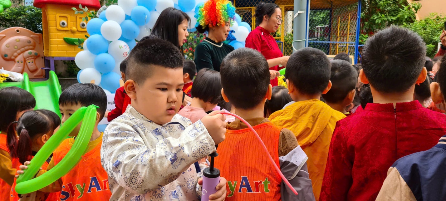 Không khí lễ hội càng thêm sôi động với hoạt động thổi bong bóng nghệ thuật đầy màu sắc và trò nhảy sạp rộn ràng. Tiếng nhạc, tiếng cười và những bước nhảy nhịp nhàng khiến sân trường như bừng lên sức sống của mùa xuân.