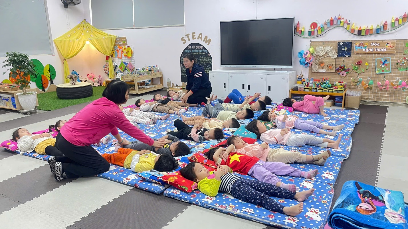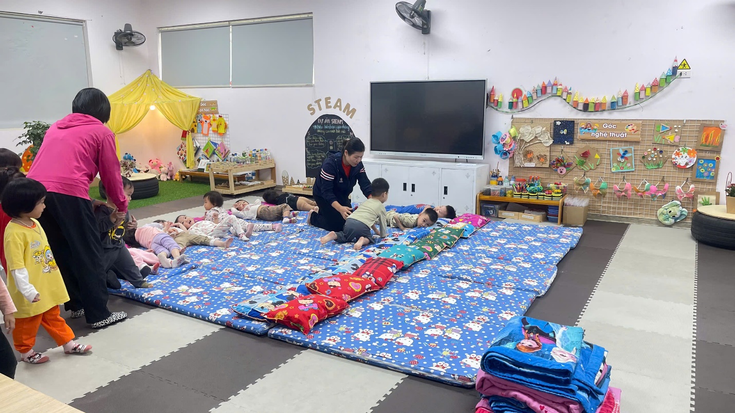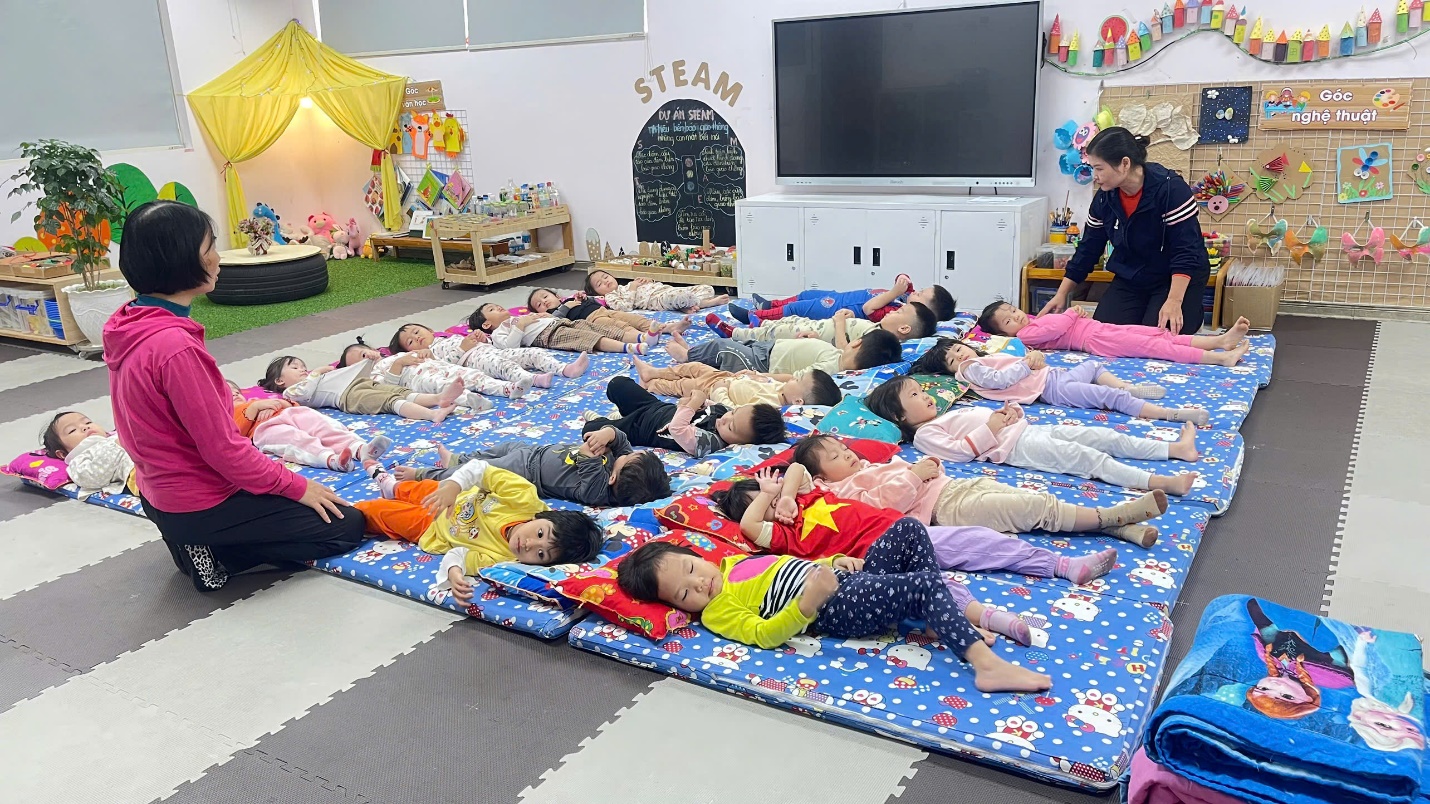 Trước giờ ngủ: Cô chuẩn bị các phòng nhóm gọn gàng sạch sẽ, thoáng mát vào mùa hè, ấm áp vào mùa đông. Phòng ngủ được kéo rèm, tắt điện để đảm bảo giấc ngủ cho trẻ. Cô trải chiếu, đệm, cho trẻ tự lấy gối, tạo cho trẻ có thói quen tốt tự phục vụ bản thân.