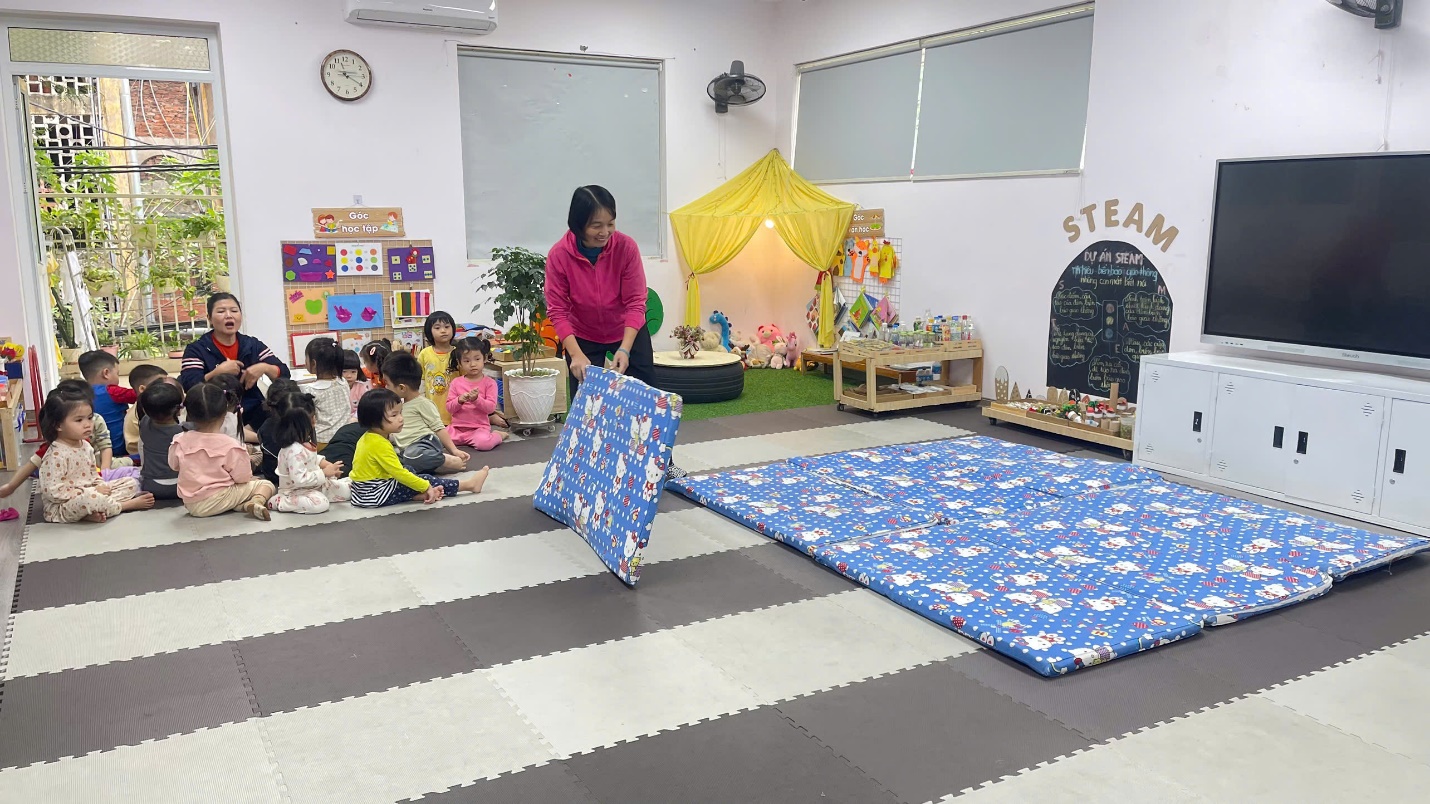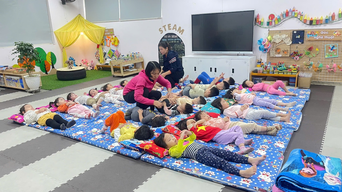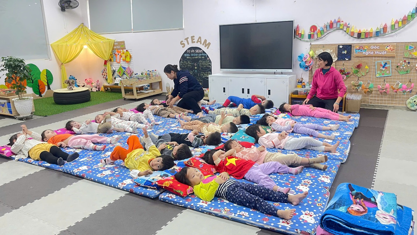 Trước giờ ngủ: Cô chuẩn bị các phòng nhóm gọn gàng sạch sẽ, thoáng mát vào mùa hè, ấm áp vào mùa đông. Phòng ngủ được kéo rèm, tắt điện để đảm bảo giấc ngủ cho trẻ. Cô trải chiếu, đệm, cho trẻ tự lấy gối, tạo cho trẻ có thói quen tốt tự phục vụ bản thân.