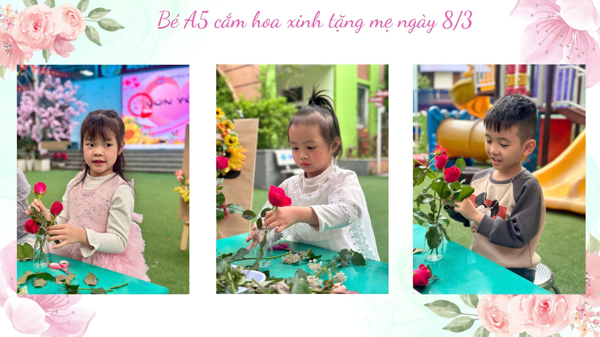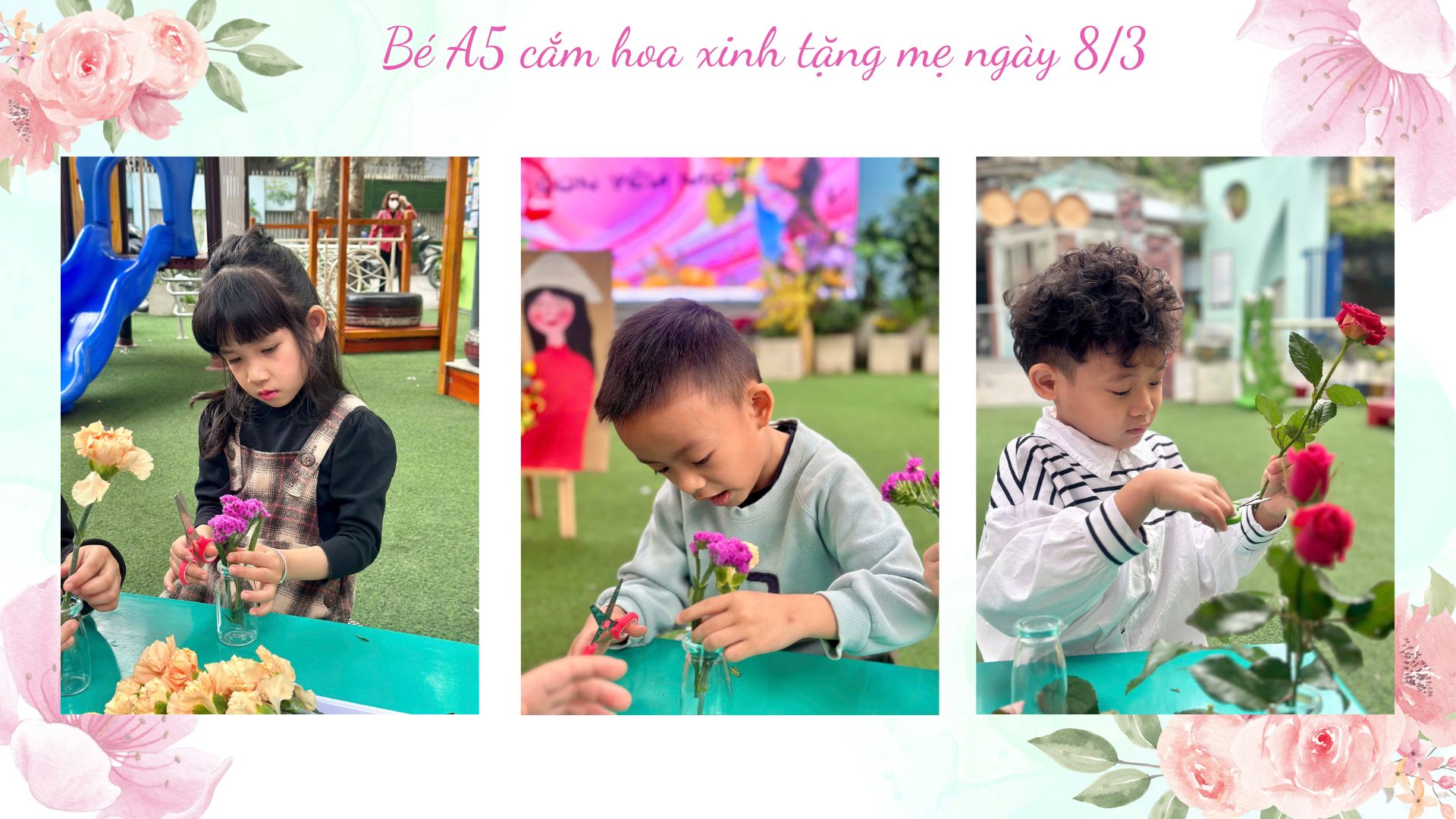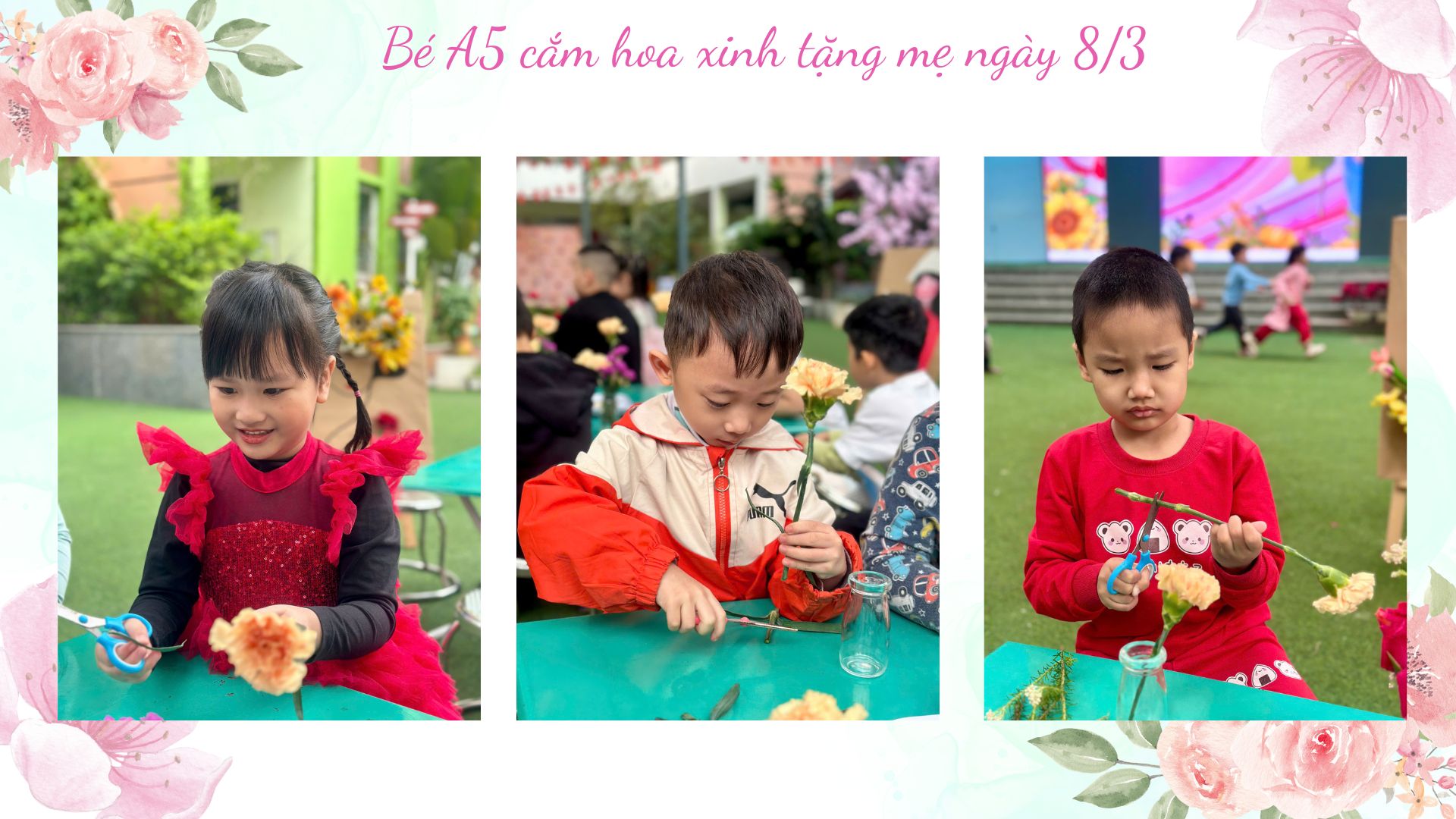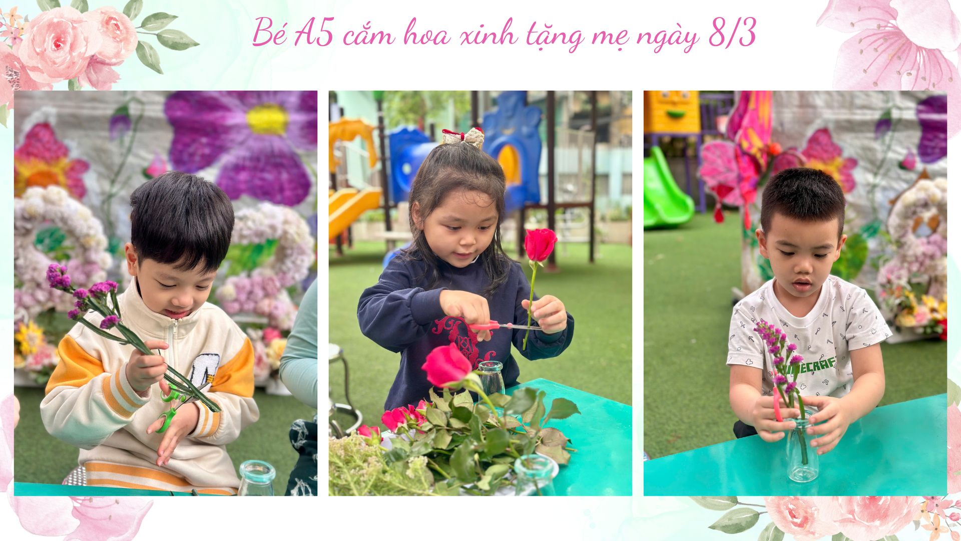 Dưới sự hướng dẫn nhẹ nhàng của các cô giáo, những “nghệ nhân nhí” lớp A5 bắt đầu hành trình cắm một lọ hoa cho mẹ từ những việc rất tỉ mỉ. Các bé chăm chú cắt từng cành hoa rồi khéo léo cắm vào lọ, đan xen đủ sắc màu: hoa hồng rực rỡ, cẩm chướng dịu dàng, sa lem tím ngắt và những bông hoa gạo nhỏ xinh. Mỗi bé một ý tưởng, mỗi bình hoa một vẻ đẹp riêng, nhưng tất cả đều chứa đựng tình yêu thương ngọt ngào dành cho mẹ