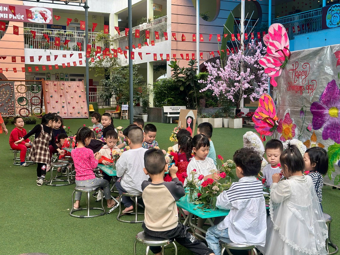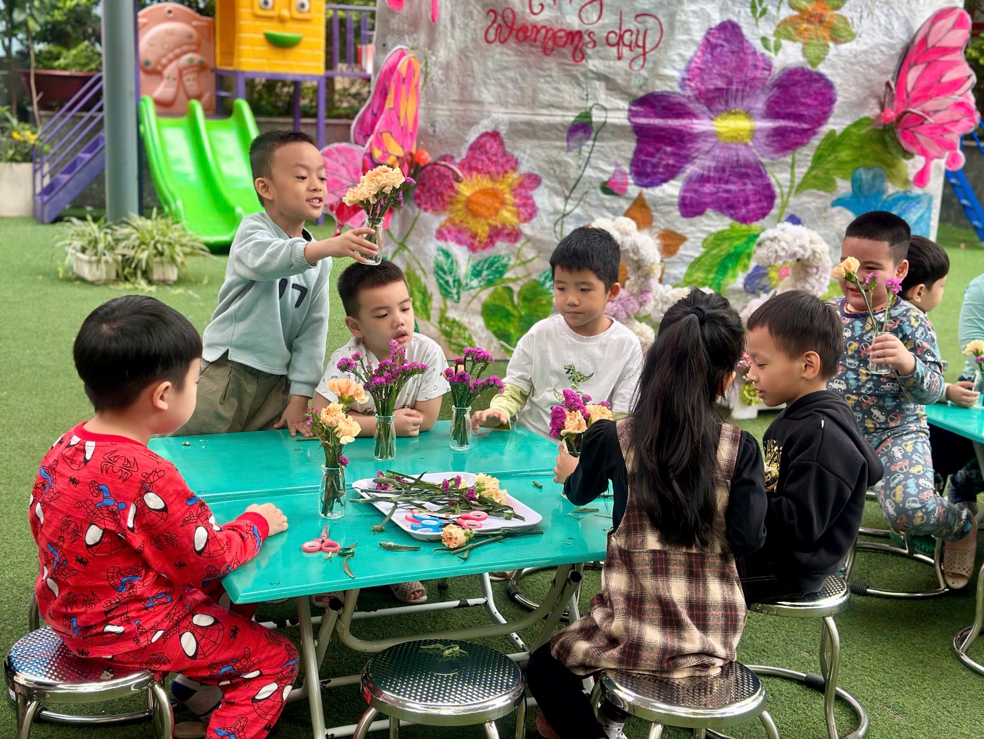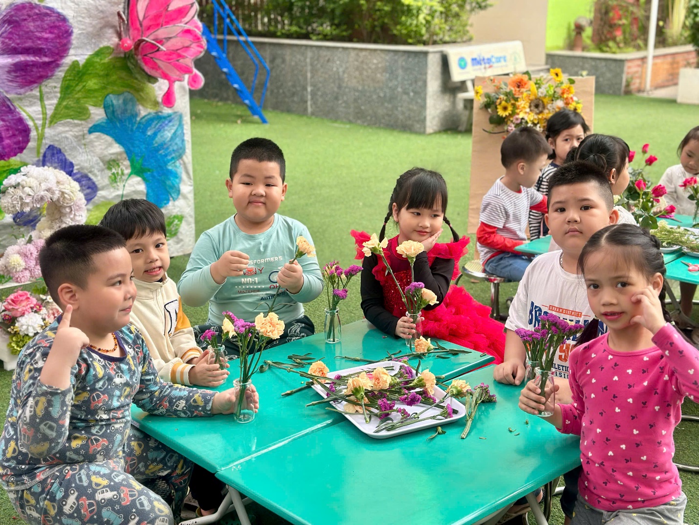 Dưới sự hướng dẫn nhẹ nhàng của các cô giáo, những “nghệ nhân nhí” lớp A5 bắt đầu hành trình cắm một lọ hoa cho mẹ từ những việc rất tỉ mỉ. Các bé chăm chú cắt từng cành hoa rồi khéo léo cắm vào lọ, đan xen đủ sắc màu: hoa hồng rực rỡ, cẩm chướng dịu dàng, sa lem tím ngắt và những bông hoa gạo nhỏ xinh. Mỗi bé một ý tưởng, mỗi bình hoa một vẻ đẹp riêng, nhưng tất cả đều chứa đựng tình yêu thương ngọt ngào dành cho mẹ