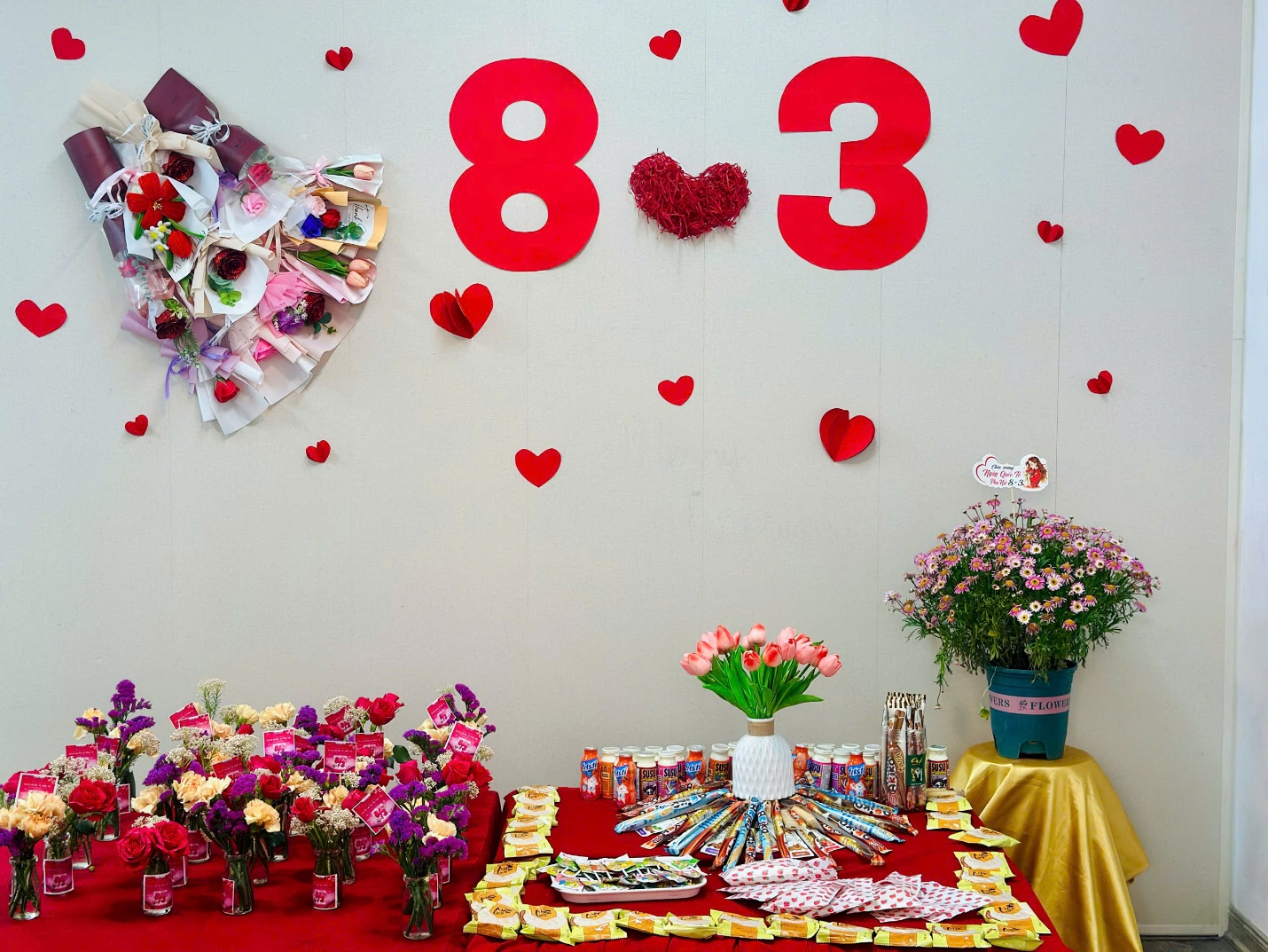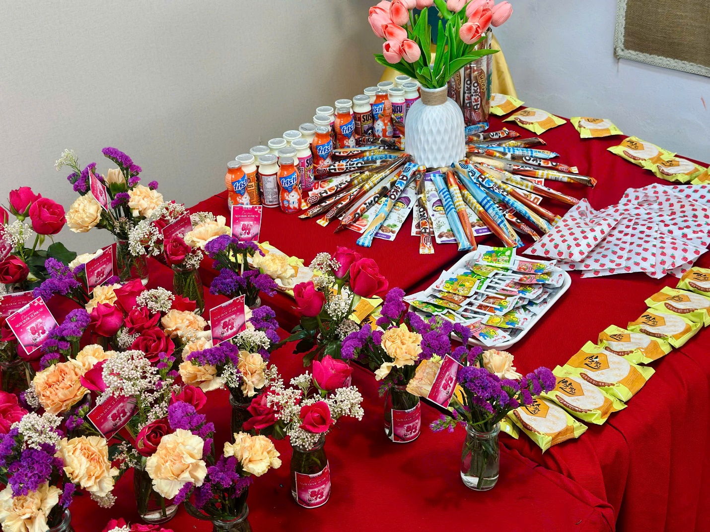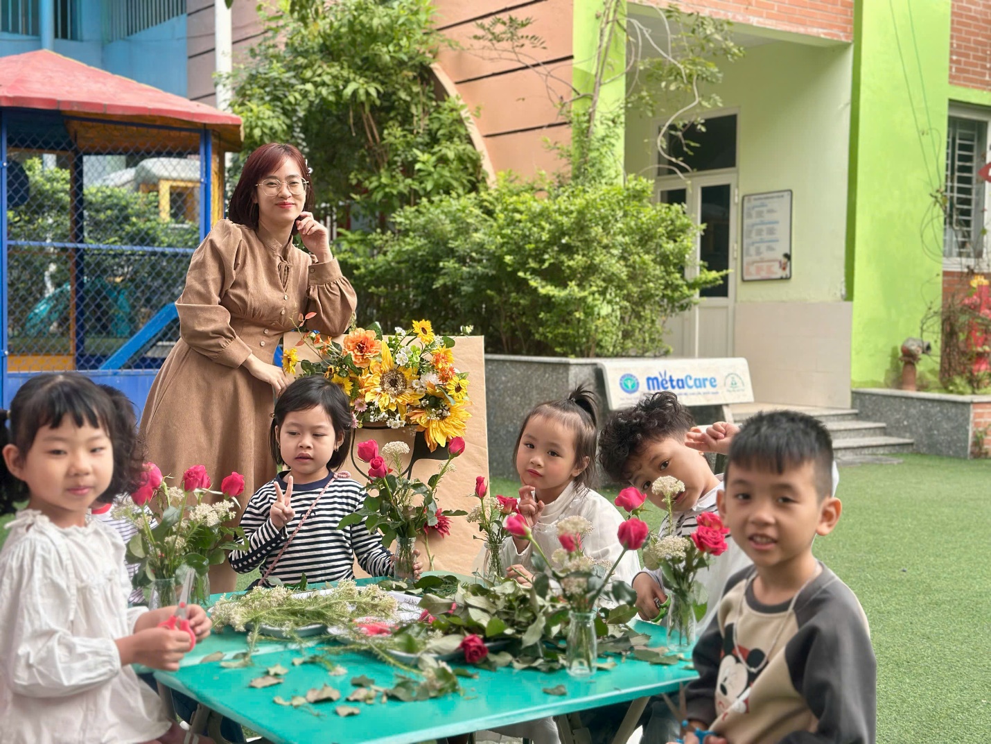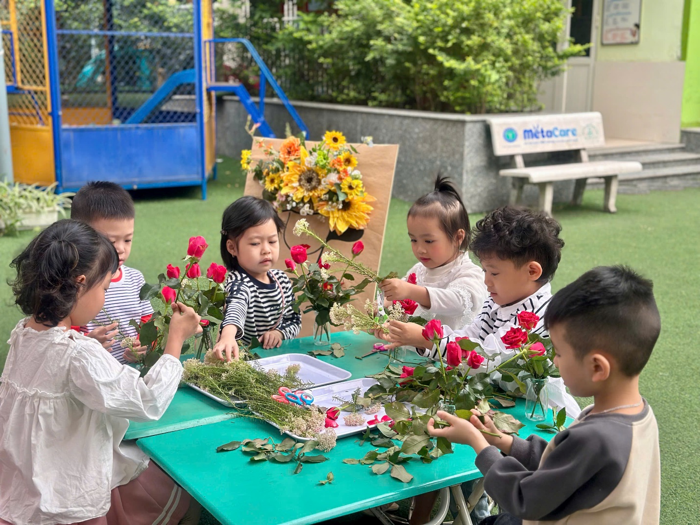 Dưới sự hướng dẫn nhẹ nhàng của các cô giáo, những “nghệ nhân nhí” lớp A5 bắt đầu hành trình cắm một lọ hoa cho mẹ từ những việc rất tỉ mỉ. Các bé chăm chú cắt từng cành hoa rồi khéo léo cắm vào lọ, đan xen đủ sắc màu: hoa hồng rực rỡ, cẩm chướng dịu dàng, sa lem tím ngắt và những bông hoa gạo nhỏ xinh. Mỗi bé một ý tưởng, mỗi bình hoa một vẻ đẹp riêng, nhưng tất cả đều chứa đựng tình yêu thương ngọt ngào dành cho mẹ