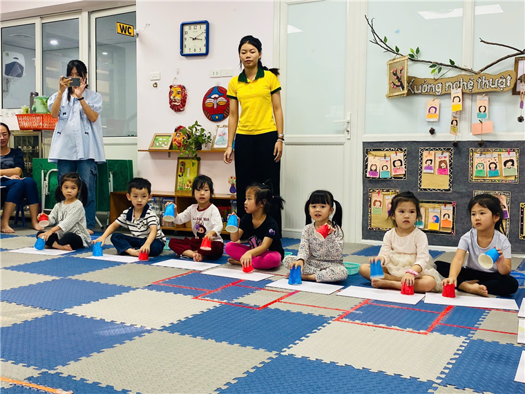 Với phương châm dạy học "Lấy trẻ làm trung tâm" bằng nhiều hình thức đổi mới linh hoạt, sáng tạo, tích hợp âm nhạc dùng bộ gõ cơ thể vào hoạt động làm quen với toán, các cô giáo lớp B2 đã dẫn dắt, thu hút trẻ tham gia các hoạt động một cách tích cực, sôi nổi và hứng thú. Trẻ tham gia vào các hoạt động trải nghiệm một cách chủ động dưới sự gợi mở của cô. Giờ làm quen với toán của cô và trò lớp B2 trở nên hấp dẫn và cuốn hút hơn bao giờ hết. Hoạt động làm quen với toán không còn khô khan và nhàm chán đối với trẻ nữa  mà giờ đây được thay thế bởi các trò chơi hấp dẫn hay các đồ dùng được các cô giáo thiết kế, tận dụng một cách triệt để đạt hiệu quả cao trong suốt giờ hoạt động. Nó giúp trẻ cảm thấy thoải mái và vui vẻ hơn. Giờ học toán không chỉ giúp trẻ nắm vững các khái niệm số học mà còn kích thích tư duy logic của trẻ. Các bé sẽ học cách tư duy theo từng bước, phân tích các tình huống và đưa ra các quyết định phù hợp trong các trò chơi và các hoạt động của giờ học. Với mong muốn tạo ra một môi trường học tập vui vẻ, thân thiện và khuyến khích sự sáng tạo của trẻ, các cô đã khéo léo lồng ghép âm nhạc, hình ảnh sinh động và các hoạt động nhóm giúp trẻ cảm thấy thoải mái và hứng thú khi tham gia vào giờ học toán.