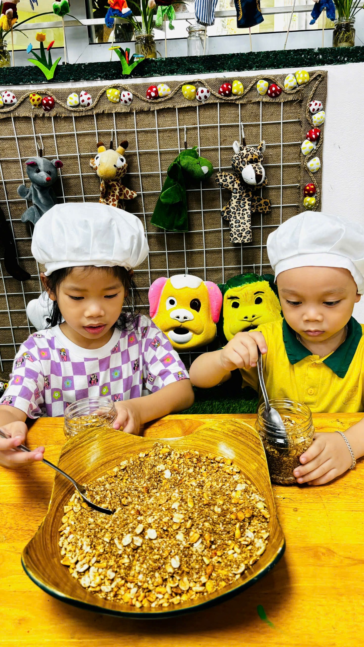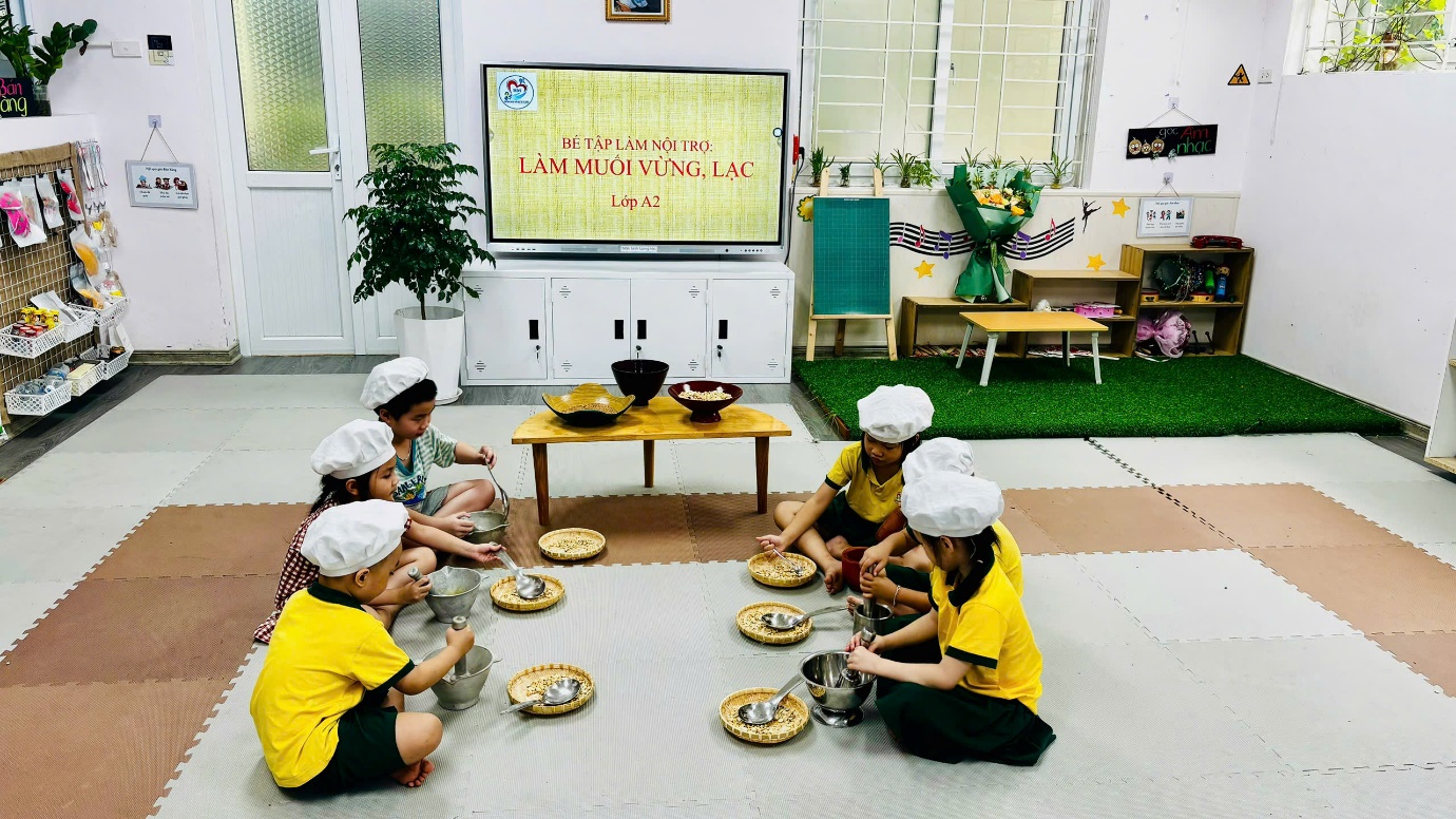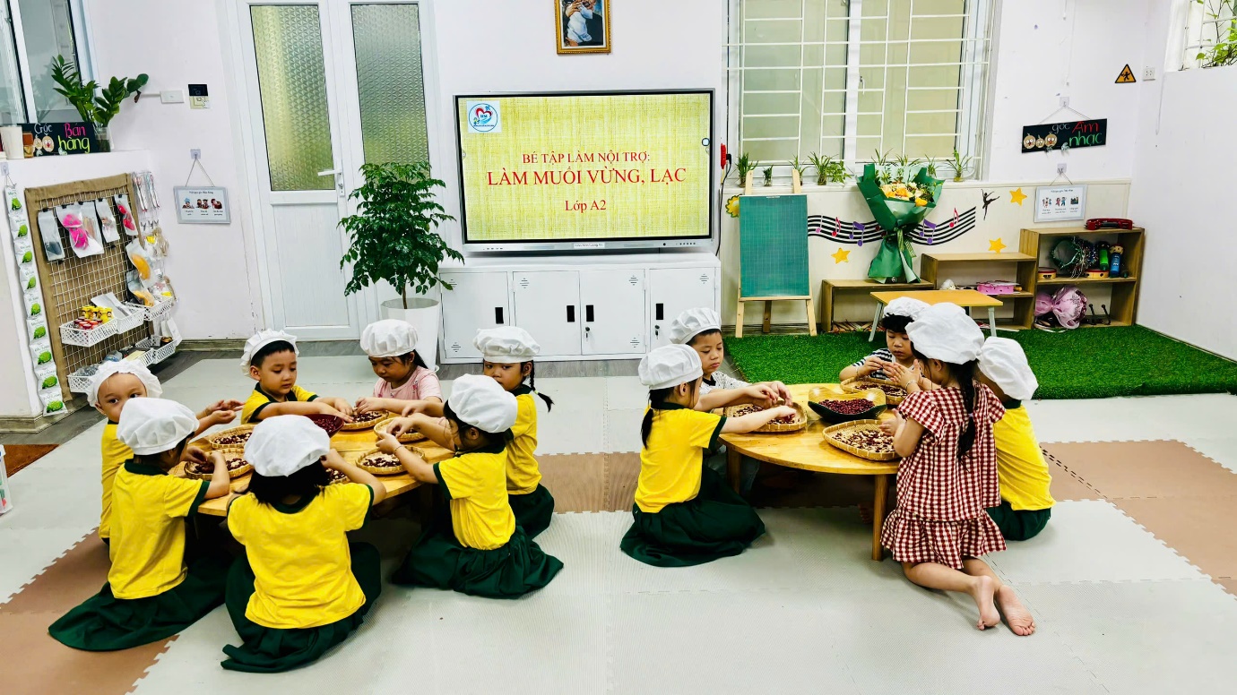 "MUỐI VỪNG LẠC" từ lâu vốn là món ăn dân dã thơm ngon và rất tiện lợi gắn liền với tuổi thơ của biết bao gia đình Việt trong mỗi bữa cơm. Bây giờ, cuộc sống hiện đại có nhiều thay đổi, món ăn này thấy ít xuất hiện trong bữa cơm gia đình hơn. Để làm ra được muối vừng lạc thơm ngon các cô giáo lớp A2 đã hướng dẫn chúng con cách chọn nguyên liệu: Lạc, vừng, phải chọn những hạt căng, tròn đầy, không nên chọn những hạt ẩm mốc. Chọn muối là loại muối tinh có màu trắng, hạt nhỏ…
