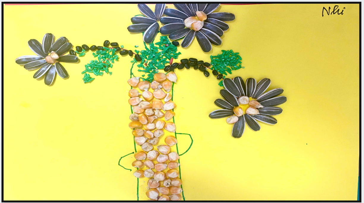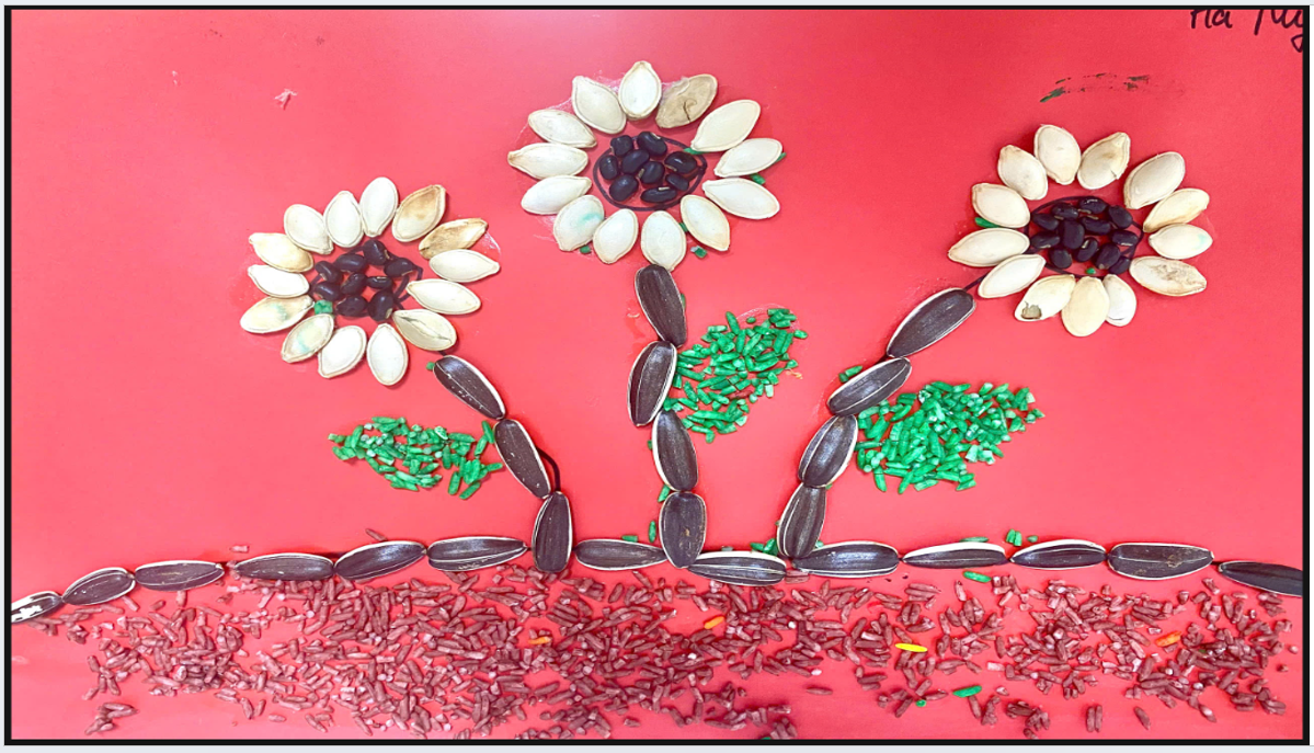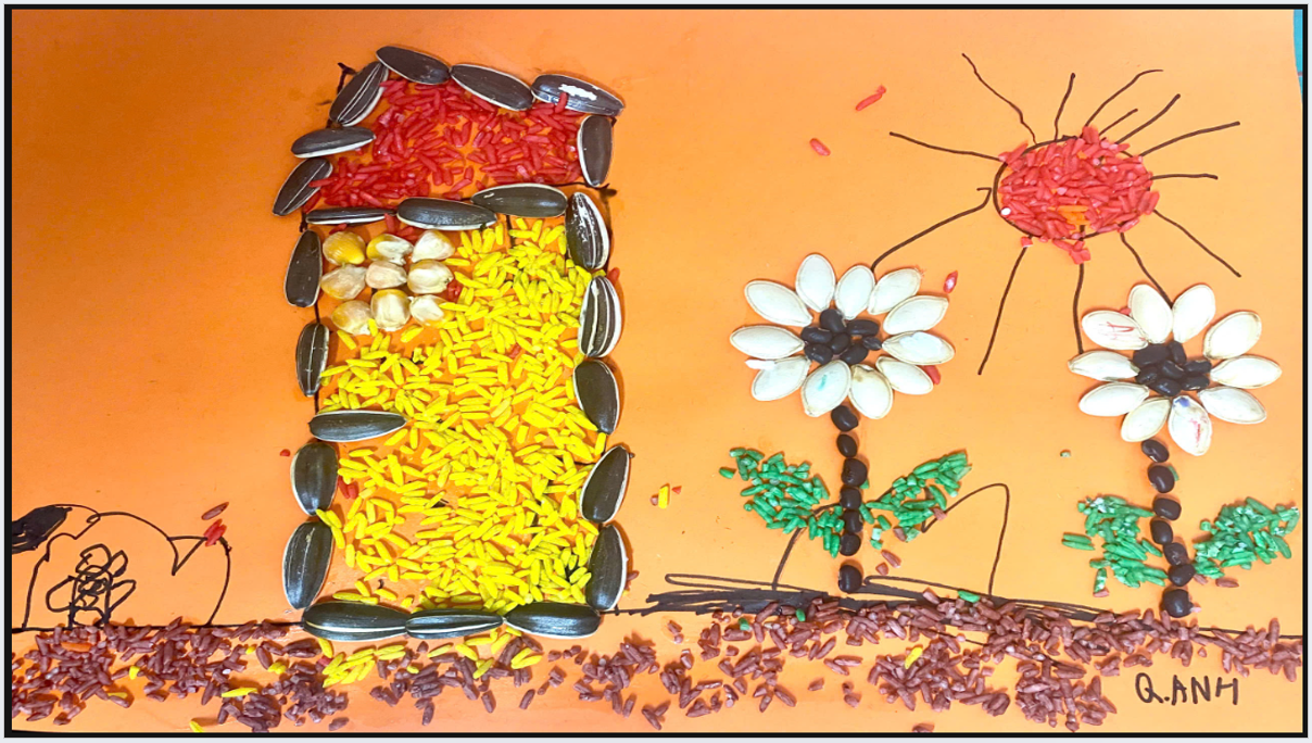 Có bạn chọn làm bức tranh hoa mặt trời rực rỡ , cánh hoa làm từ hạt hướng dương , hạt ngô làm nhụy , hạt gạo màu nâu làm mặt đất.🌻