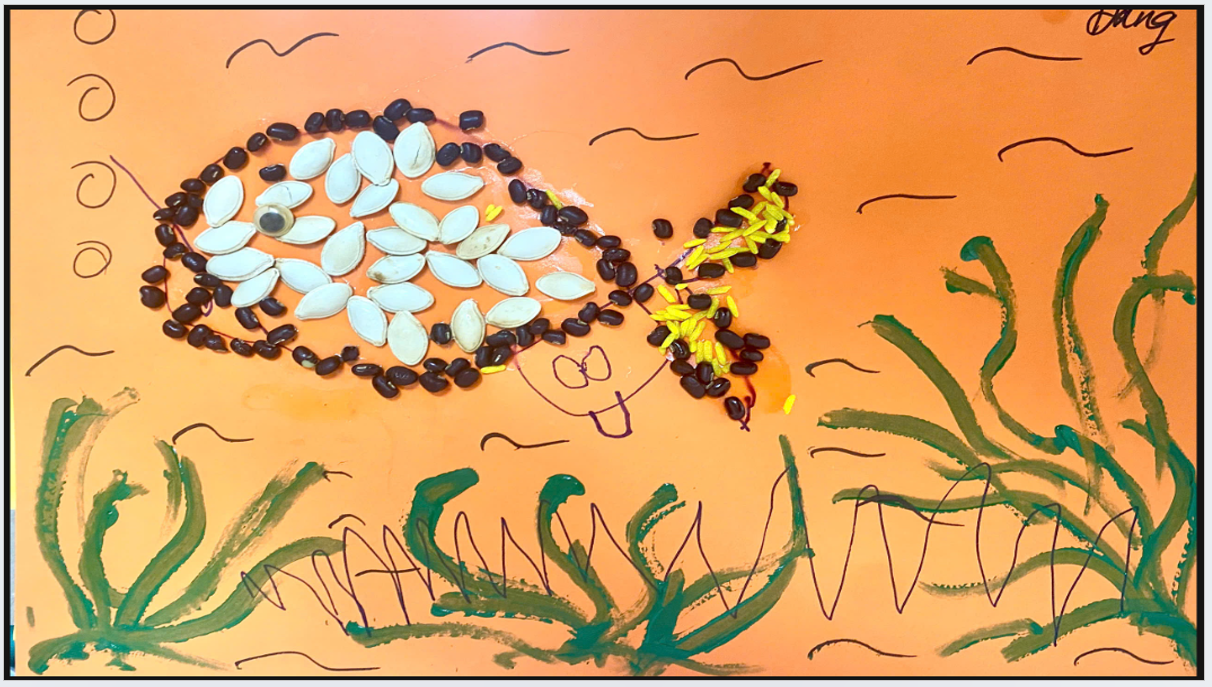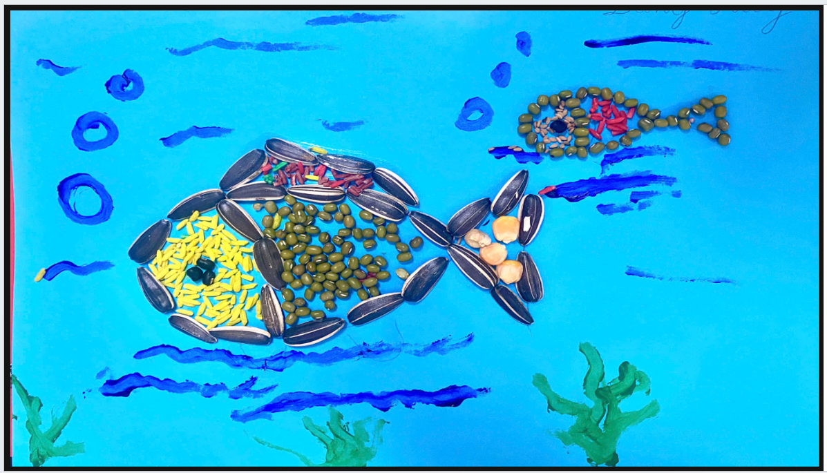 Có bạn sáng tạo tranh đàn cá bơi lội trong hồ, từ hạt bí dùng làm vảy cá, hạt gạo các màu làm vây cá…🐠