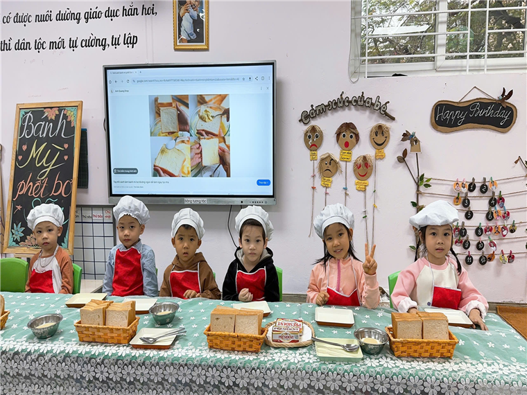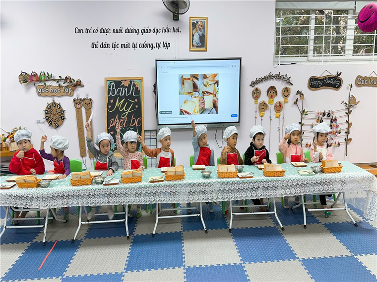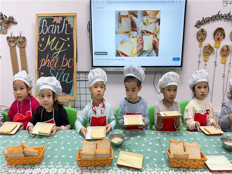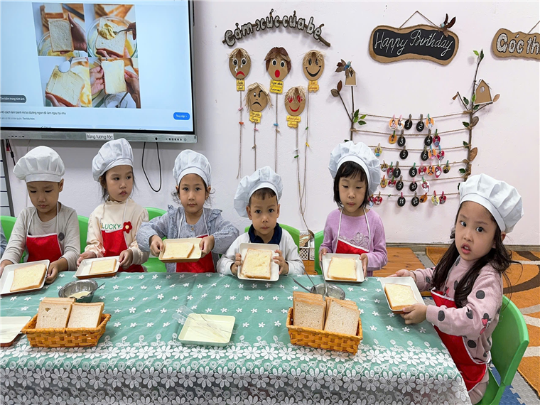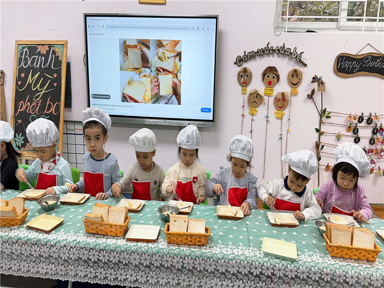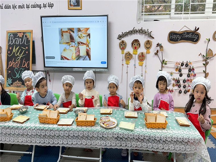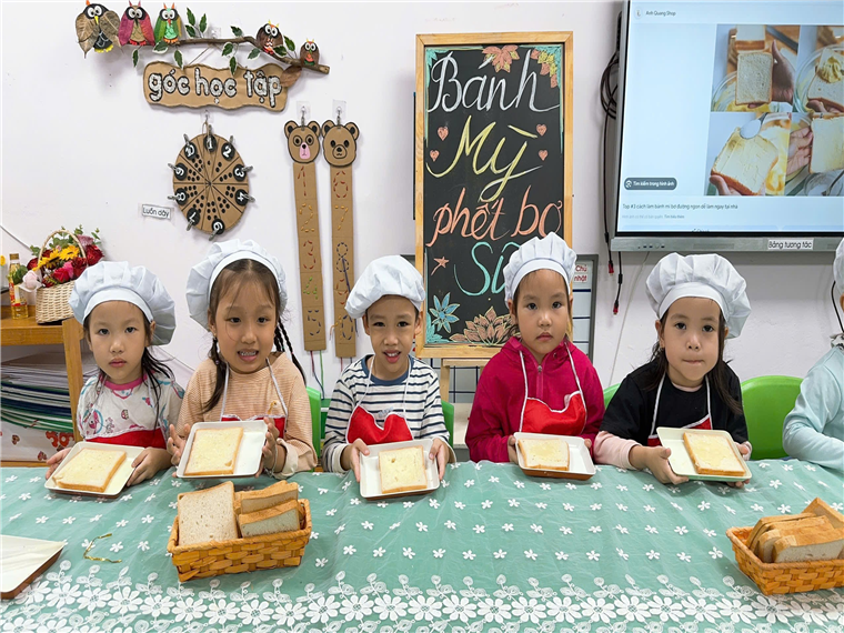 Vì lẽ đó mà các cô giáo lớp B2 trường mầm non Họa Mi đã tổ chức cho các bé tập làm nội trợ món” Bánh mỳ phết bơ sữa” ngay tại lớp. Ngay từ lúc chuẩn bị các bé đã rất háo hức, tò mò muốn được tham gia ngay vào thực hành. Việc thực hành tập làm nội trợ ở tại lớp học sẽ giúp trẻ :