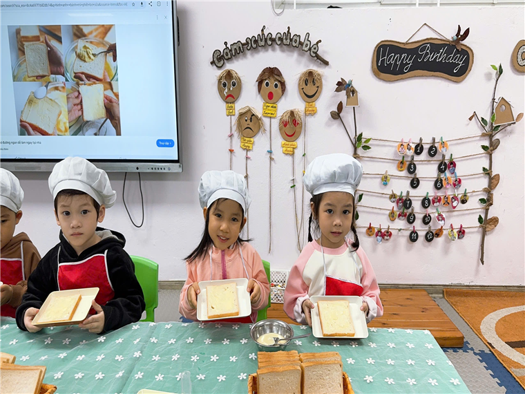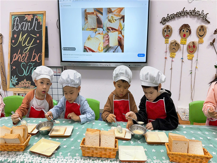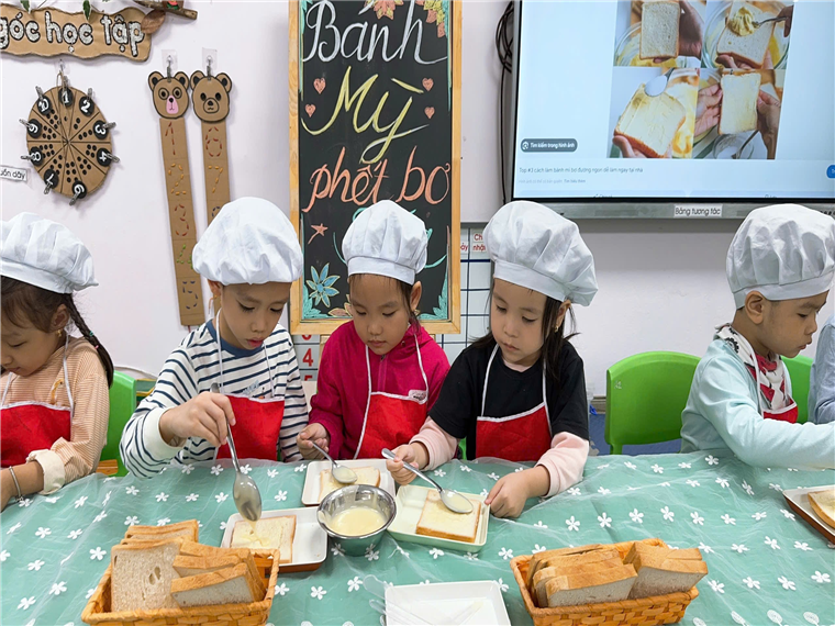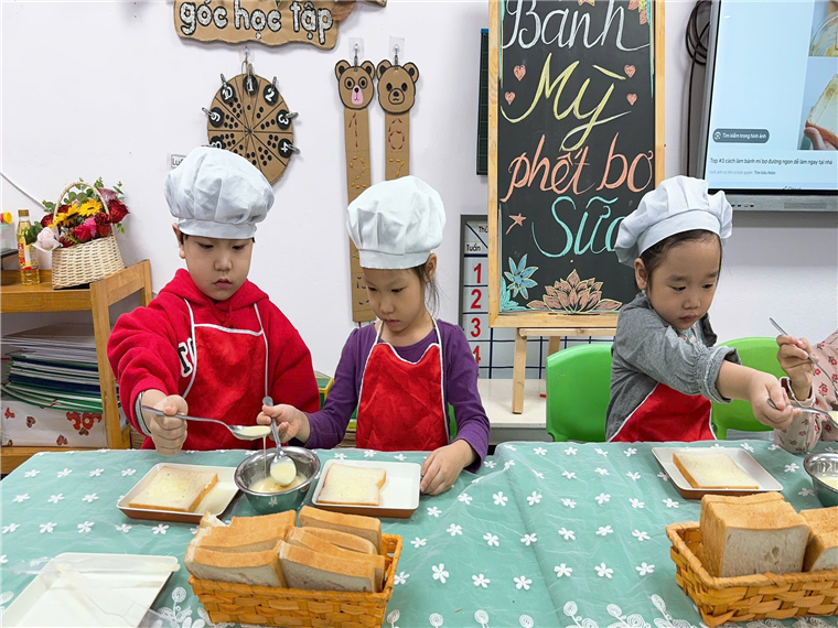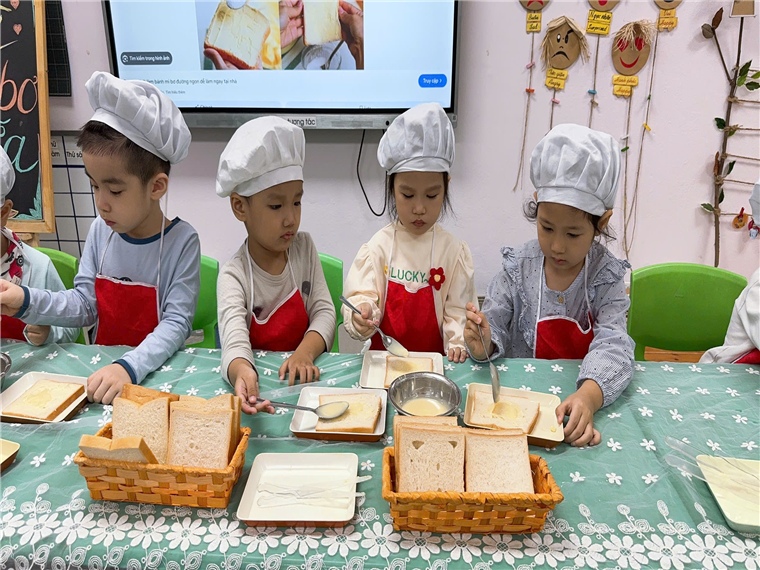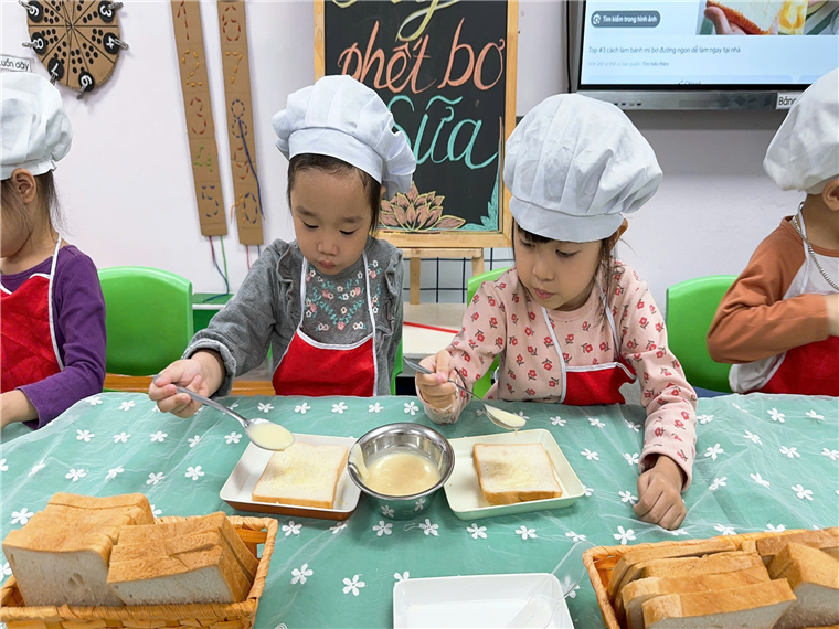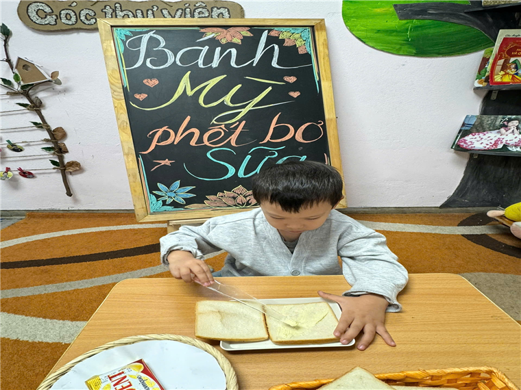 Khi được tham gia vào các hoạt động nội trợ như rửa chén, lau dọn, nấu ăn hoặc dọn dẹp...., trẻ sẽ học cách tự chăm sóc bản thân và không phụ thuộc vào người khác trong những công việc hàng ngày. Điều này giúp trẻ xây dựng sự tự tin và khả năng độc lập từ khi còn nhỏ như: trẻ được sử dụng dao tự phết bơ, dùng thìa múc sữa dưới sự hướng dẫn của cô giáo.