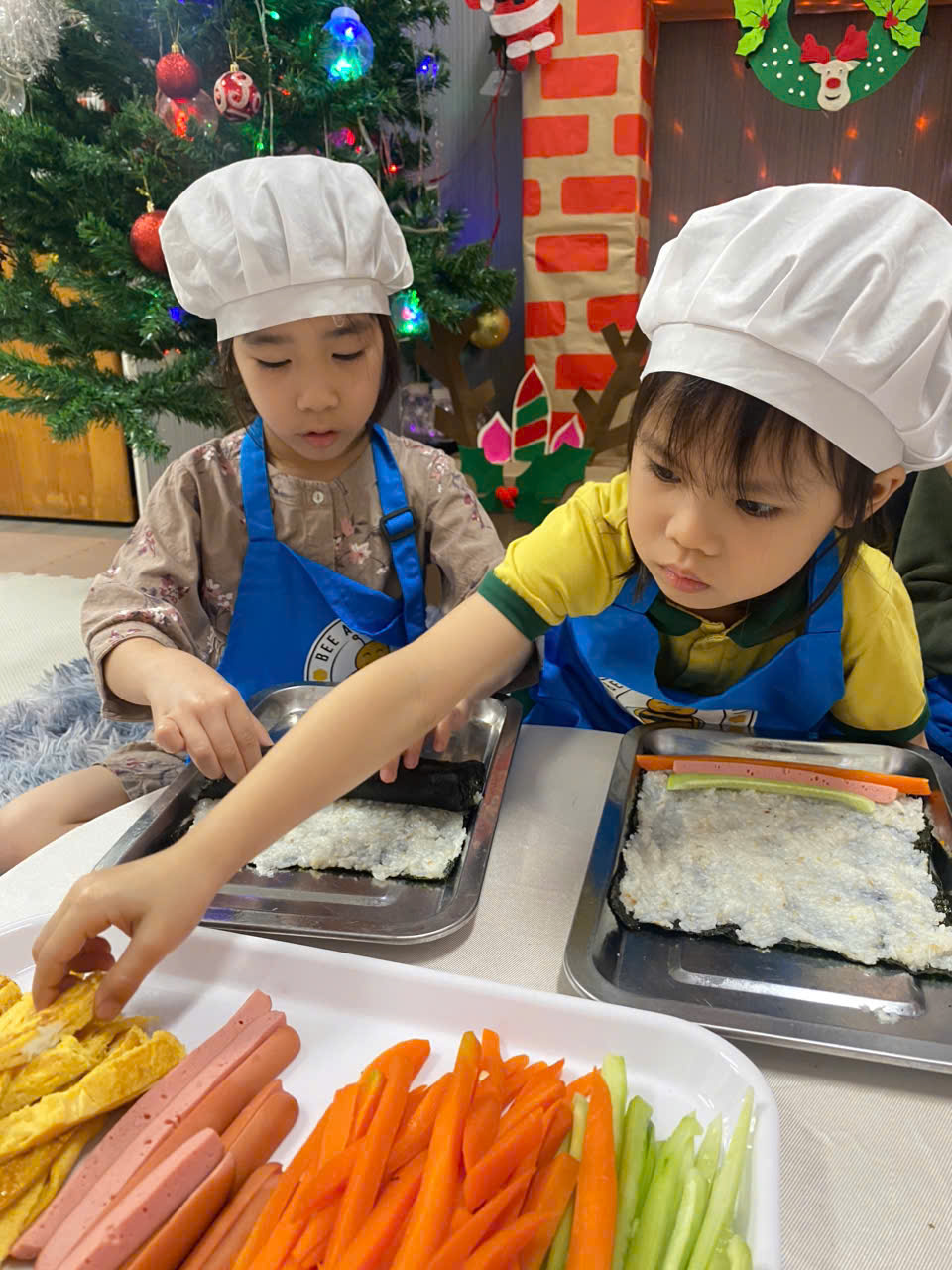 Dưới hướng dẫn của các cô, đôi bàn tay bé nhỏ của các con đã tự mình làm ra những cuốn cơm thơm ngon đầy đủ chất dinh dưỡng mà còn rất đẹp mắt.