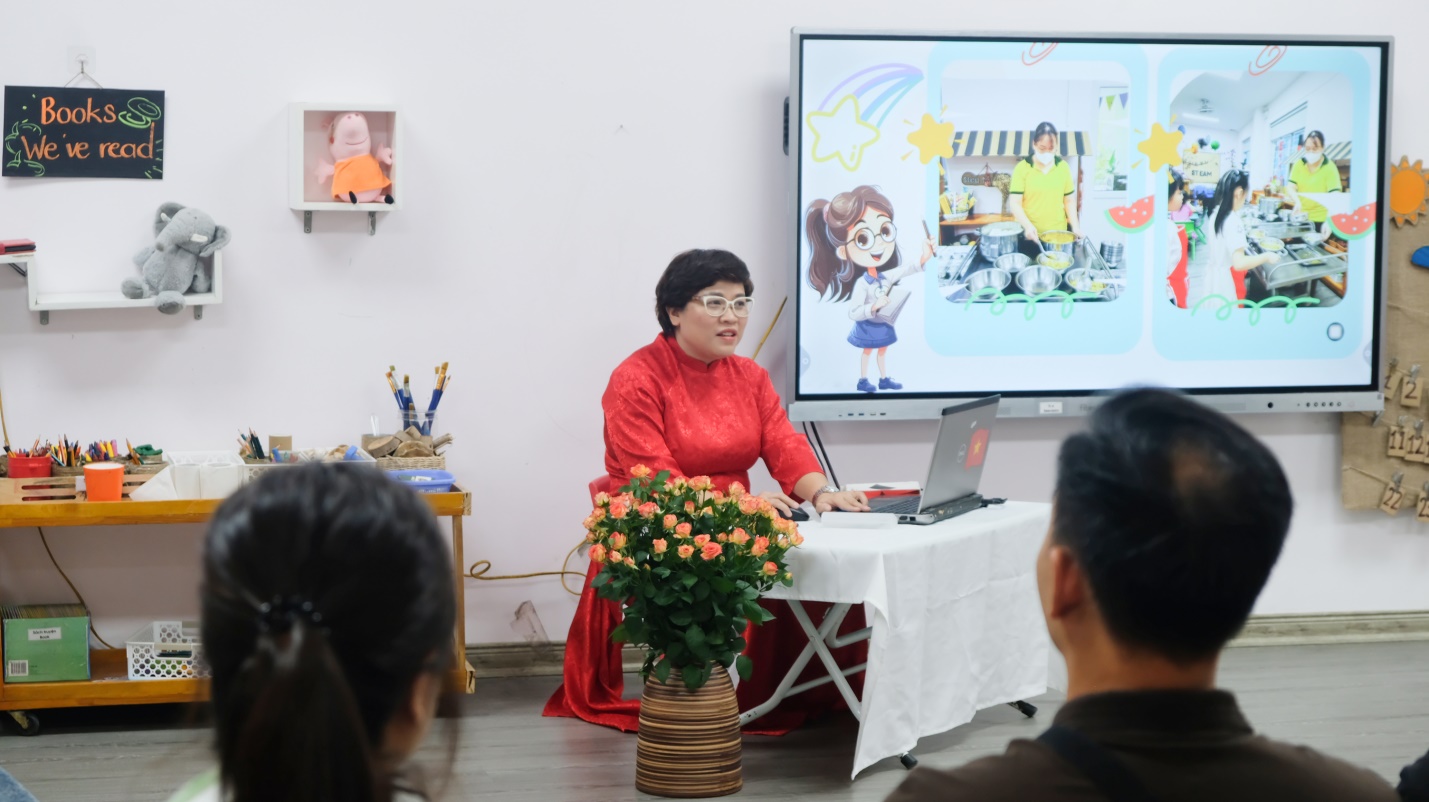 Tiếp theo, không khí buổi họp trở nên sôi nổi và xúc động khi cô giáo giới thiệu hai clip ngắn: một clip tổng kết thành tích xuất sắc của nhà trường trong năm học vừa qua, và một clip về chế độ dinh dưỡng khoa học, hợp lý dành cho các bé tại trường. Những hình ảnh chân thực ấy đã giúp phụ huynh thêm yên tâm và tin tưởng vào sự chăm sóc, giáo dục toàn diện mà các con đang được hưởng.