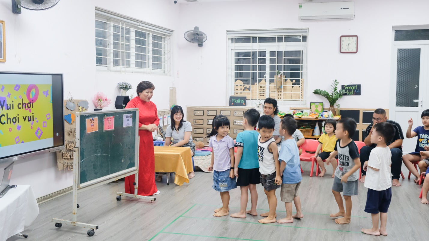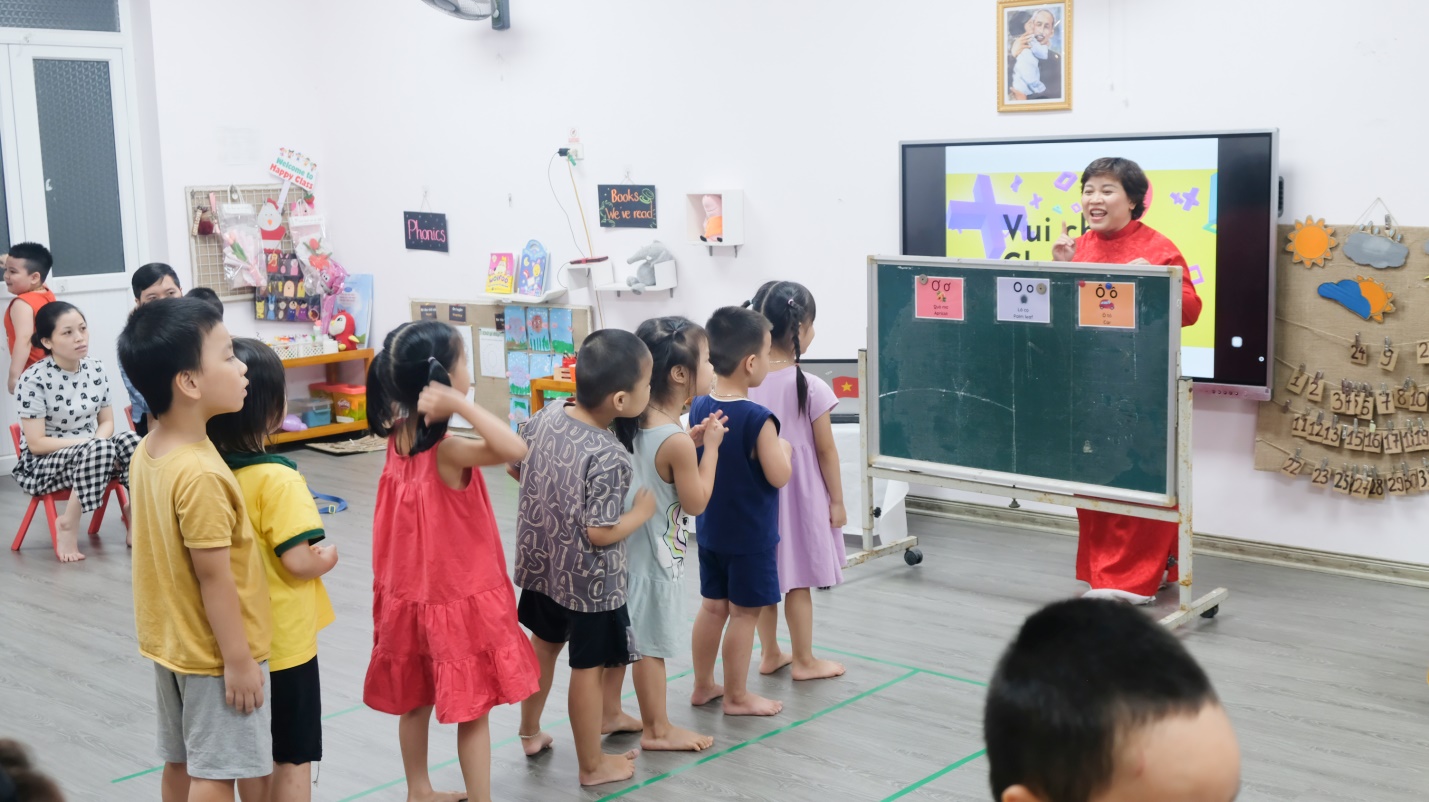 Điểm nhấn đáng yêu của buổi họp chính là phần tham gia của các con học sinh. Các bé đã hào hứng với trò chơi vận động “Nhảy chữ”: khi cô giáo đọc tên chữ cái (O, Ô, Ơ), các con nhanh nhẹn nhảy về phía chữ đó. Tiếng cười trong trẻo, ánh mắt rạng rỡ của các bé đã làm cho không khí thêm gần gũi, gắn kết, lan tỏa niềm vui đến tất cả mọi người.
