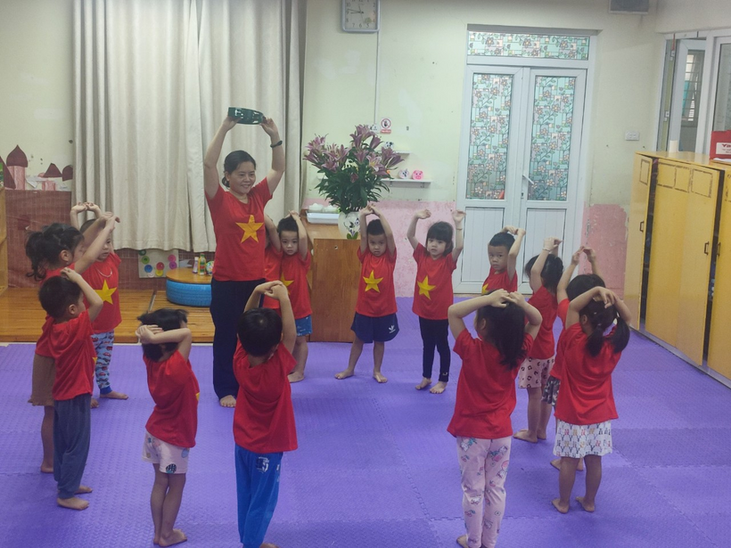 Sau phần giới thiệu đầy hứng khởi, cô hướng dẫn các con khởi động theo nền nhạc “Baby shark”. Hoạt động này các con được thực hiện thường xuyên nên bạn nào cũng thành thạo, thuộc động tác và rất hào hứng.