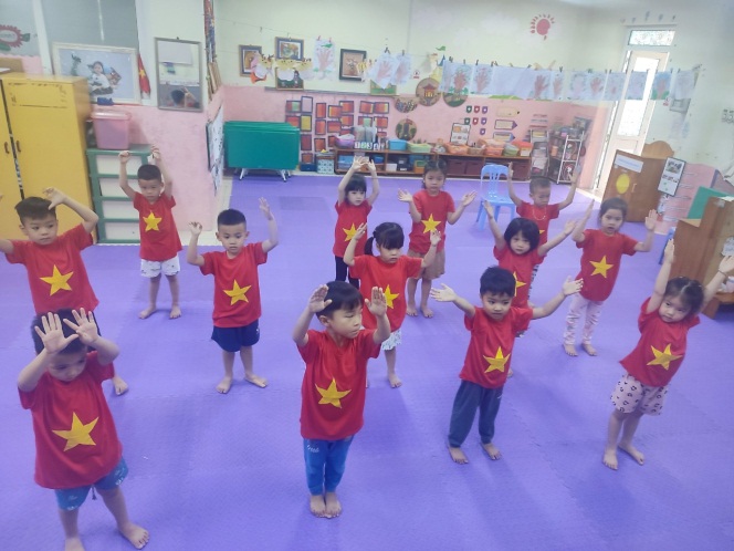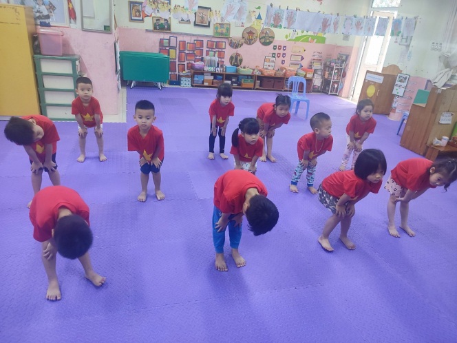Khi các con ổn định về hàng, cô hướng dẫn cả lớp tập bài thể dục theo nhạc bài “ Johny Johny yes PaPa” Các con đều tập rất đúng nhịp và động tác đúng kĩ thuật.