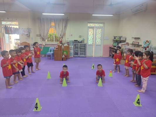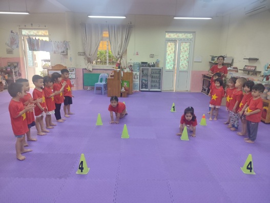 Bạn nào chưa nắm được kĩ thuật sẽ được cô hướng dẫn tỉ mỉ. Khi đã tập luyện thành thạo, các con còn được thi đua với nhau xem bạn nào bò nhanh đúng kĩ thuật hơn.