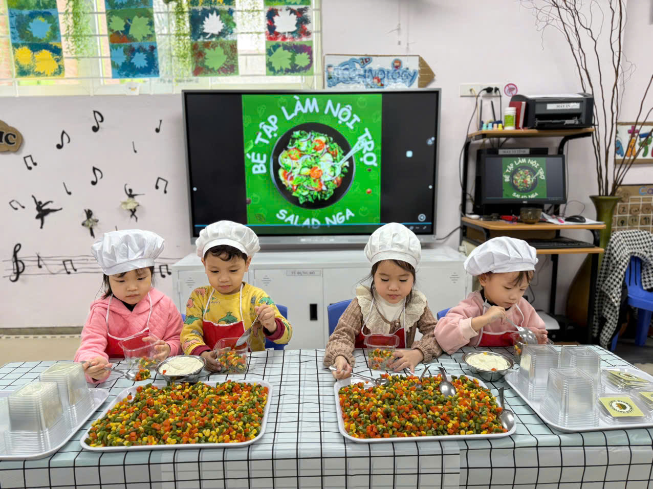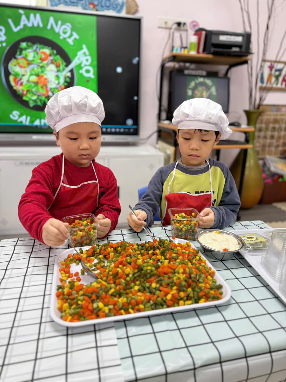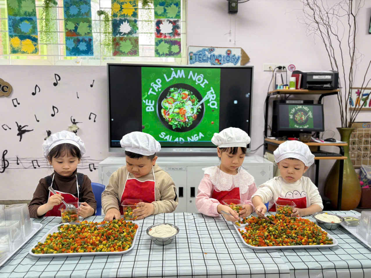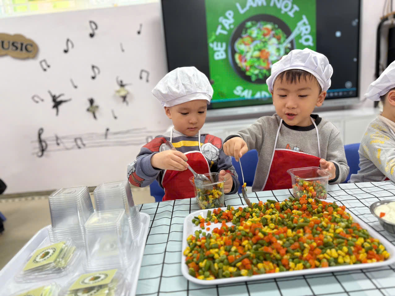 Hôm nay các bé lớp B1 được trải nghiệm làm salad trộn. Món salad trộn sẽ mang đến cho các con một trải nghiệm hoàn toàn mới lạ và bất ngờ. Vị ngọt mát của các loại rau củ quả như quả đậu xanh, cà rốt,ngô ngọt,đậu hà lan và không thể thiếu magiơne để khi trộn món ăn sẽ ngon hơn. Món ăn không chỉ thơm ngon mà còn rất bổ dưỡng, cung cấp nhiều vitamin thiết yếu cho cơ thể và đặc biệt thích hợp cho các con . Ngoài ra, cách làm rất đơn giản, không tốn quá nhiều thời gian.