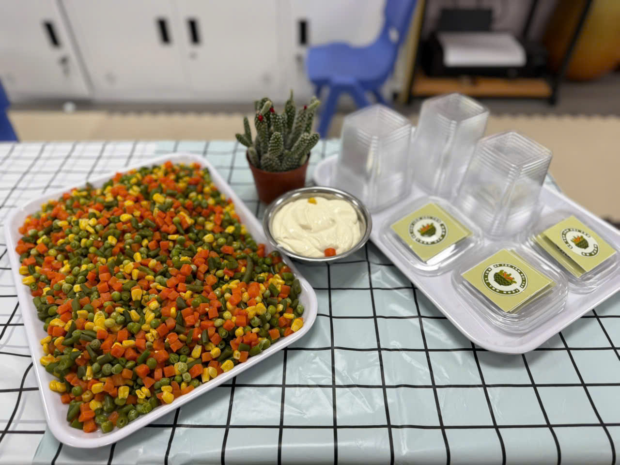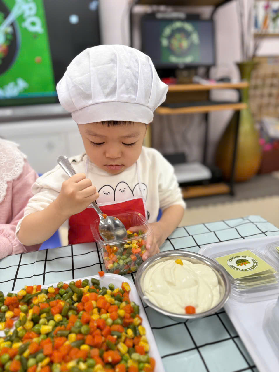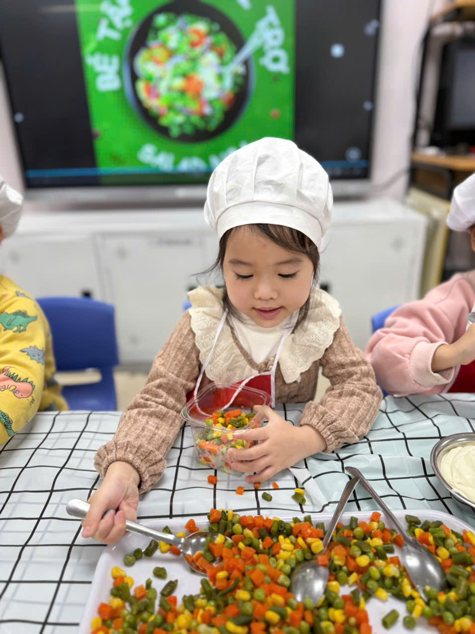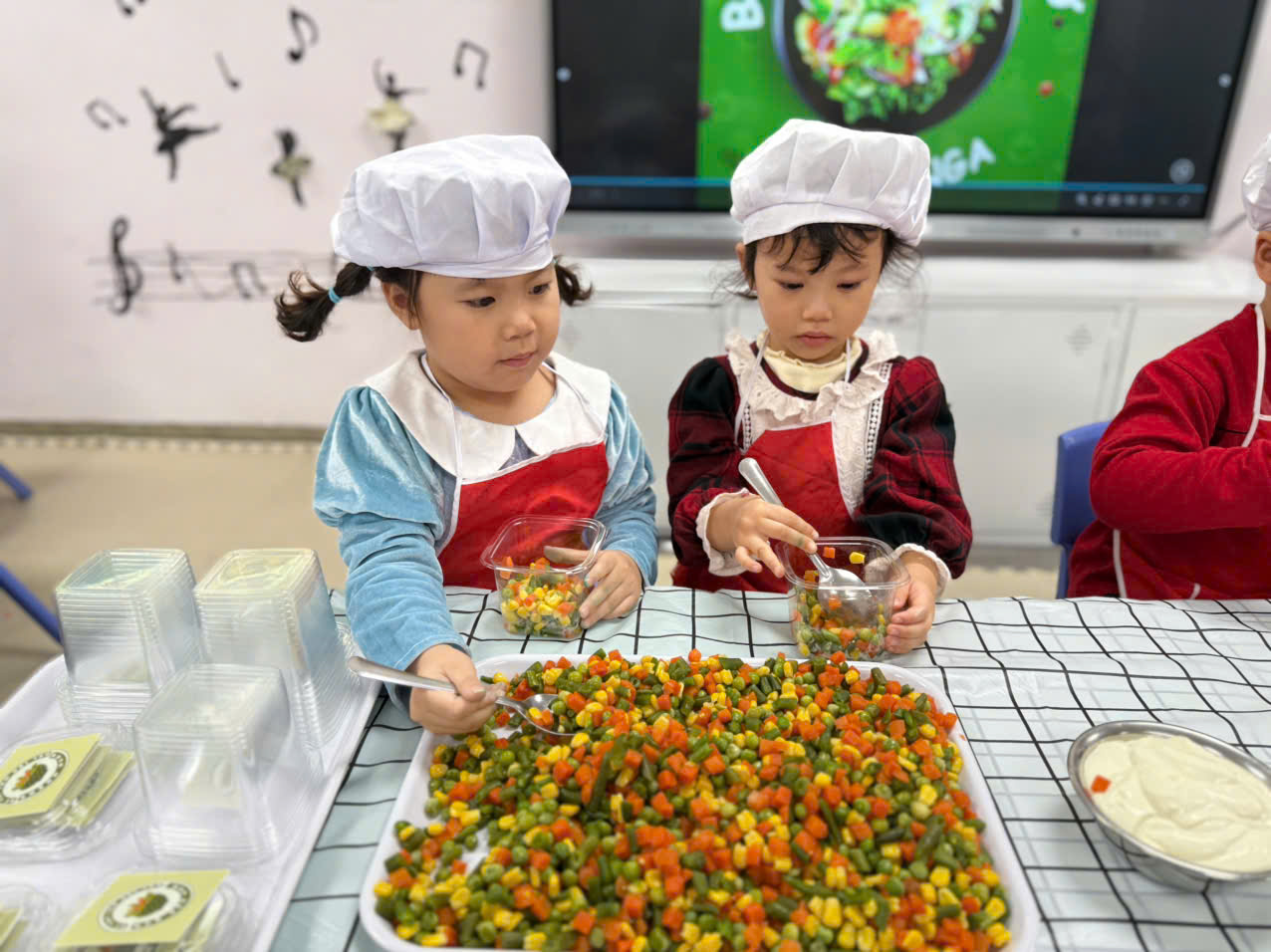 Hôm nay các bé lớp B1 được trải nghiệm làm salad trộn. Món salad trộn sẽ mang đến cho các con một trải nghiệm hoàn toàn mới lạ và bất ngờ. Vị ngọt mát của các loại rau củ quả như quả đậu xanh, cà rốt,ngô ngọt,đậu hà lan và không thể thiếu magiơne để khi trộn món ăn sẽ ngon hơn. Món ăn không chỉ thơm ngon mà còn rất bổ dưỡng, cung cấp nhiều vitamin thiết yếu cho cơ thể và đặc biệt thích hợp cho các con . Ngoài ra, cách làm rất đơn giản, không tốn quá nhiều thời gian.