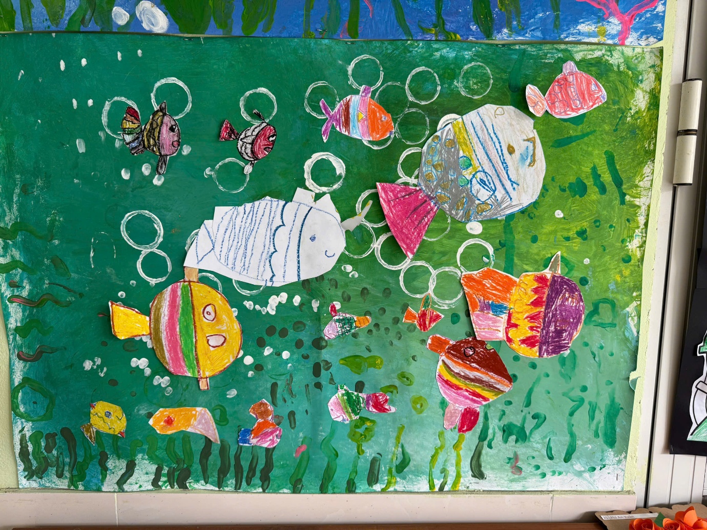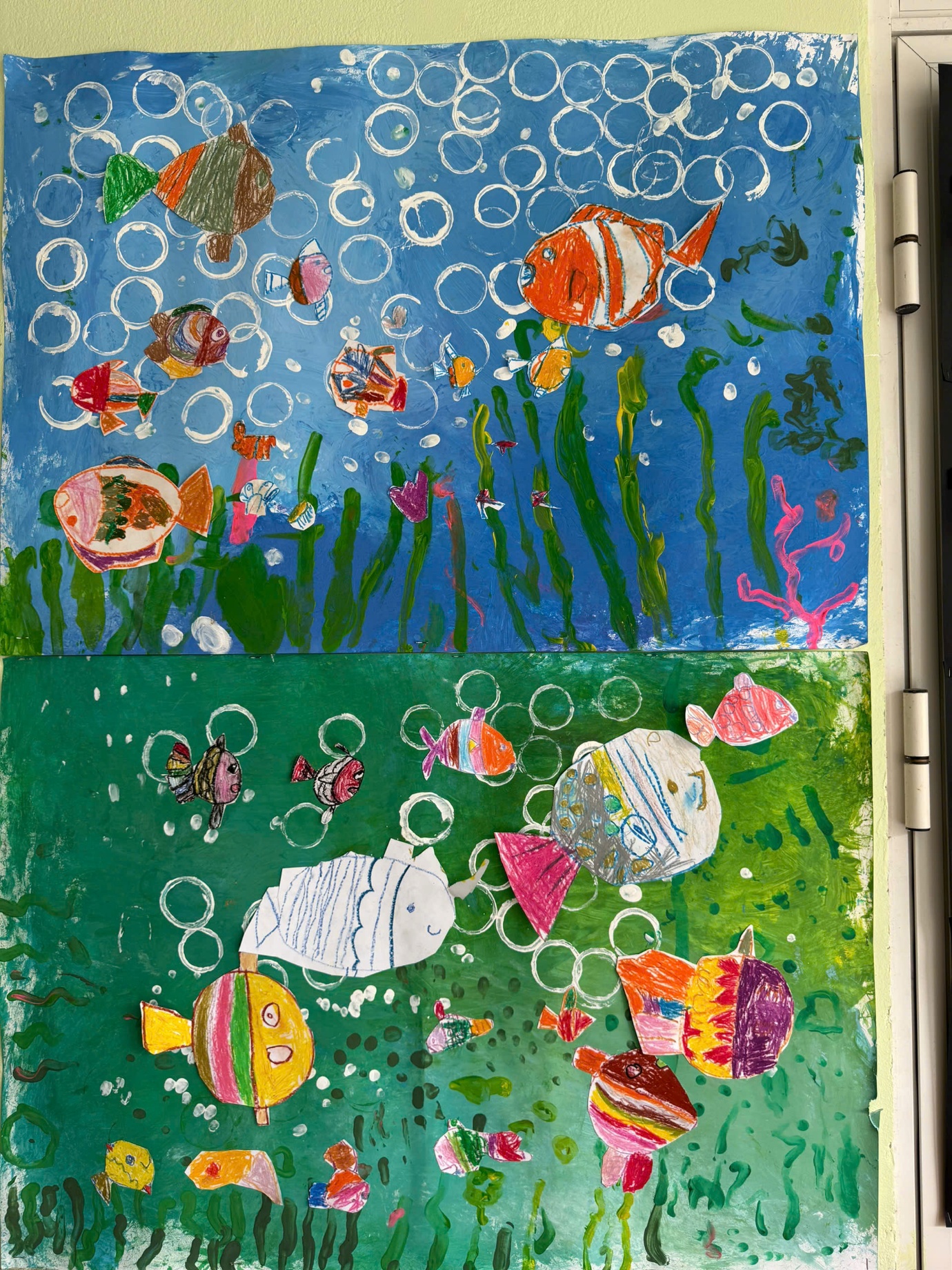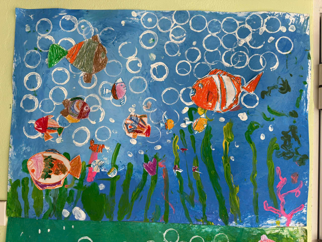 Sau khi hoàn thiện, trẻ tiến hành cắt, dán và trang trí hình con cá bằng giấy màu và các vật liệu trang trí khác. Mỗi trẻ lựa chọn họa tiết và màu sắc theo ý tưởng riêng, góp phần tạo nên bố cục phong phú của bức tranh chung.