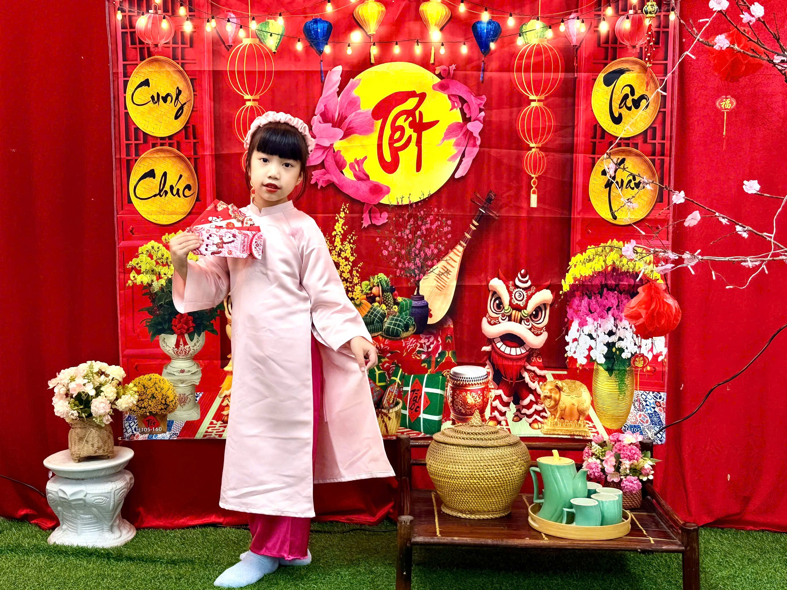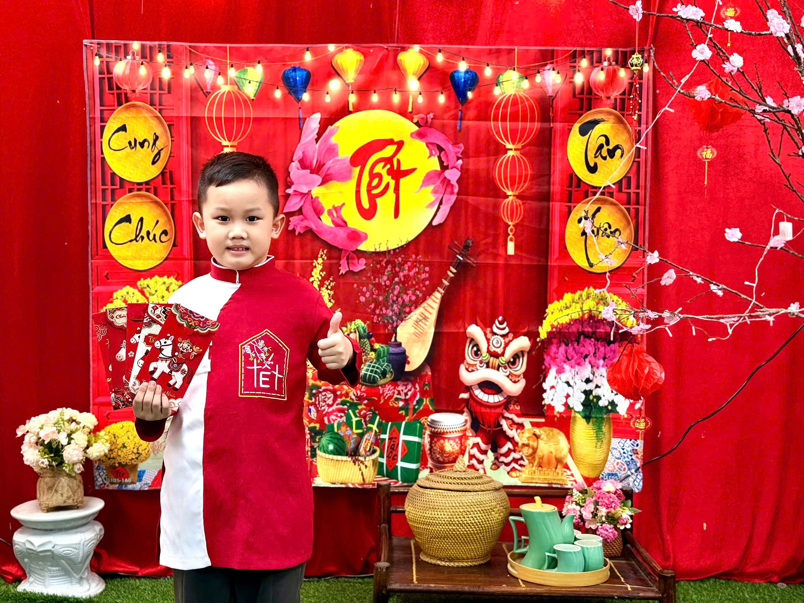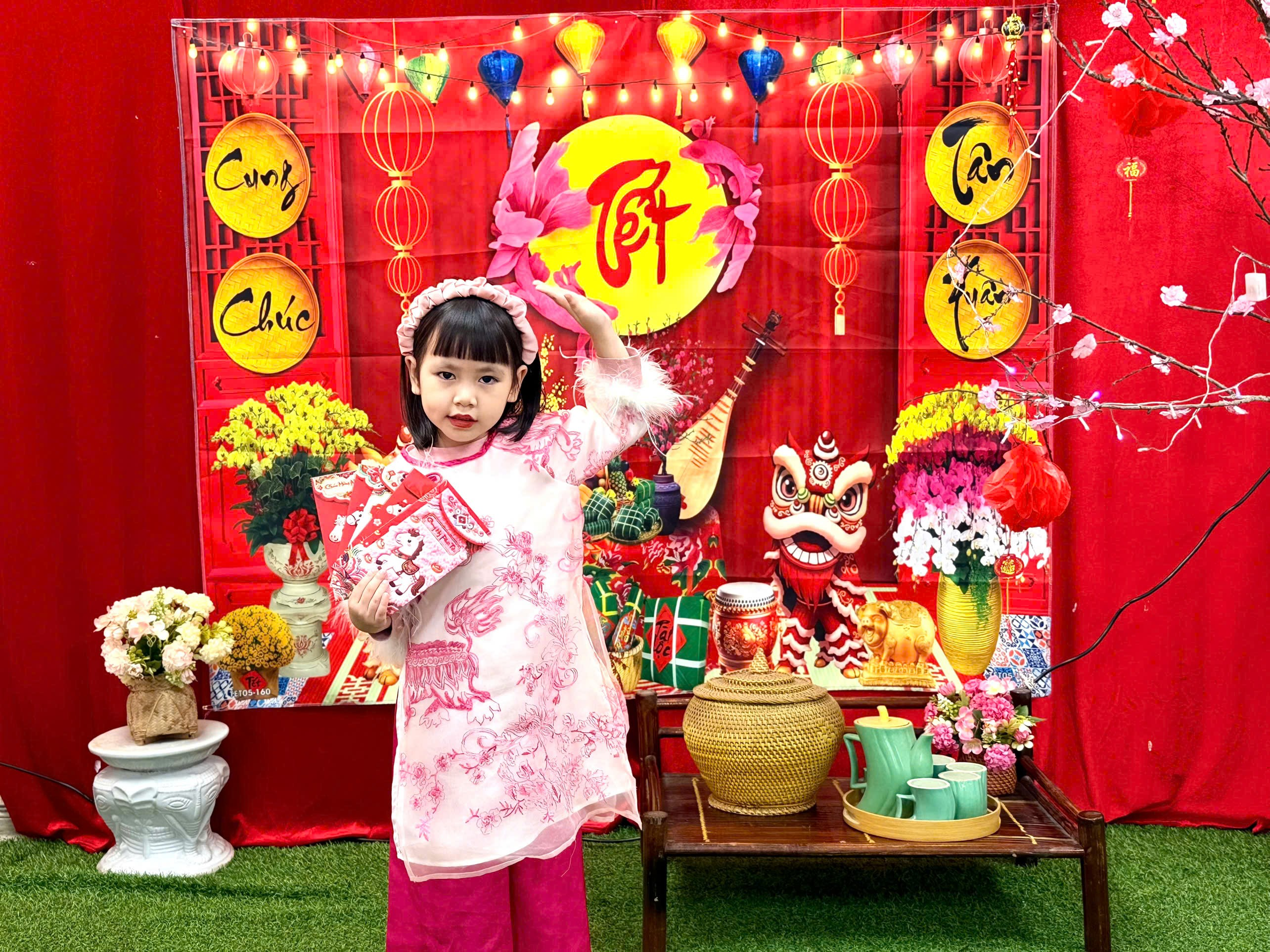Trong tà áo dài xinh xắn, các con hân hoan chào cô, chào bạn. Những phong bao lì xì đỏ thắm trao tay không chỉ mang ý nghĩa may mắn, mà còn gửi gắm lời chúc: