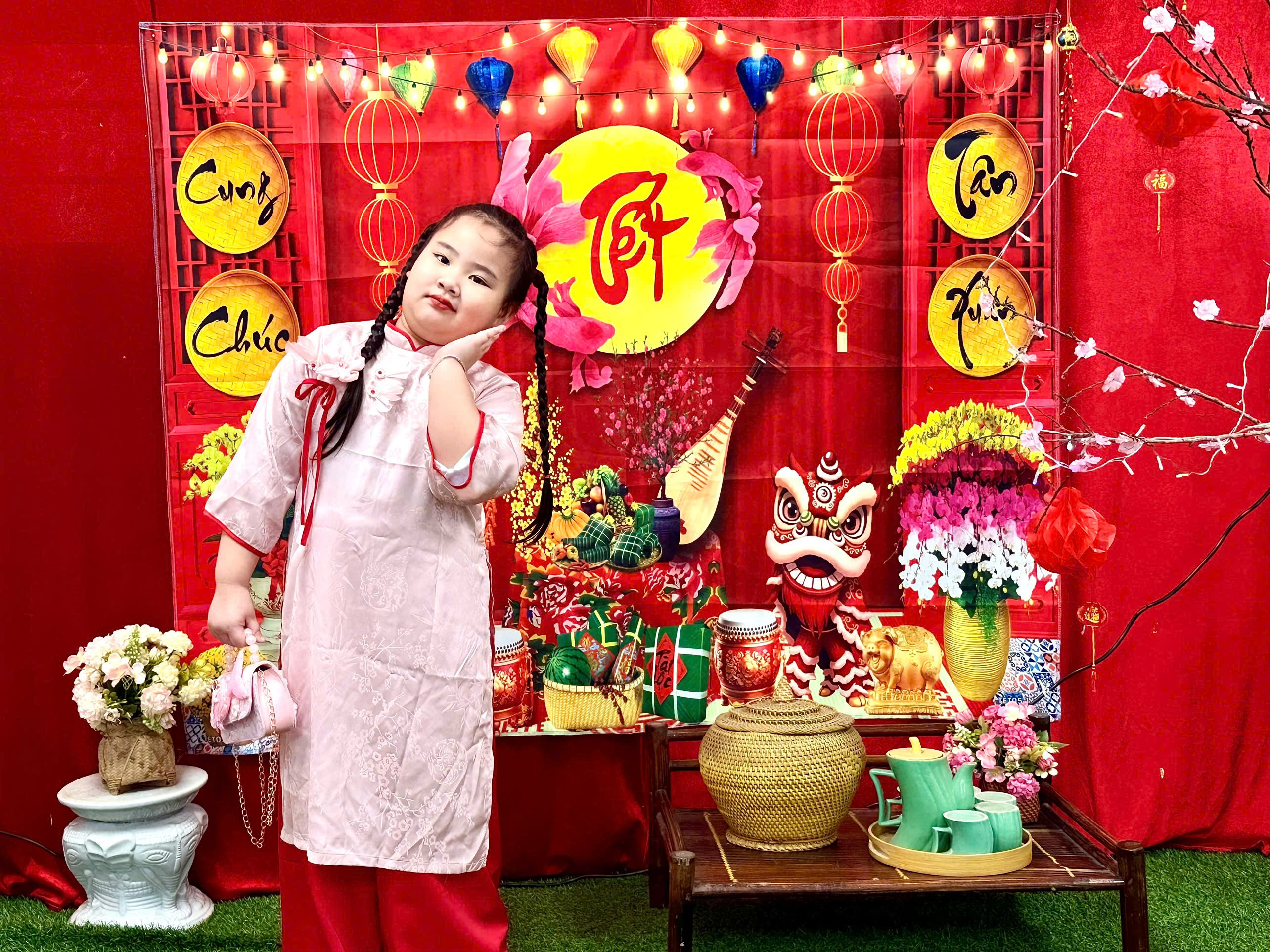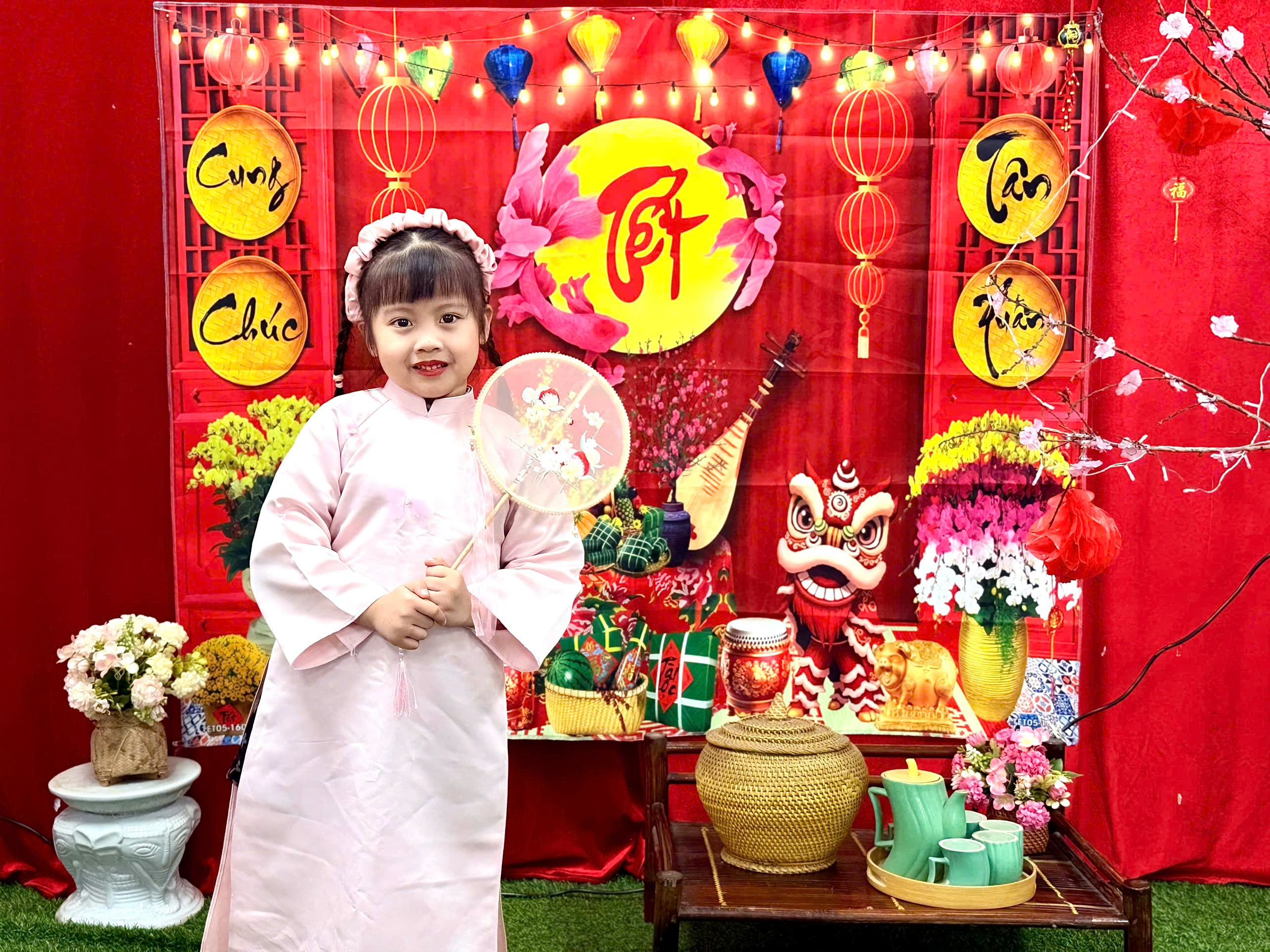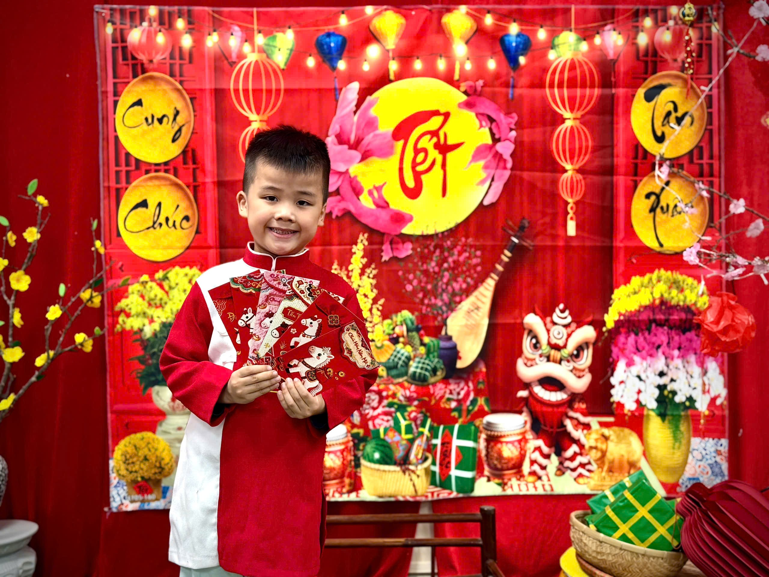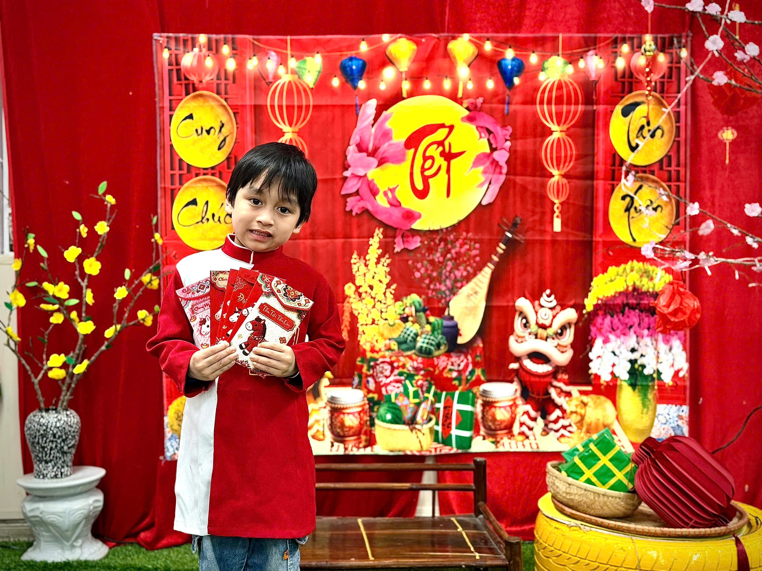 Trong tà áo dài xinh xắn, các con hân hoan chào cô, chào bạn. Những phong bao lì xì đỏ thắm trao tay không chỉ mang ý nghĩa may mắn, mà còn gửi gắm lời chúc: