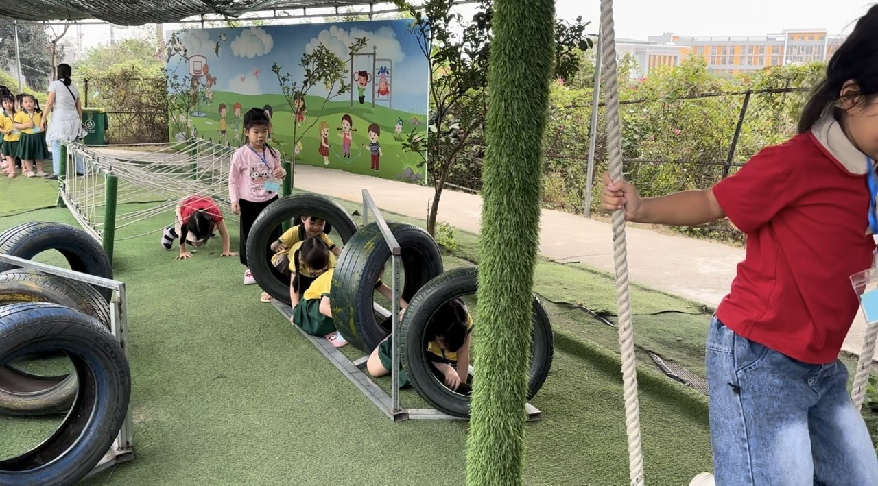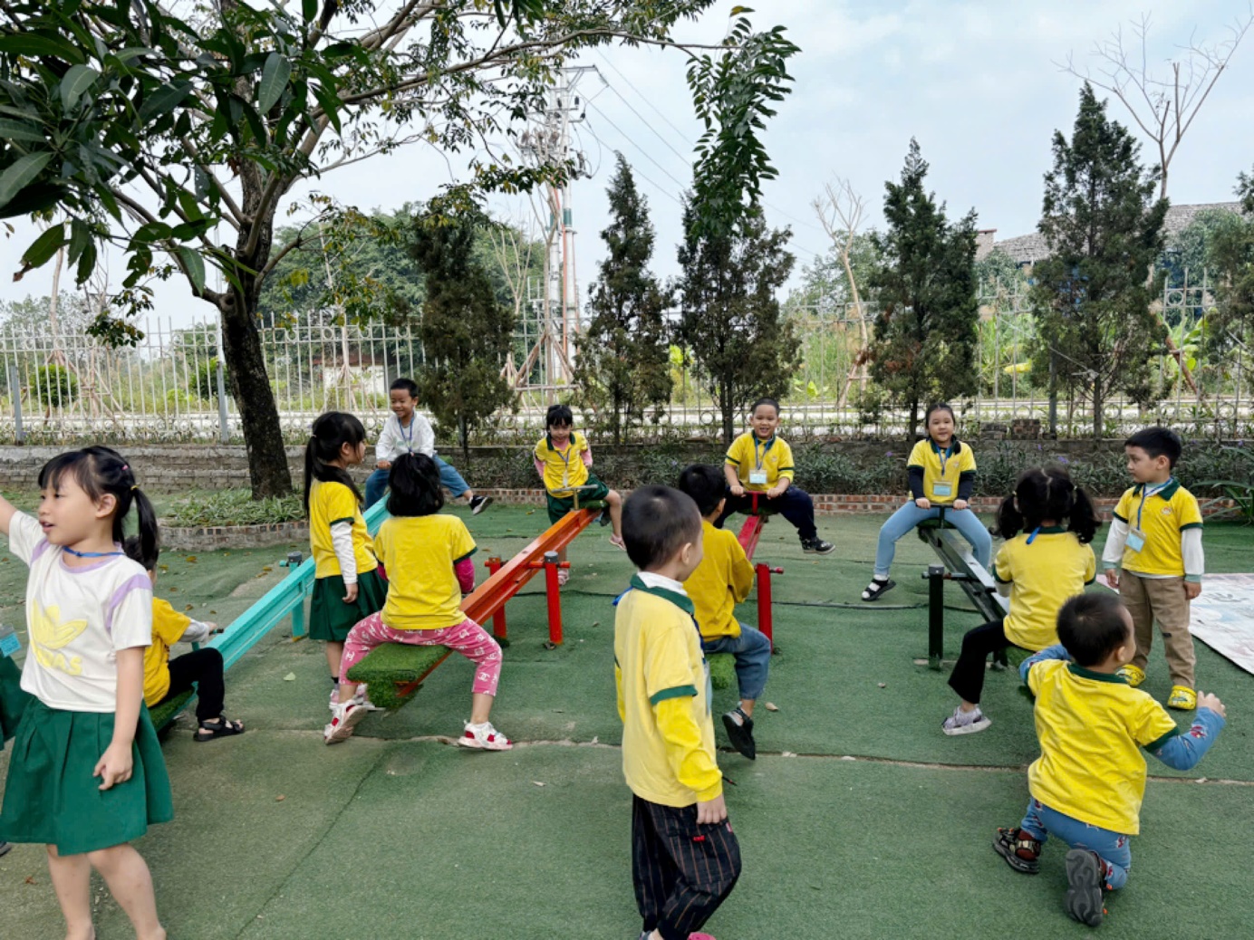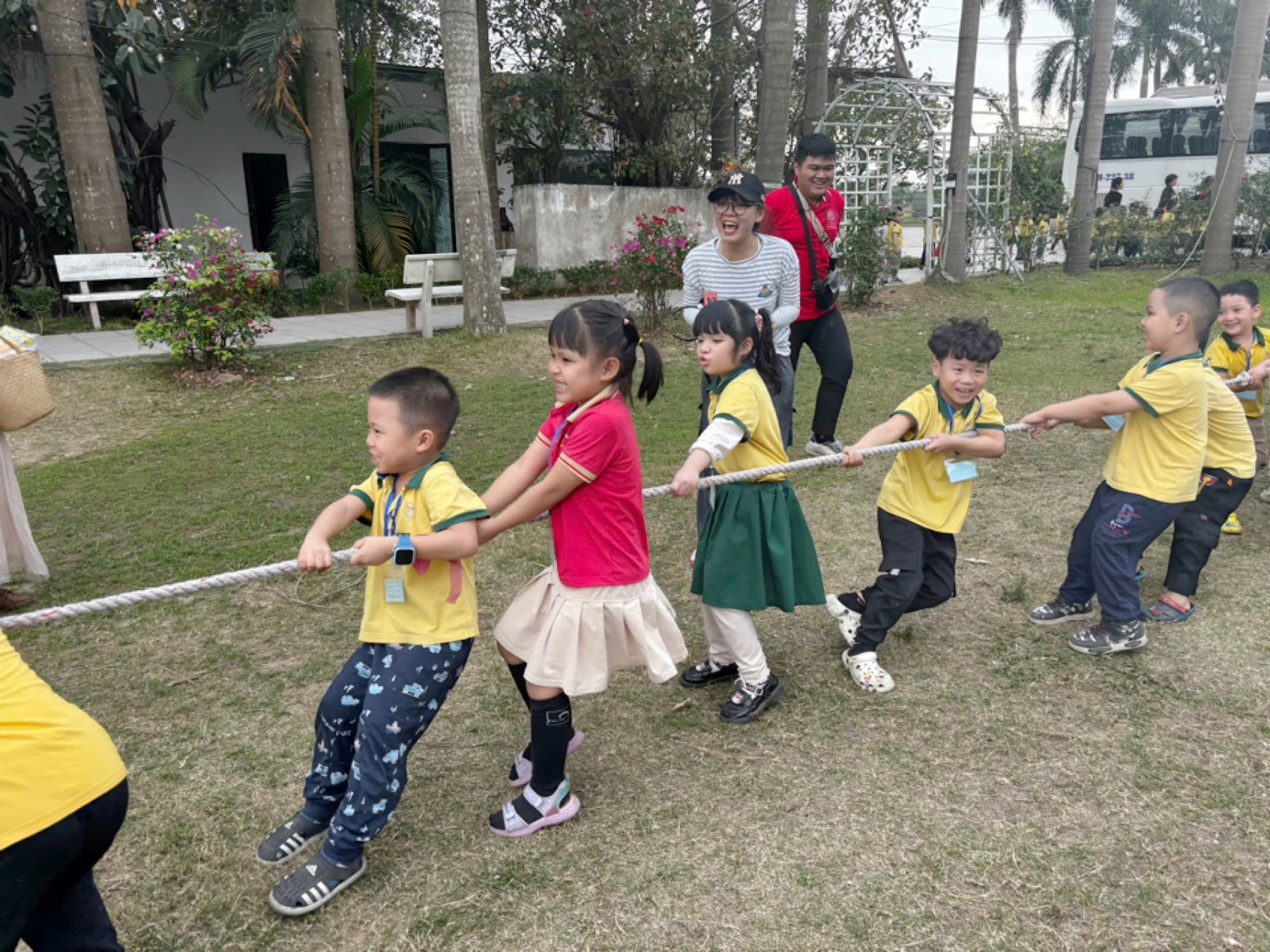 Buổi chiều, các bé được tham gia các trò chơi ngoài trời như kéo co, đi thuyền. Những trò chơi này không chỉ giúp các bé vận động mà còn dạy các bé về sự hợp tác và tinh thần đồng đội. Cả nhóm bé đều thích thú khi được chơi cùng nhau, và tiếng cười vang khắp khu vực.