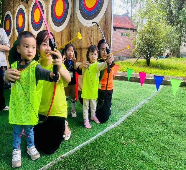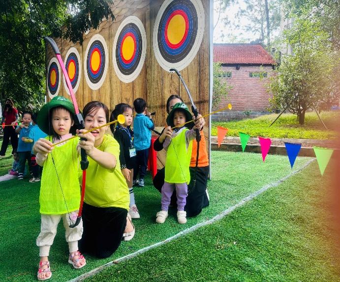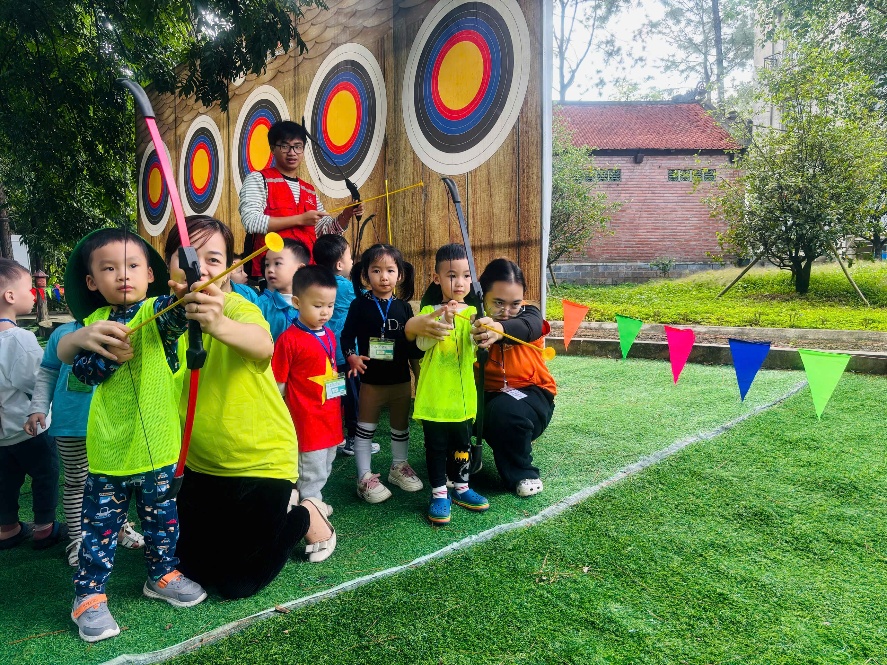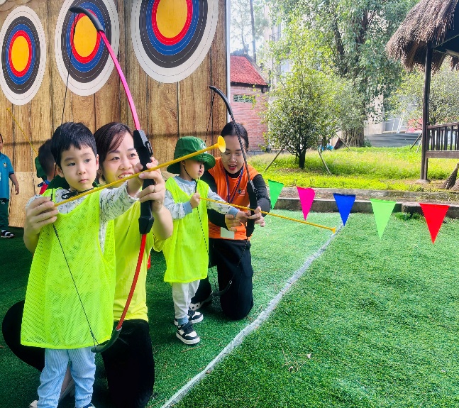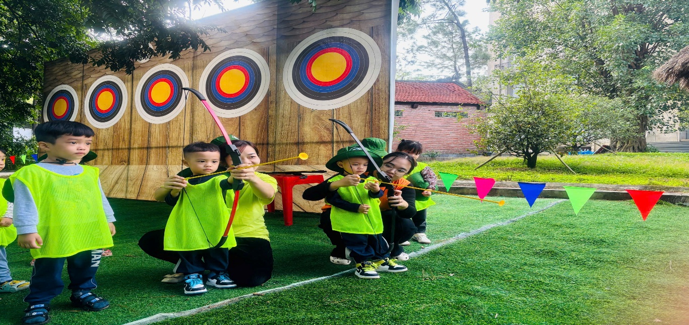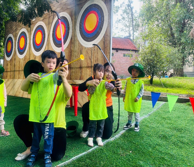 Các bé được hóa thân thành những cung thủ tí hon, tay cầm cung, mắt sáng rực khi mũi tên đầu tiên chạm đích