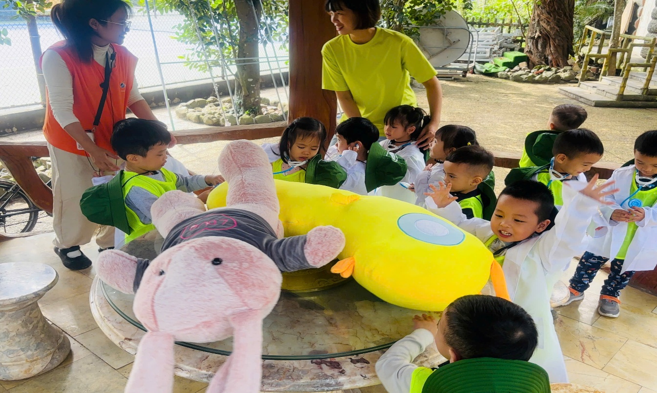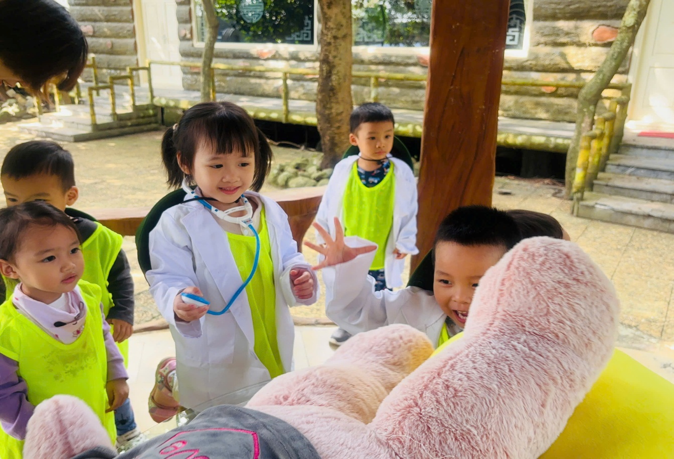 . Tiếp đó, trong vai những bác sĩ thú y nhỏ tuổi, các bé cẩn thận “khám bệnh” cho những chú thỏ, chú cún dễ thương – học cách yêu thương và chăm sóc các loài vật quanh mình. 🐰🐶