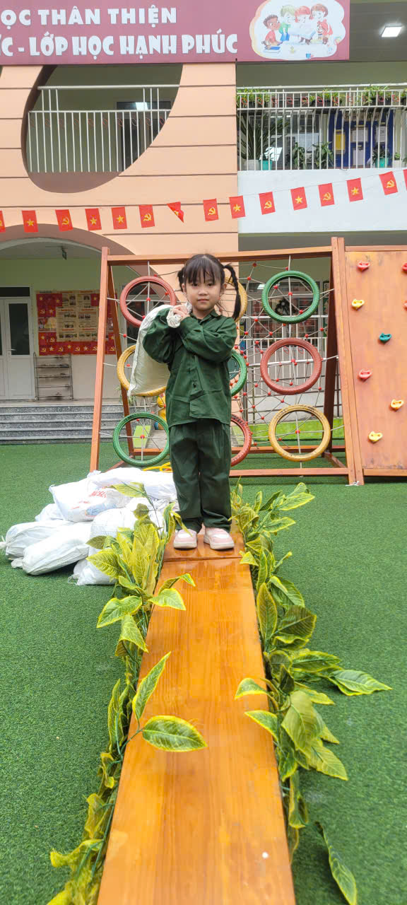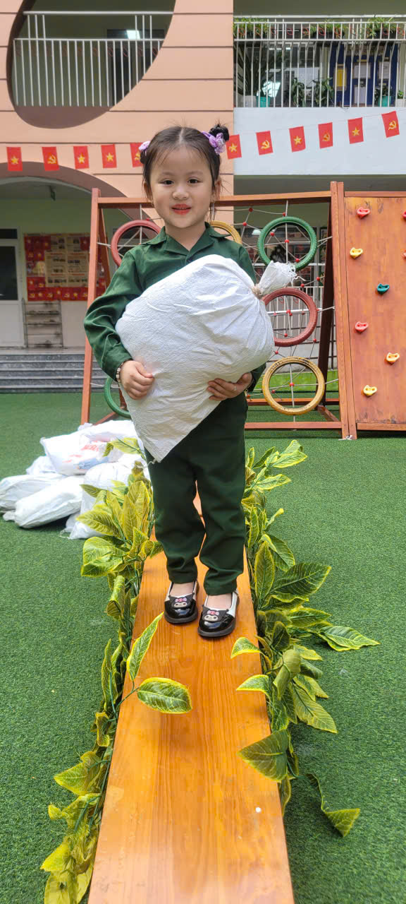 Theo hiệu lệnh “Bắt đầu nhiệm vụ!”, các “chiến sĩ nhí” lần lượt thực hiện các thử thách: chạy zic-zac, đi thăng bằng trên ghế thể dục, bò chui qua cổng vòm, lấy cờ và nhanh chóng chạy về cột mốc để cắm cờ rồi quay lại vị trí xuất phát. Các con tham gia rất nghiêm túc, tuân thủ đúng luật chơi: không bỏ qua chướng ngại vật, thực hiện đúng trình tự, thể hiện tinh thần kỷ luật và ý thức tập thể đáng khen ngợi.