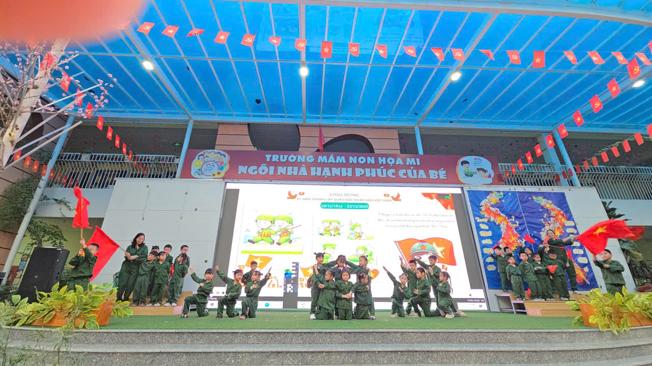Tiết mục đã huy động 100% học sinh cùng 2 cô giáo của lớp tham gia, tạo nên một màn biểu diễn đồng đều, gắn kết và đầy cảm xúc. Trên khuôn mặt các con ánh lên niềm phấn khởi, tự hào, có hồi hộp, có háo hức nhưng trên hết là sự quyết tâm và tinh thần tập thể rõ nét. Khi âm nhạc vang lên, từng động tác của các con không chỉ là những bước nhảy mà còn là sự thể hiện tình yêu với Tổ quốc, lòng biết ơn đối với các chú bộ đội – những người đã và đang ngày đêm bảo vệ bình yên cho đất nước.