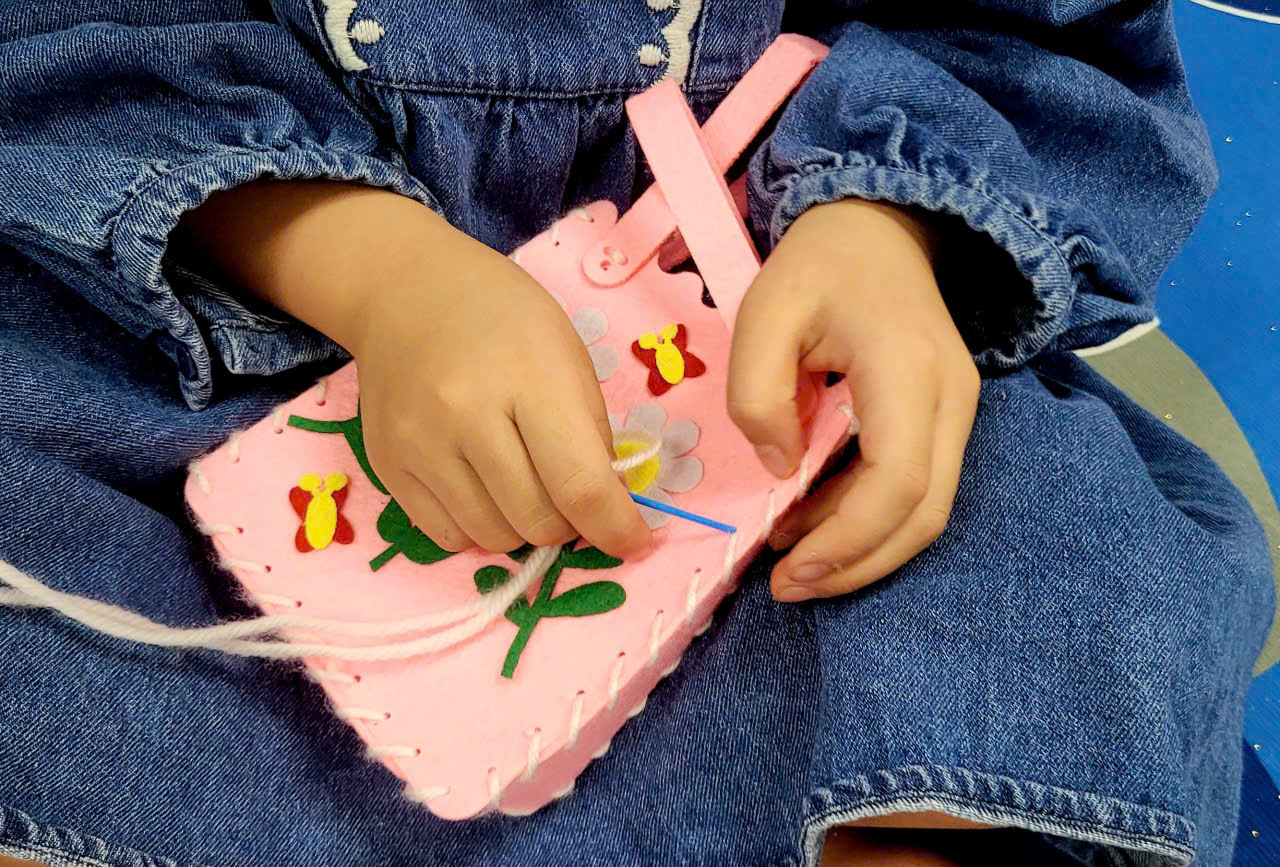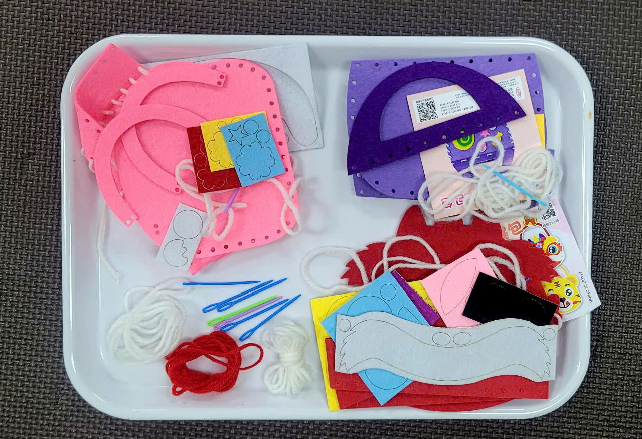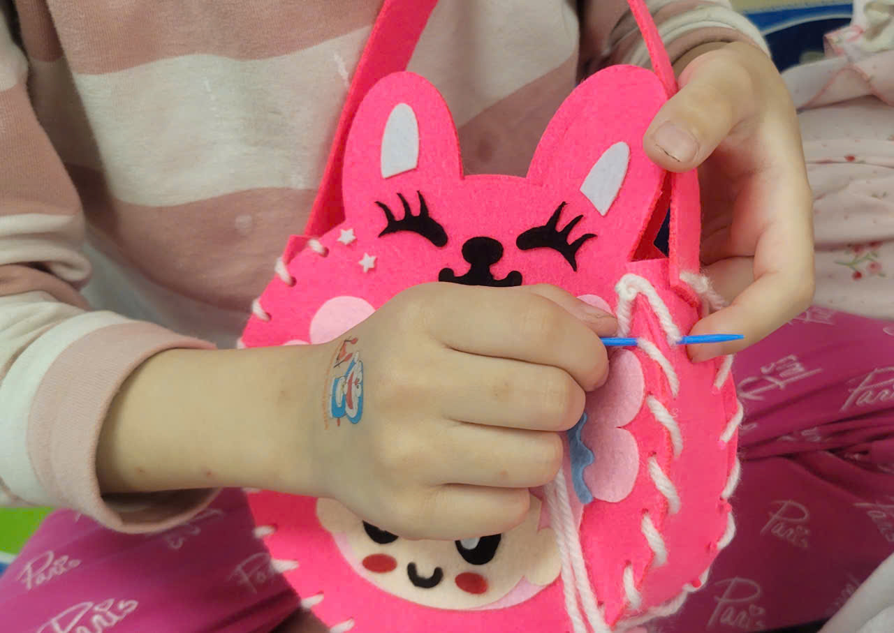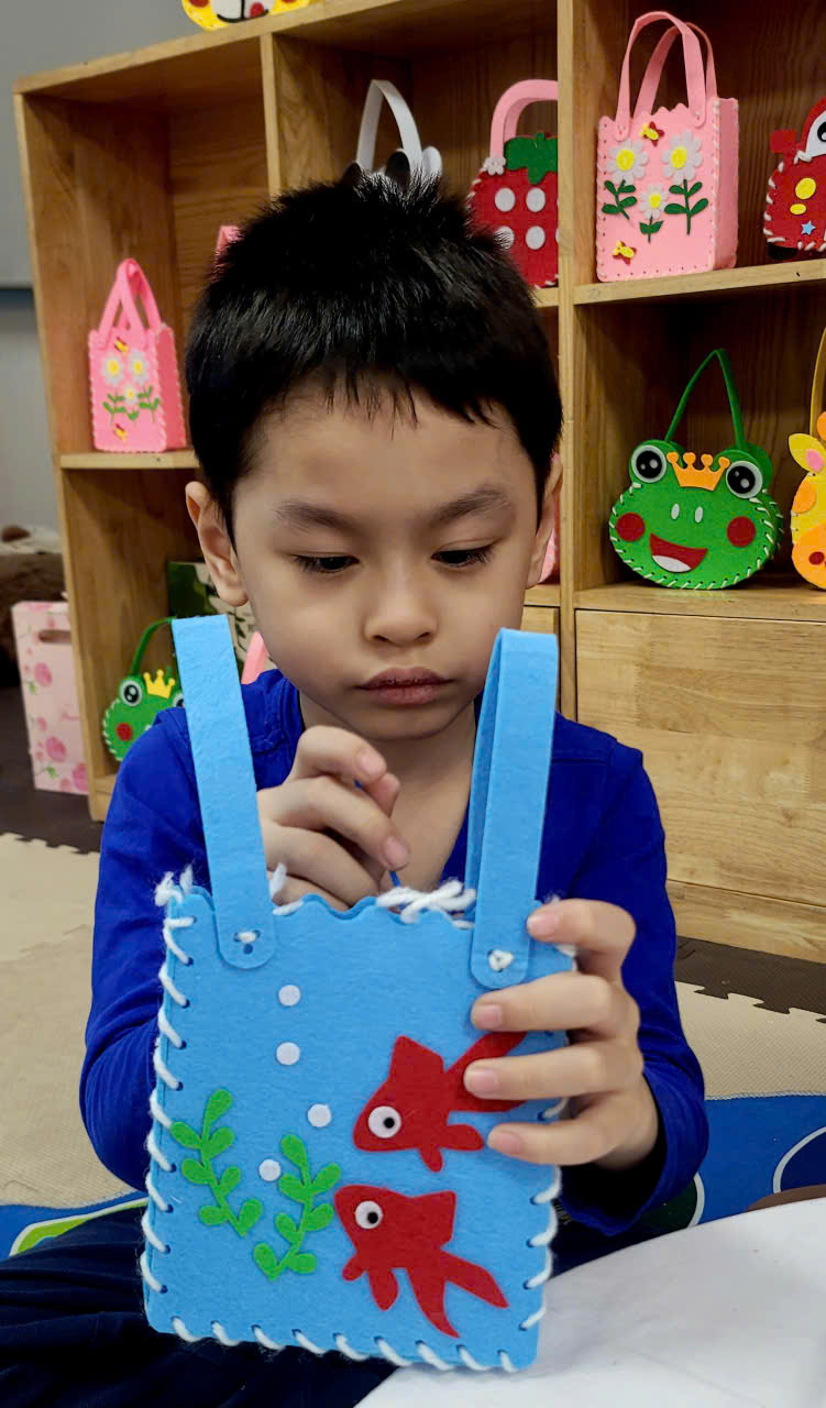 Mỗi mũi khâu tuy còn vụng về nhưng lại chứa đựng biết bao sự cố gắng và niềm tự hào của các con. Sau khi hoàn thành phần khâu, các bạn tiếp tục bóc và dán từng chi tiết trang trí nhỏ để chiếc túi trở nên thật sinh động và mang dấu ấn riêng của mình.