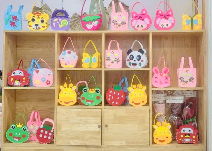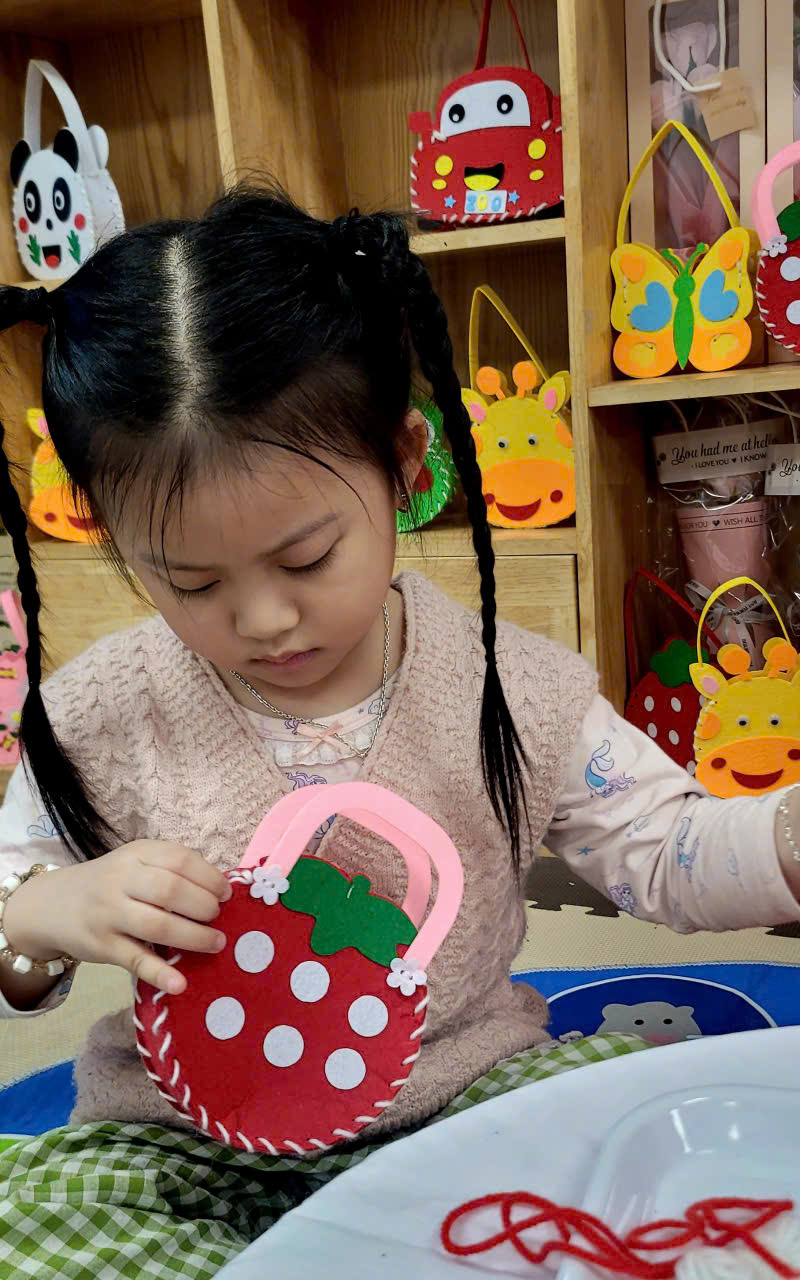 Trên từng chiếc túi nhỏ xinh, các con đã sáng tạo nên những hình ảnh thật đáng yêu: bó hoa yêu thương, chú ếch xanh ngộ nghĩnh, quả dâu tây đỏ mọng, chú mèo đáng yêu, hay chú cá vàng đang tung tăng bơi lội… Mỗi chiếc túi là một ý tưởng riêng, một câu chuyện nhỏ đáng yêu mà các con muốn gửi gắm đến người nhận.