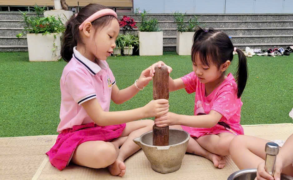 Rộn ràng trải nghiệm – Các bé lớp MGL A4 hào hứng “Giã muối vừng lạc” 🌿💛
